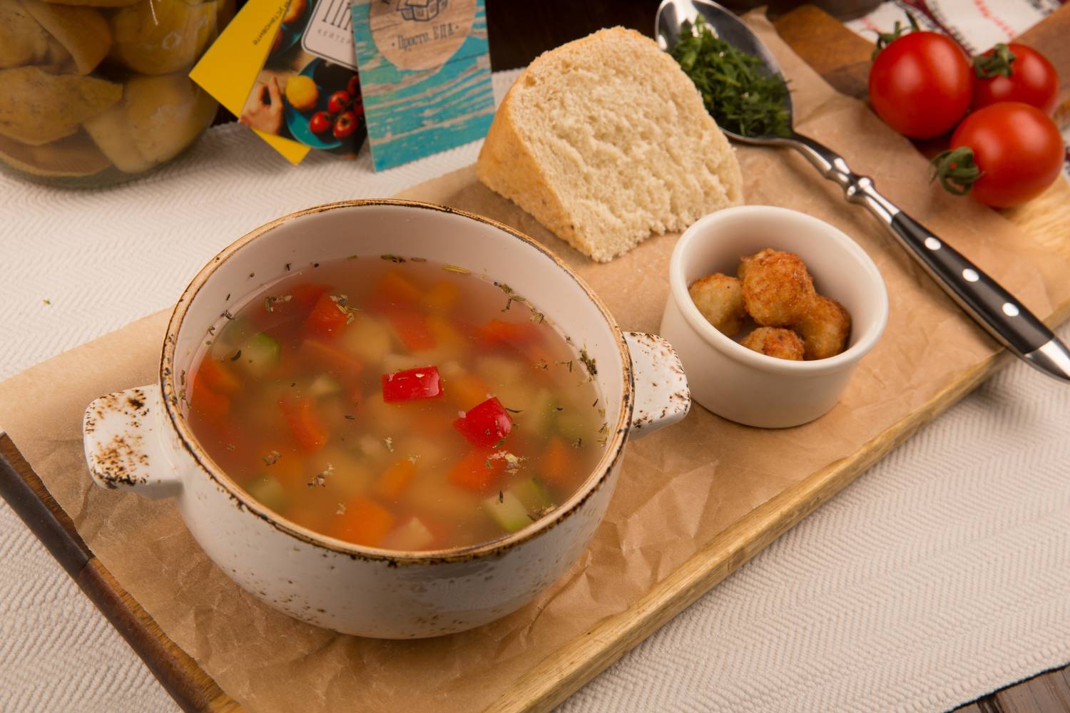 Еда и напитки. В меню — вареники с творогом, картофелем и грибами, пельмени, котлеты с луком, запеченный барашек и традиционные соленья. Из напитков предлагают домашние настойки и морсы. Подача блюд здесь подчеркнуто простая, без изысков, чтобы гости смогли полностью прочувствовать деревенскую обстановку.