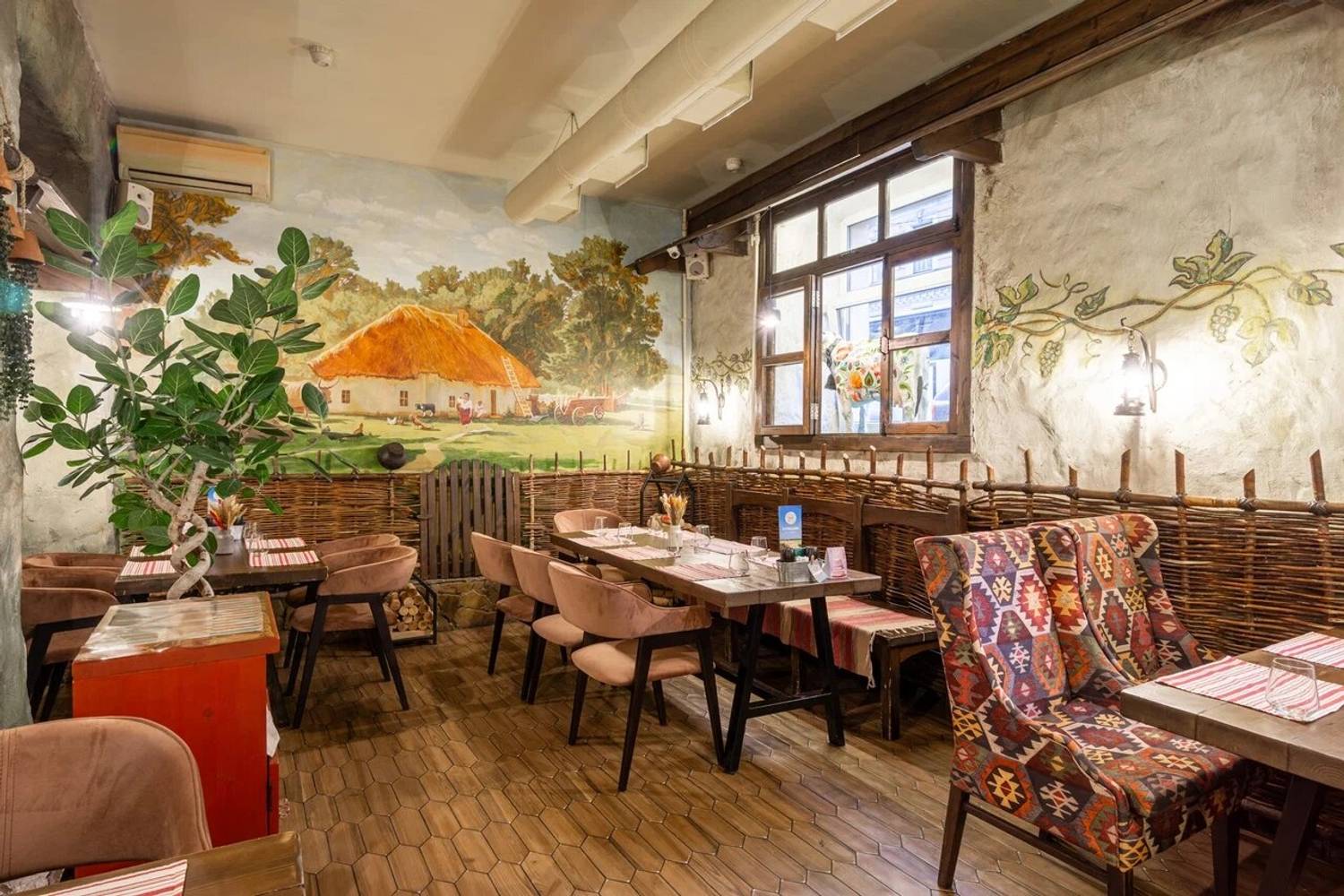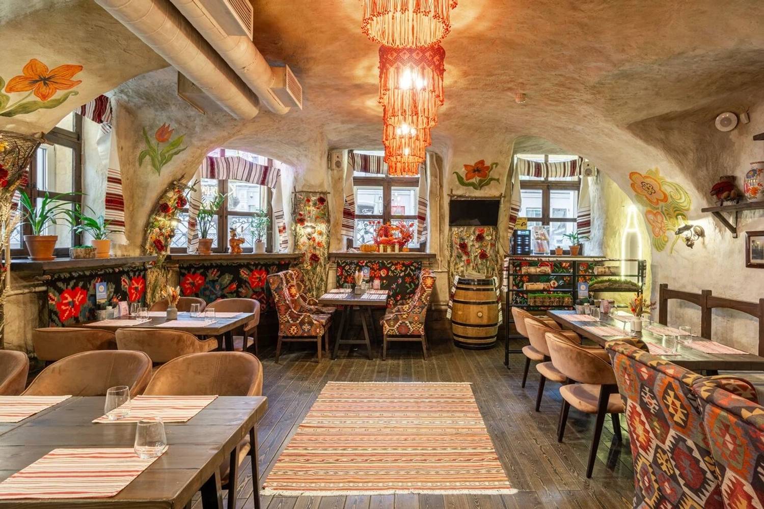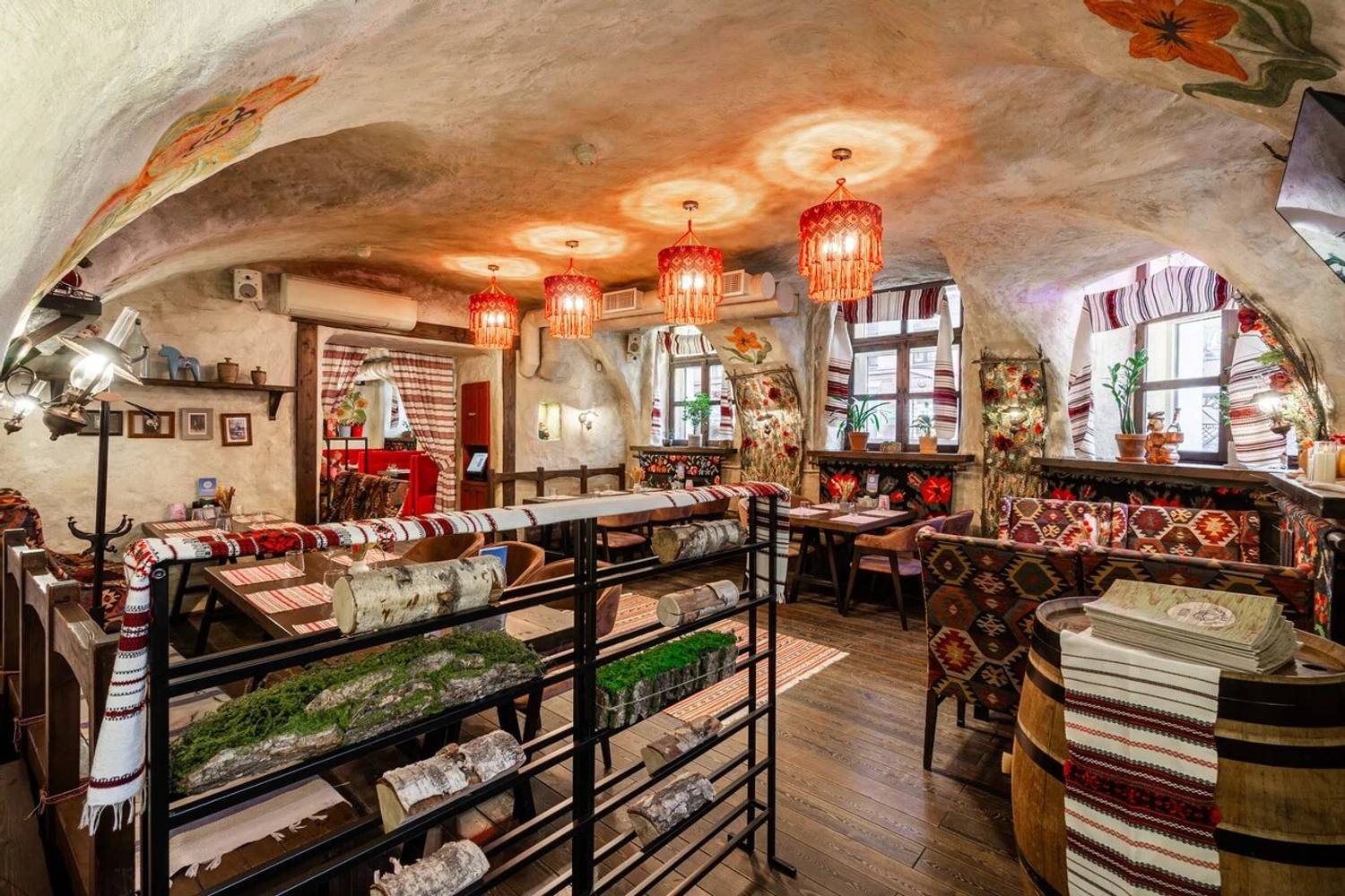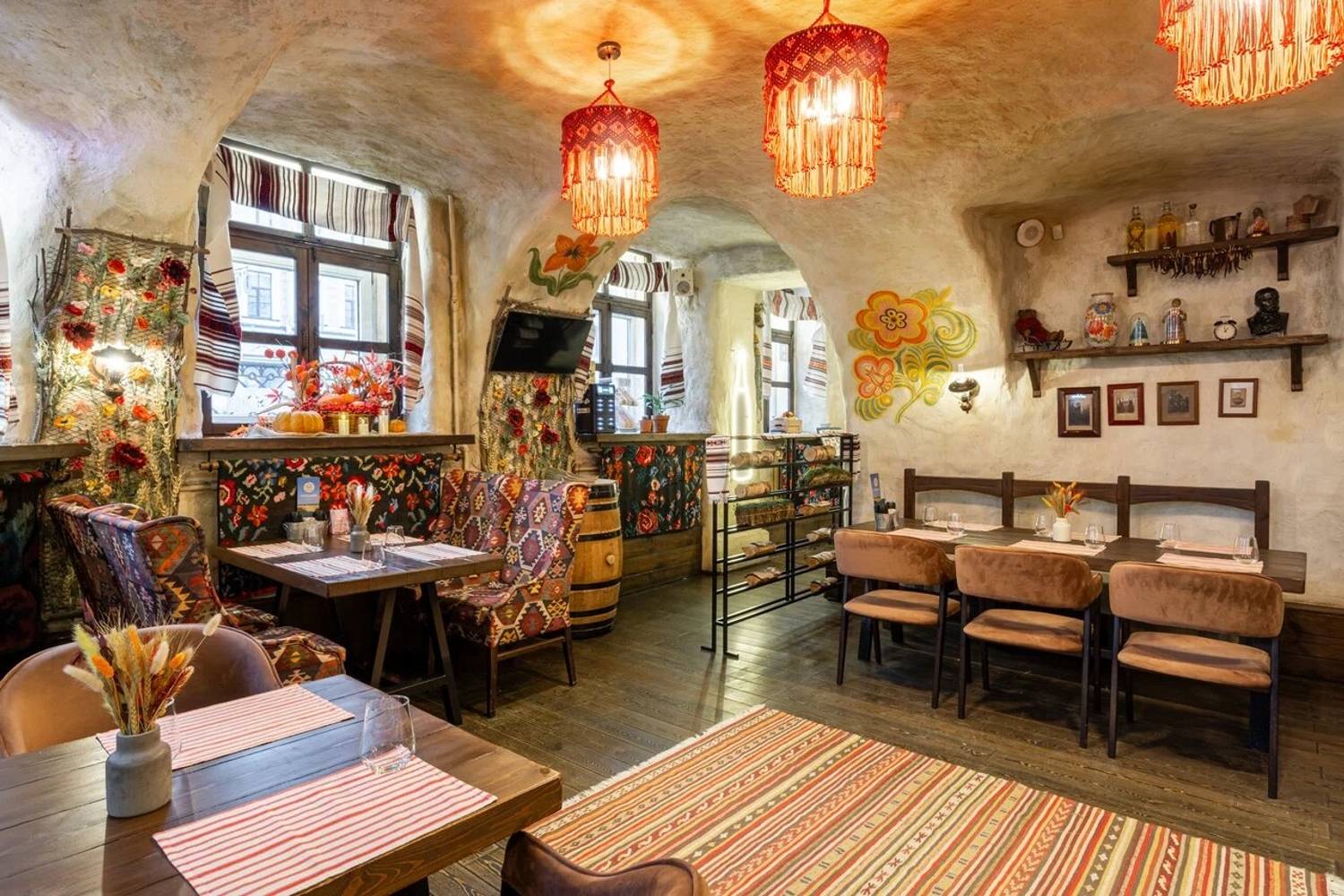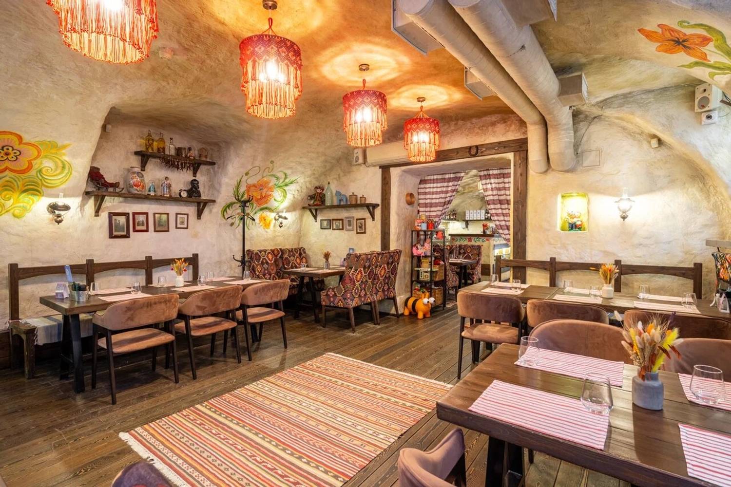 Атмосфера. Пространство разделено на три зала: гостиную с деревянными столами, кухню с работающей печью и уютный внутренний дворик. Национальное телевидение, выступления фольклорных коллективов по выходным и предметы народного быта создают эффект погружения в деревенское застолье. Атмосфера избы-мазанки выдержана буквально в каждом миллиметре: от росписи на стенах до узорчатых диванов, от банок с рассолом до рушников и занавесок.
