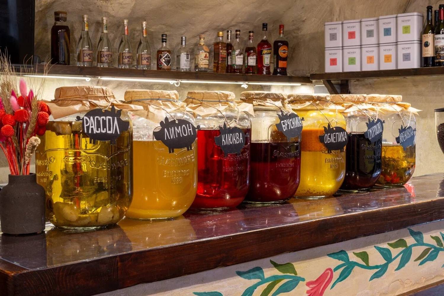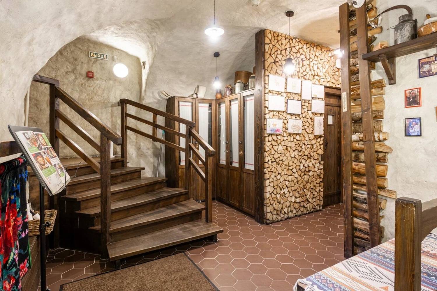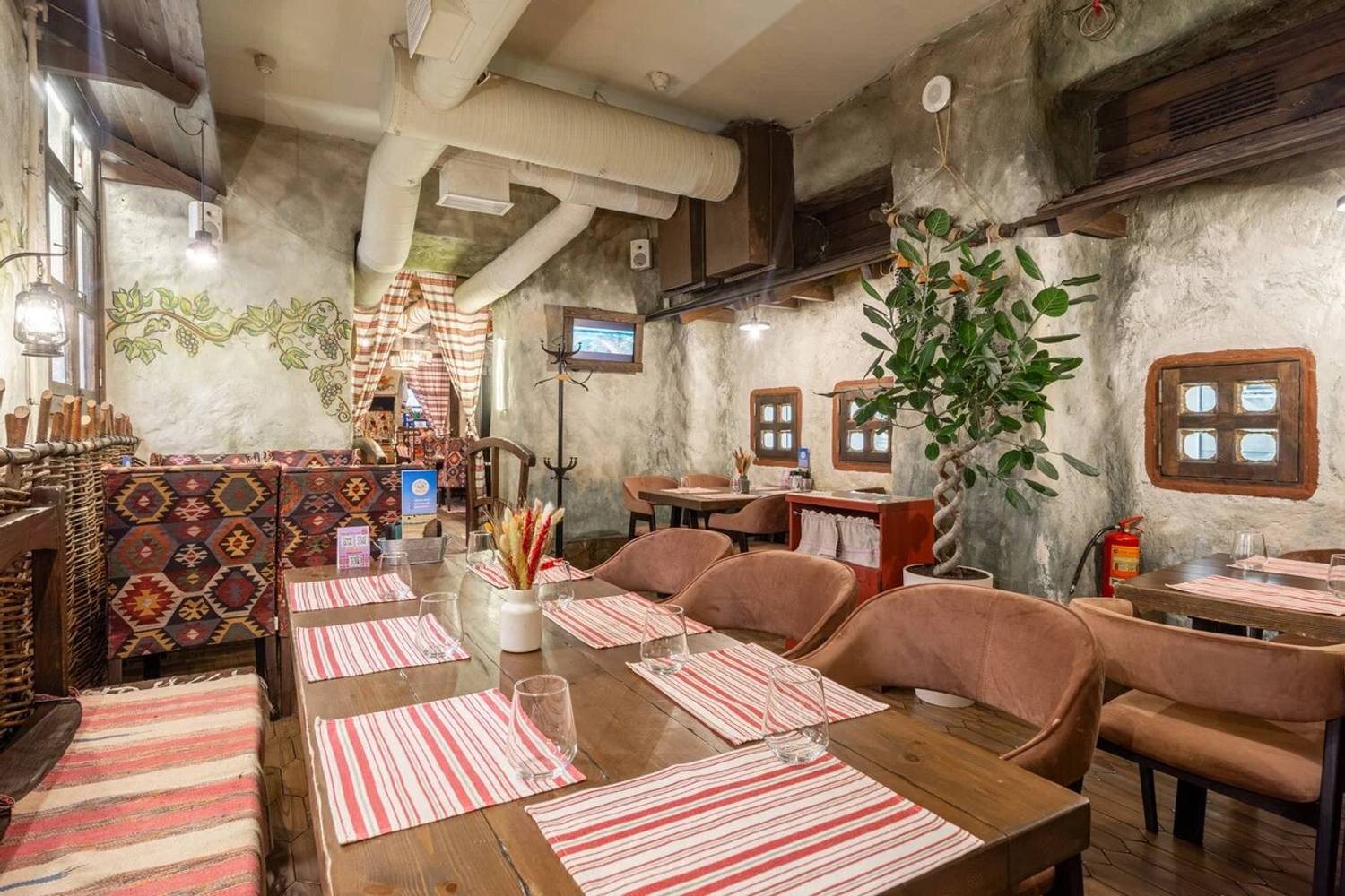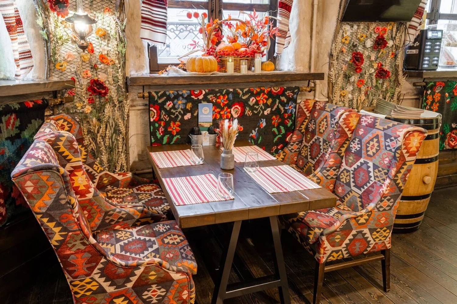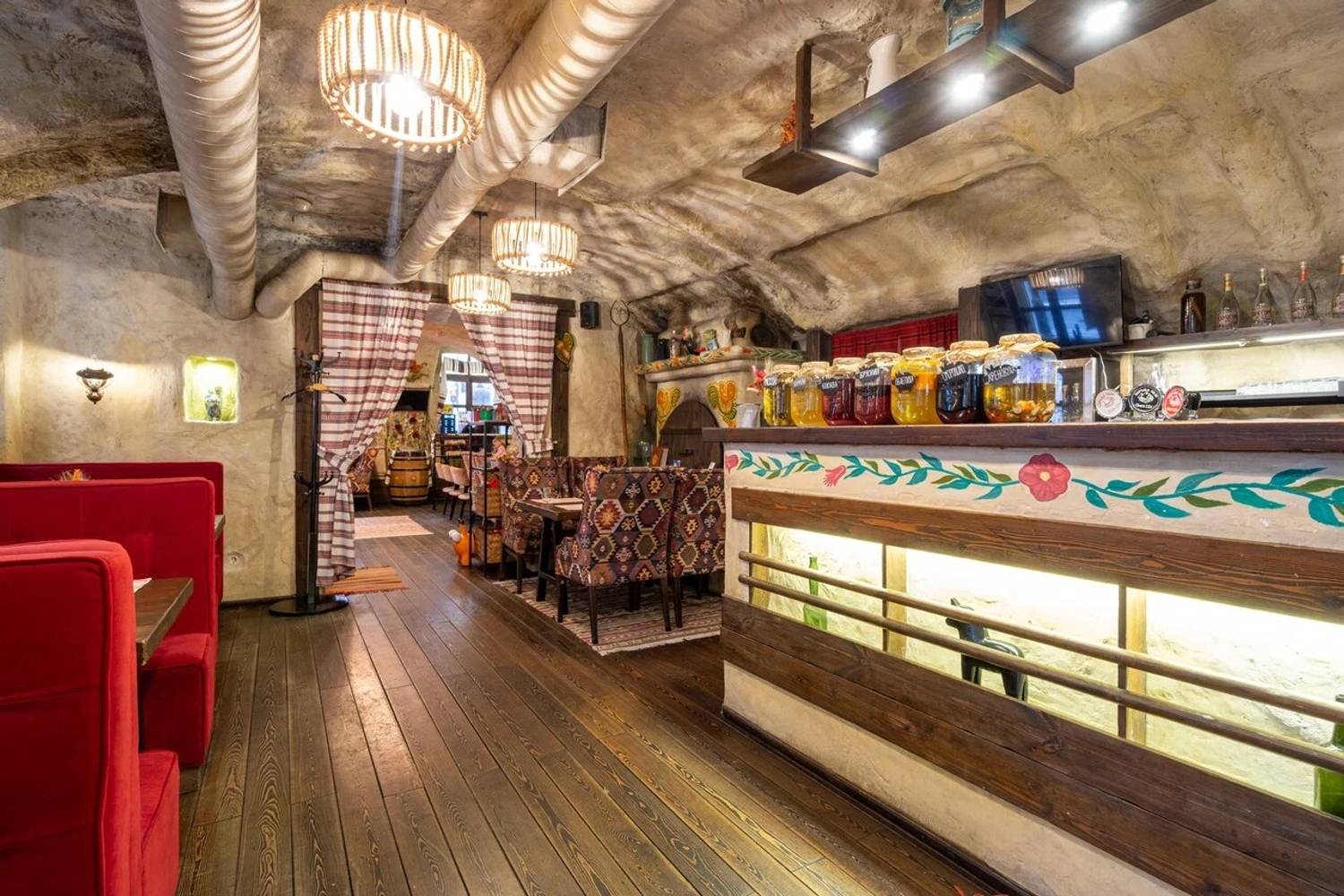 Атмосфера. Пространство разделено на три зала: гостиную с деревянными столами, кухню с работающей печью и уютный внутренний дворик. Национальное телевидение, выступления фольклорных коллективов по выходным и предметы народного быта создают эффект погружения в деревенское застолье. Атмосфера избы-мазанки выдержана буквально в каждом миллиметре: от росписи на стенах до узорчатых диванов, от банок с рассолом до рушников и занавесок.