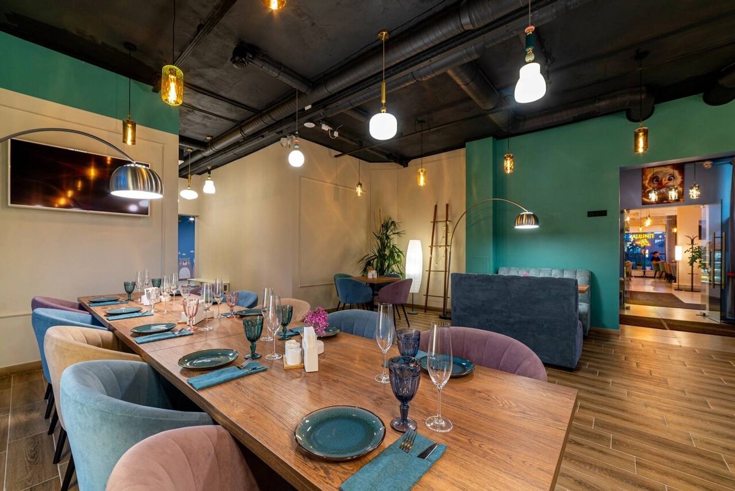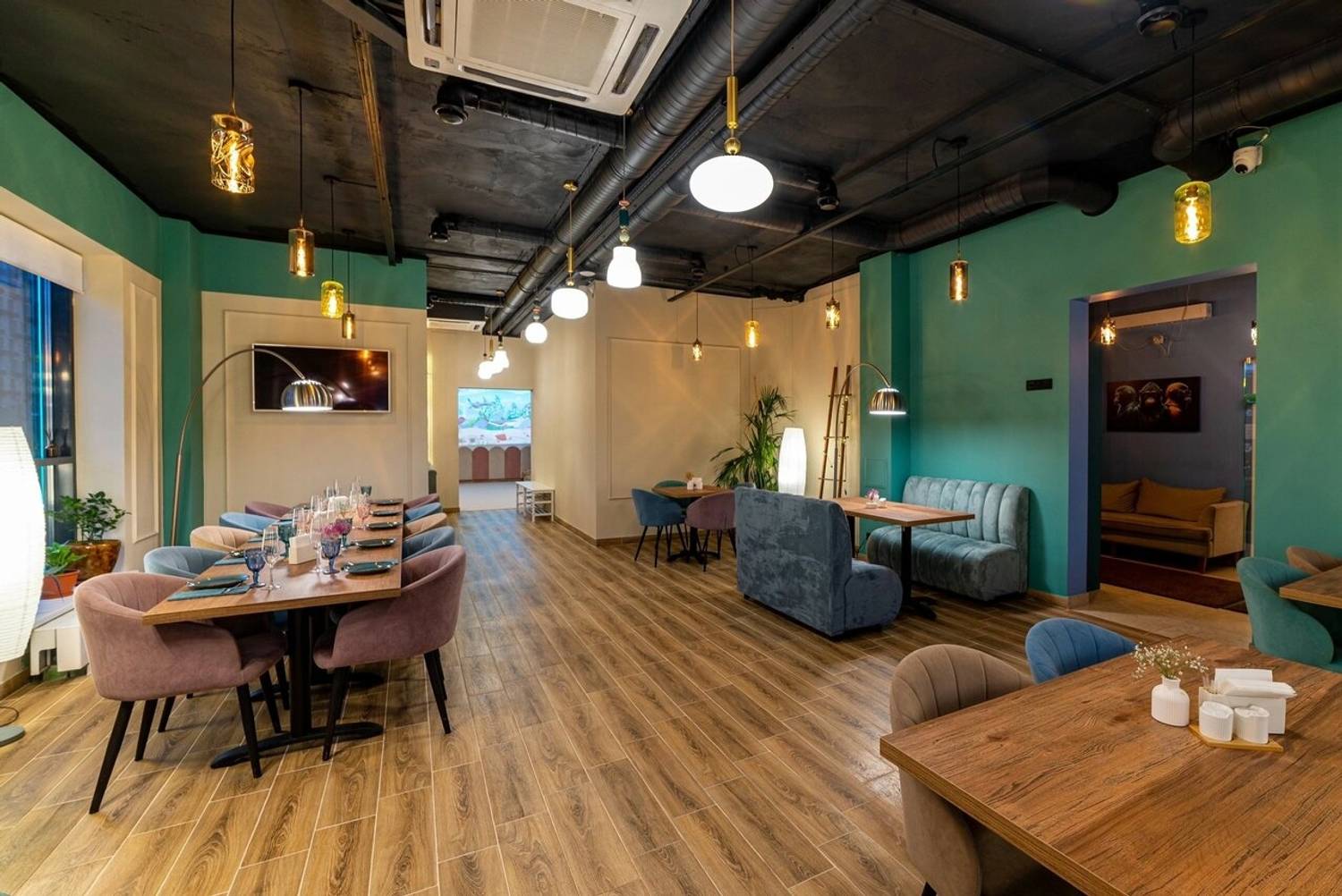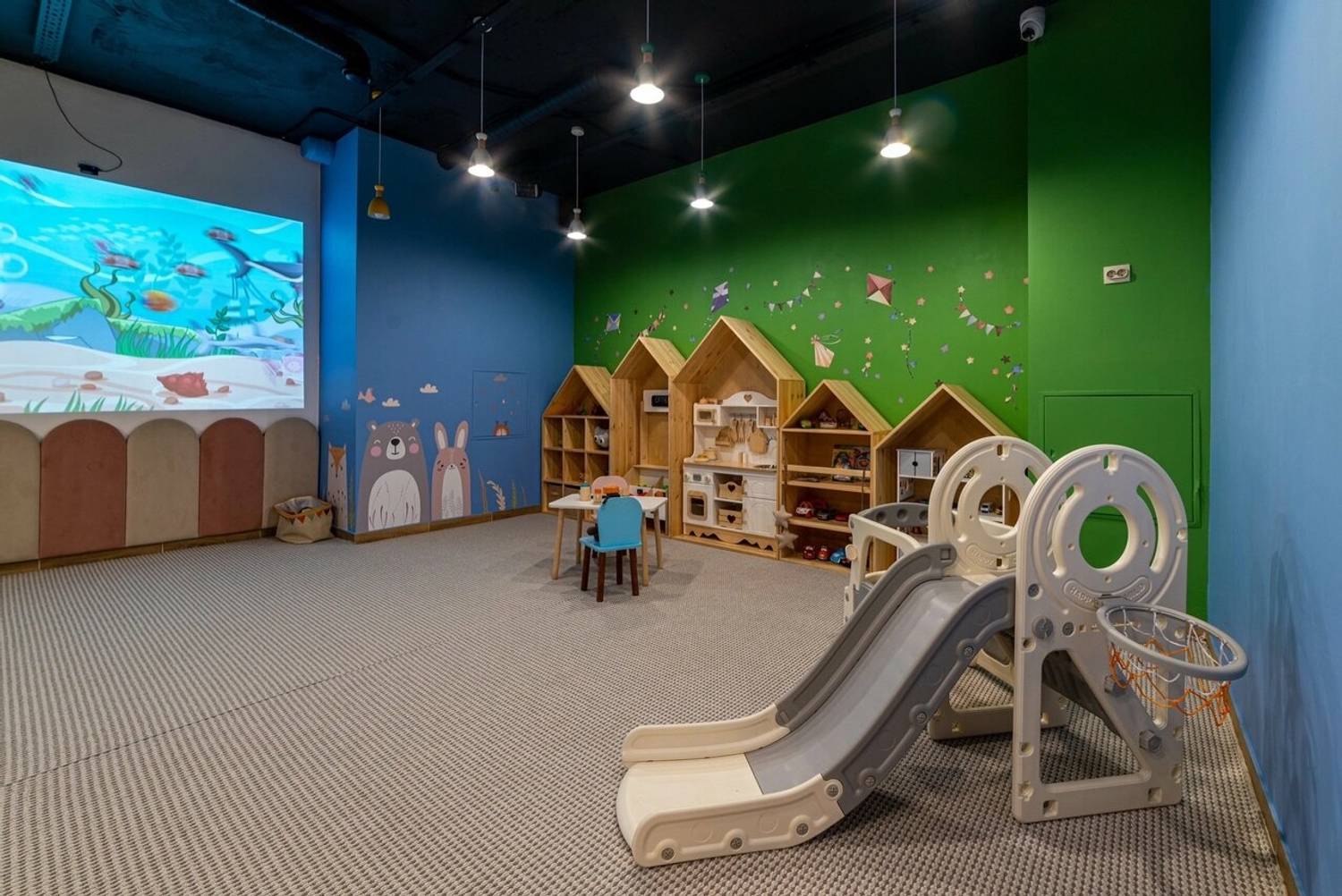 Атмосфера. Пространство разделено на две основные зоны: яркую игровую с двухуровневым лабиринтом, батутами, скалодромом и бассейном с шарами, и спокойную обеденную часть. Нейтральная цветовая гамма в розово-бирюзово-серых тонах и продуманная планировка создают баланс между активным отдыхом и возможностью расслабиться. Здесь часто проводят праздники и детские дни рождения: есть возможность вызвать аниматора, устроить мини-диско или просто предоставить детям полную свободу в игровой зоне.