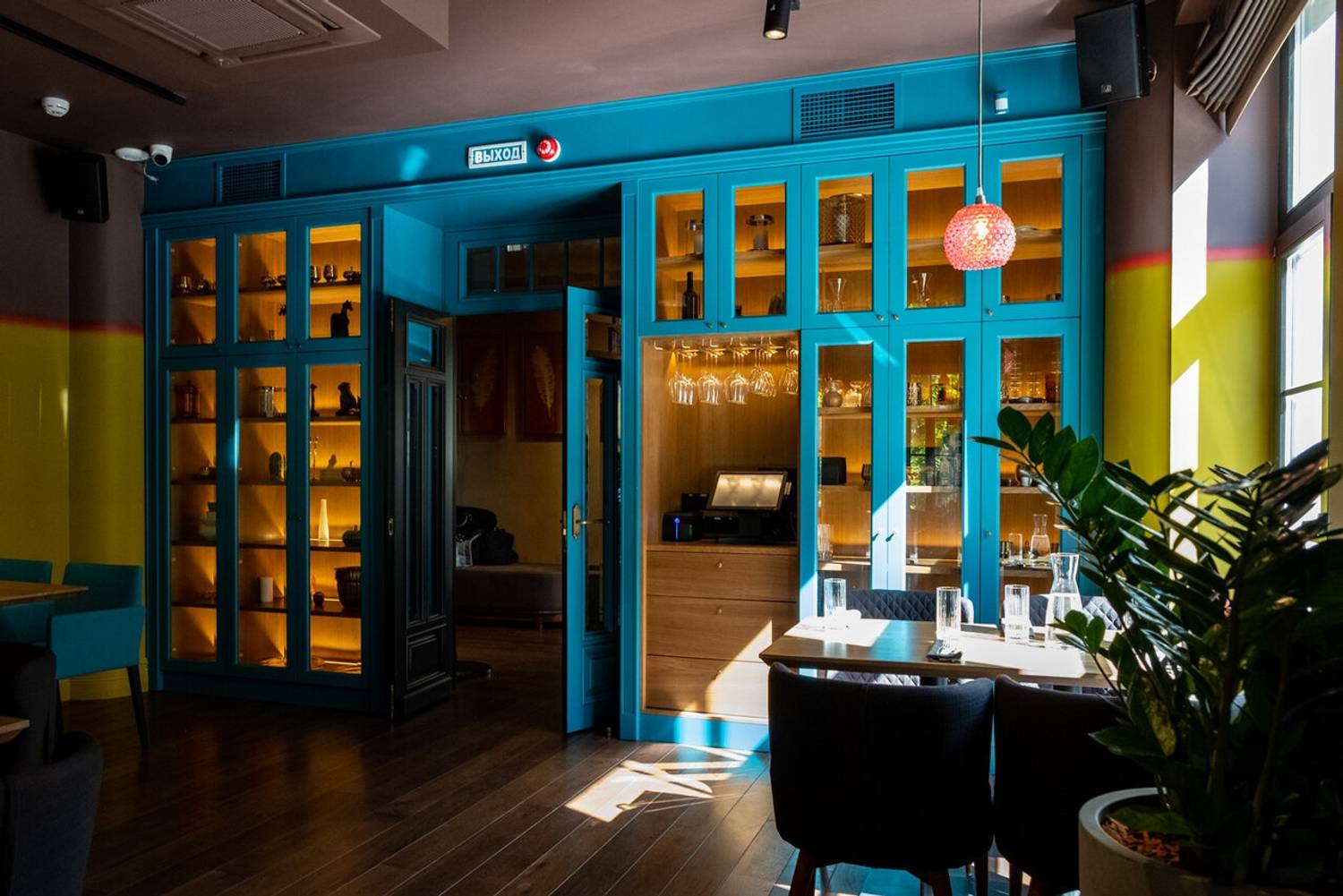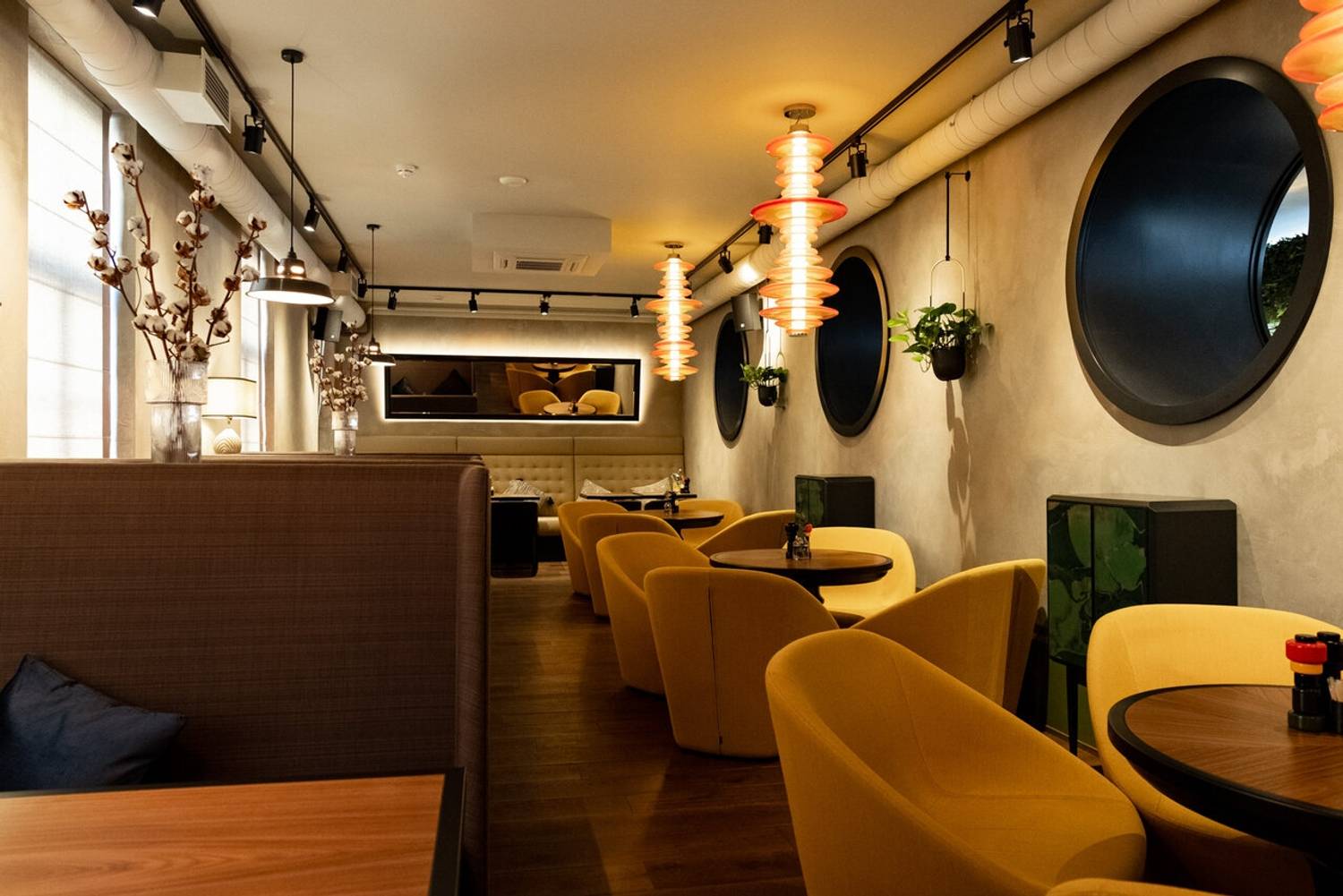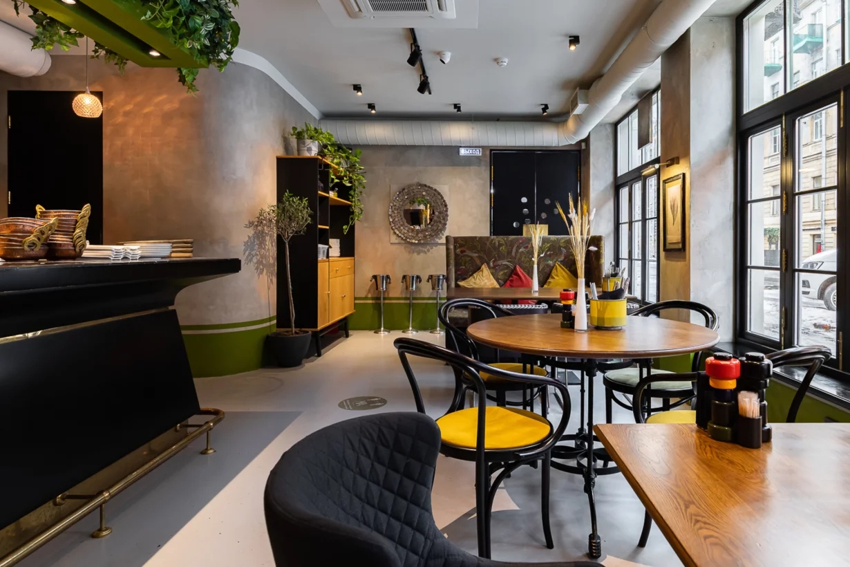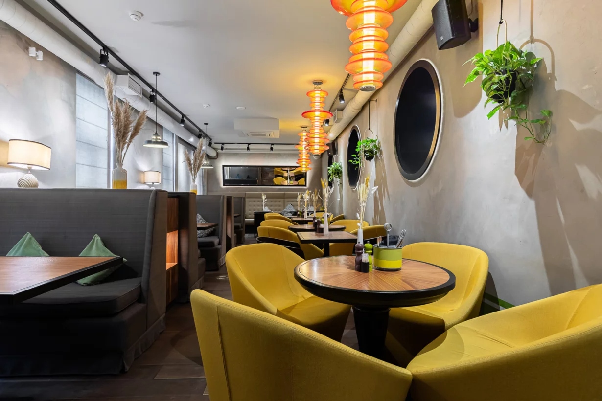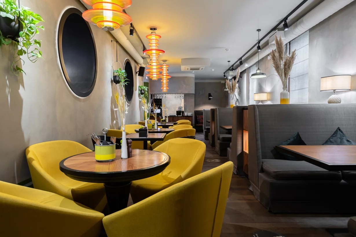 Атмосфера. Пространство разделено на два помещения: большой светлый зал с панорамными окнами и открытой кухней и камерную зону с мягкими диванами и креслами в ярко-желтых тонах. Дизайнерские светильники-мотыльки и зеркала в резных рамах создают стиль, который одновременно отдает дань как современности, так и традиционным мотивам. Есть также отдельная гостиная, которая подходит для банкетов и частных мероприятий.