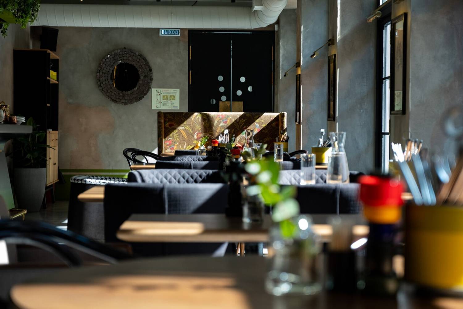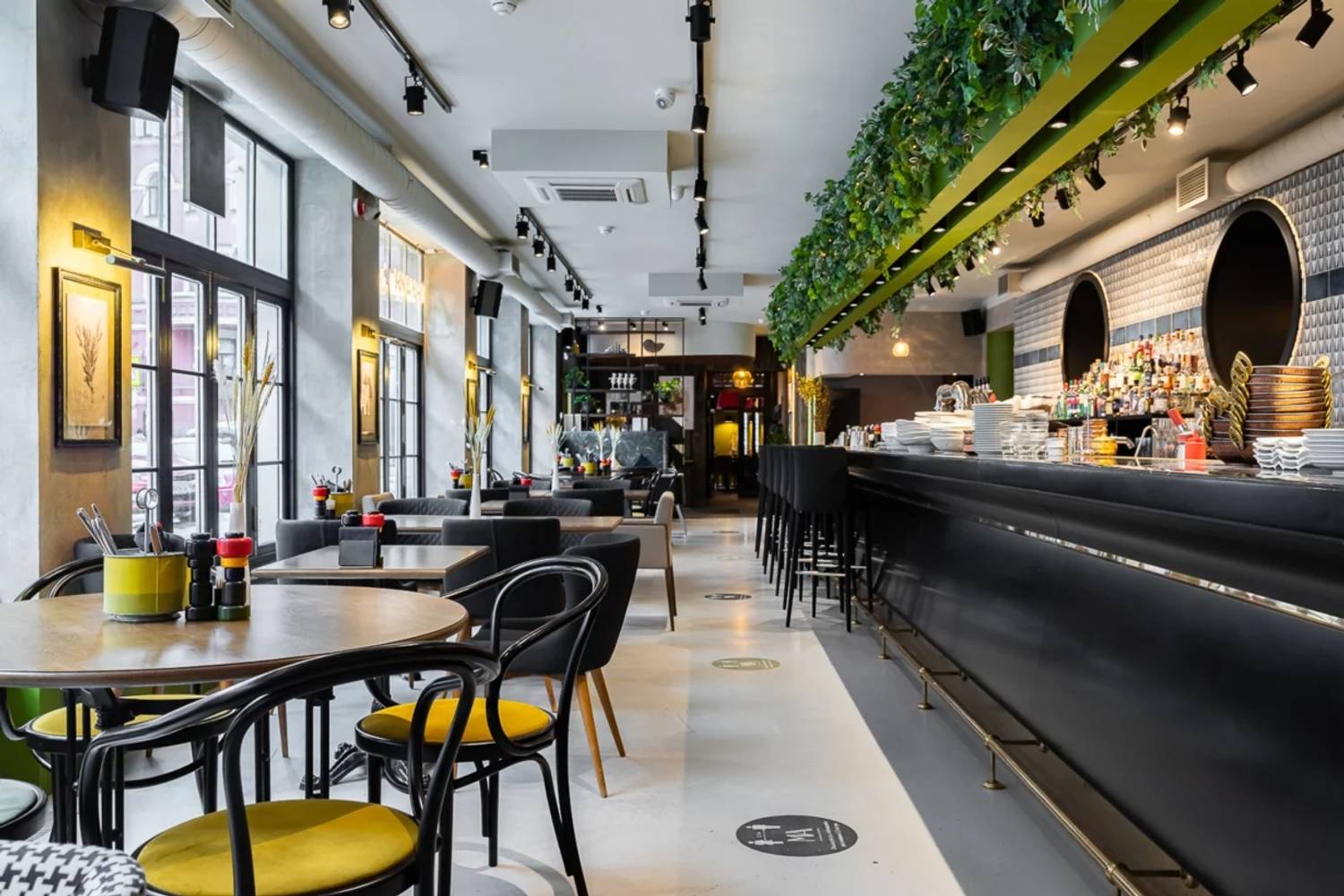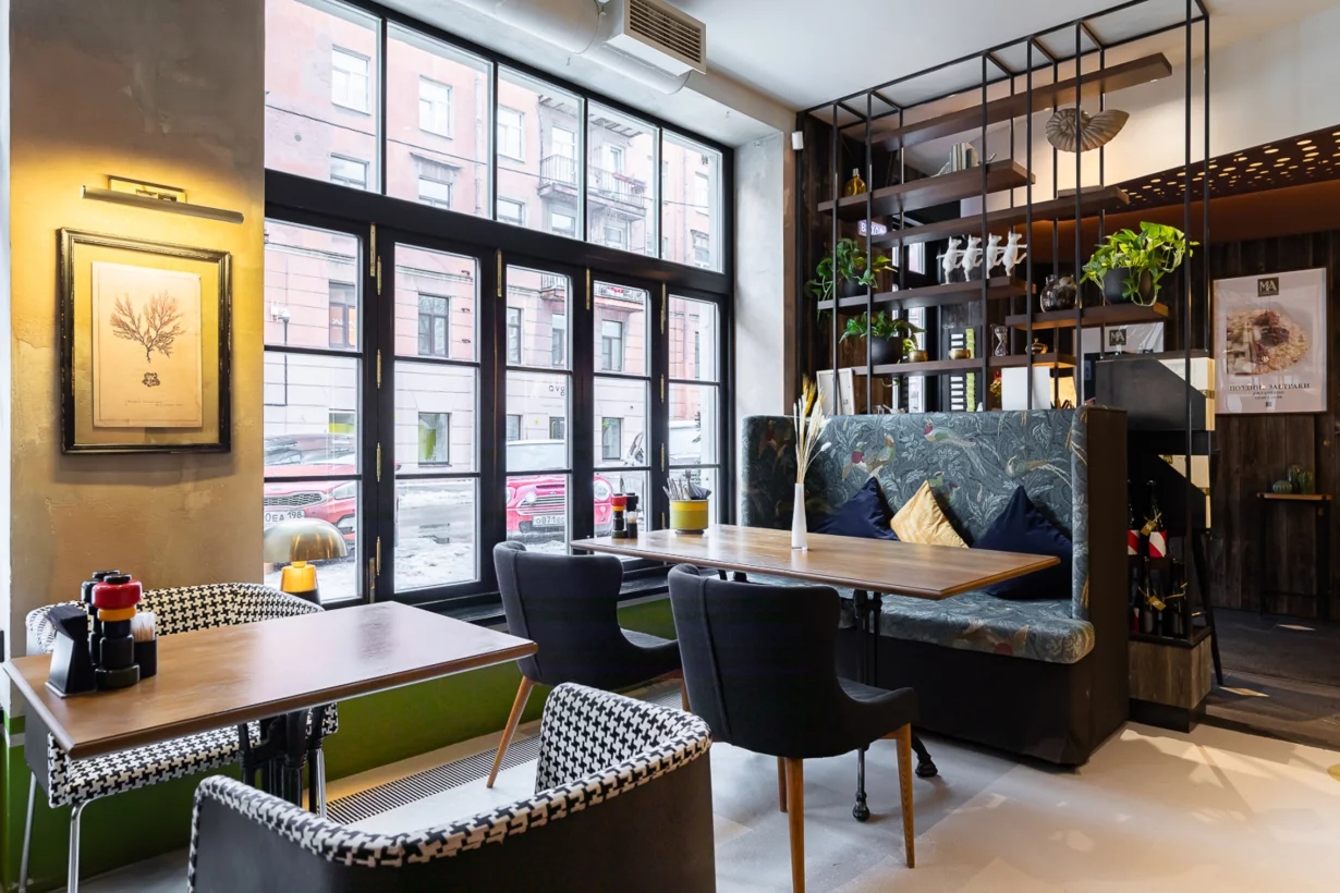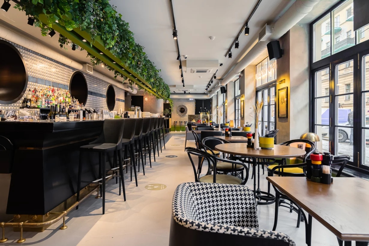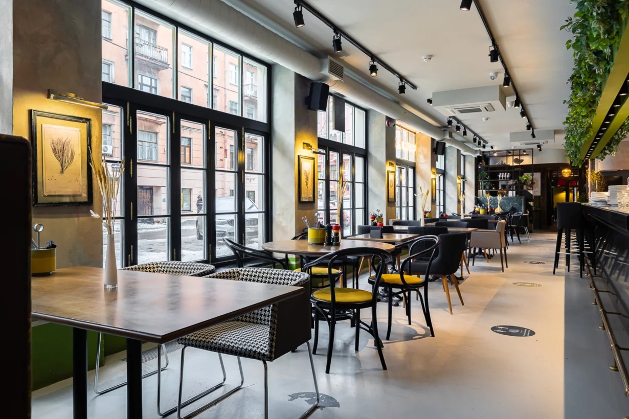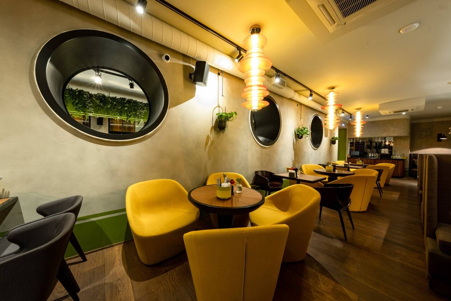 Атмосфера. Пространство разделено на два помещения: большой светлый зал с панорамными окнами и открытой кухней и камерную зону с мягкими диванами и креслами в ярко-желтых тонах. Дизайнерские светильники-мотыльки и зеркала в резных рамах создают стиль, который одновременно отдает дань как современности, так и традиционным мотивам. Есть также отдельная гостиная, которая подходит для банкетов и частных мероприятий.