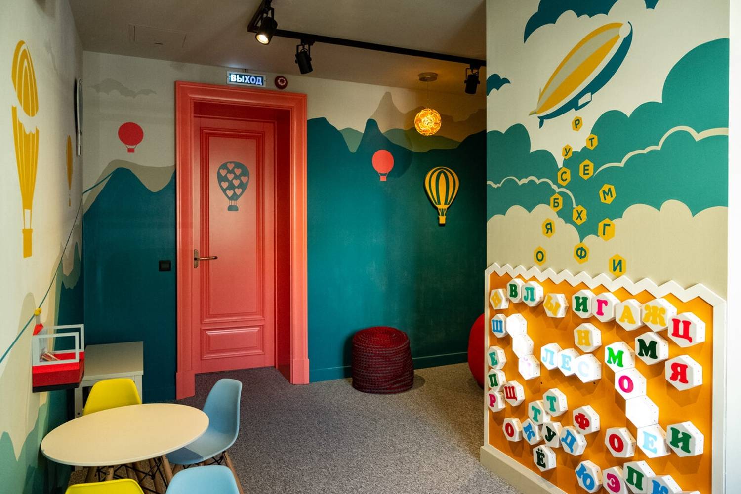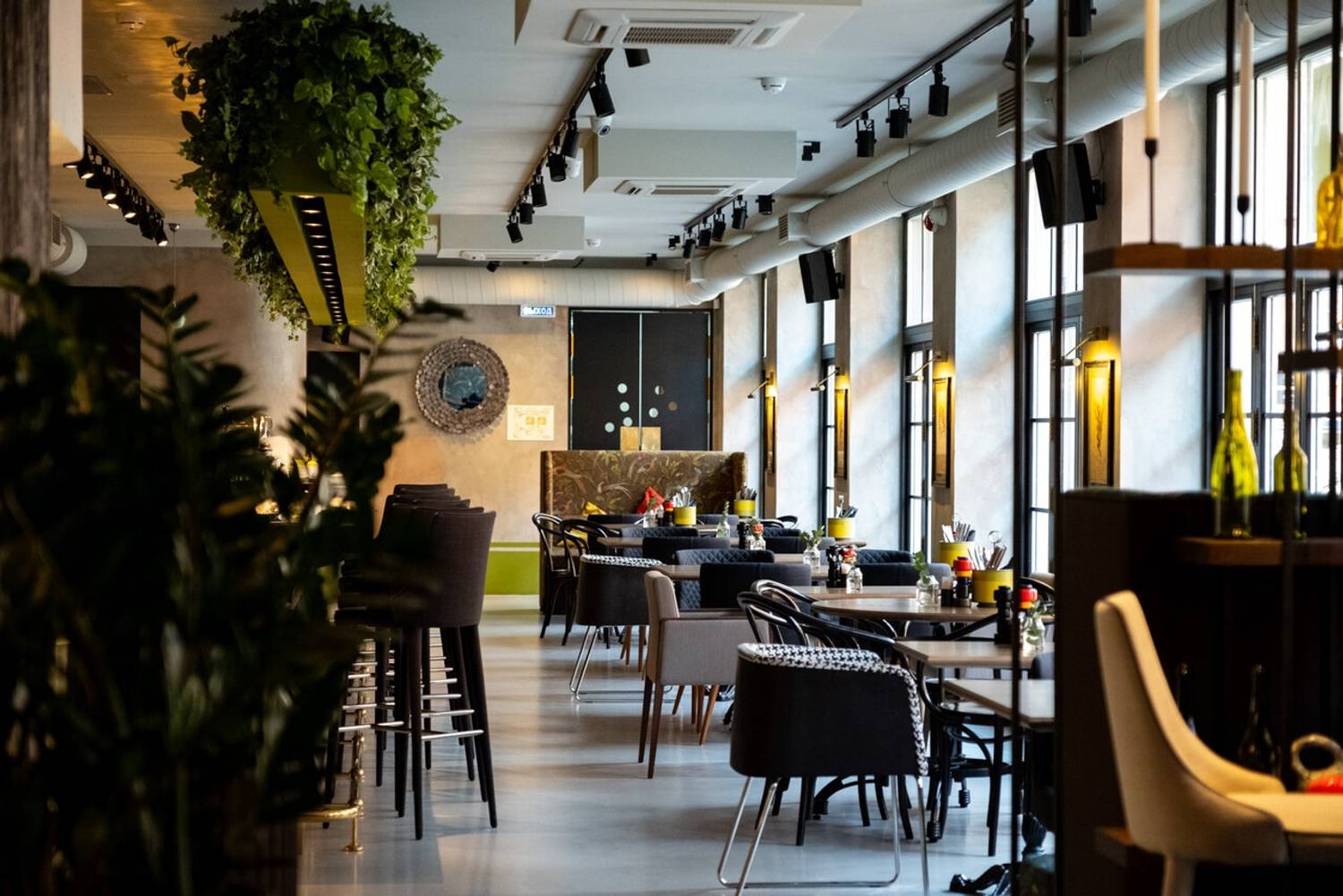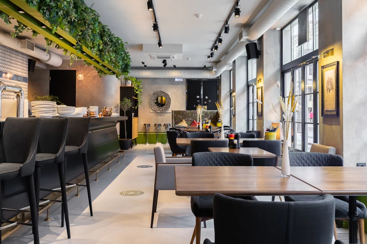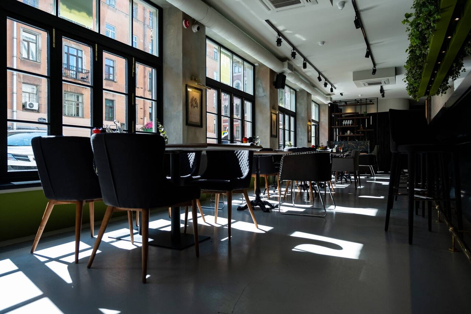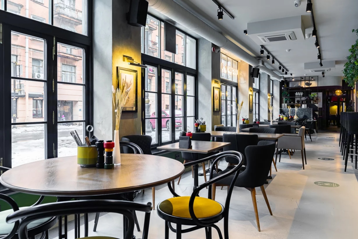 Атмосфера. Пространство разделено на два помещения: большой светлый зал с панорамными окнами и открытой кухней и камерную зону с мягкими диванами и креслами в ярко-желтых тонах. Дизайнерские светильники-мотыльки и зеркала в резных рамах создают стиль, который одновременно отдает дань как современности, так и традиционным мотивам. Есть также отдельная гостиная, которая подходит для банкетов и частных мероприятий.