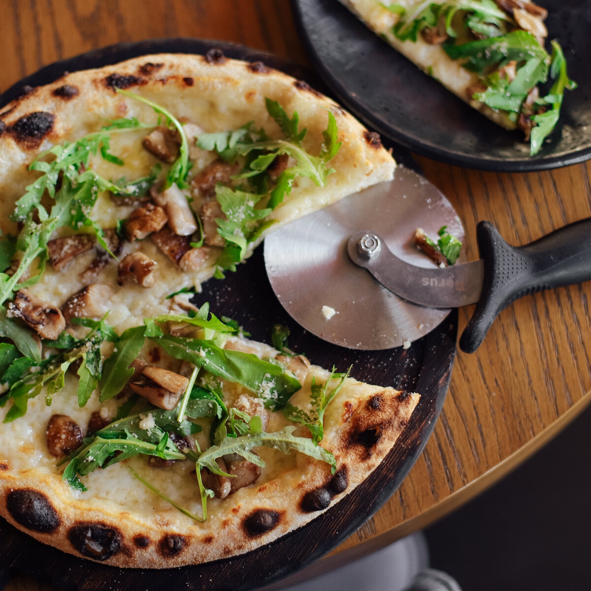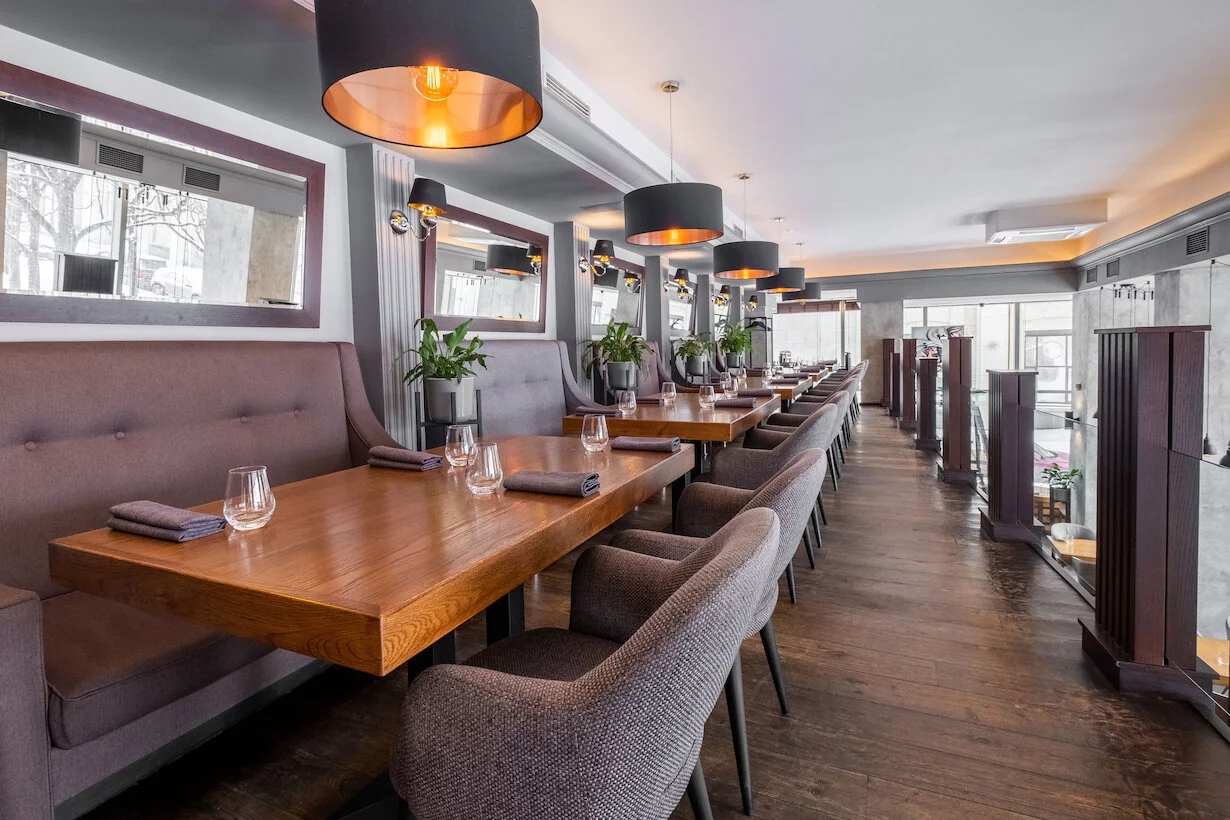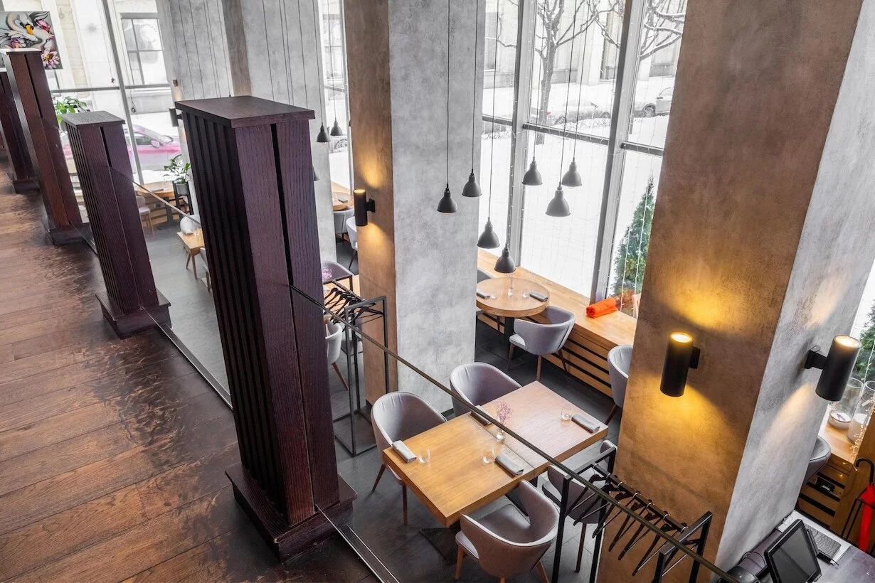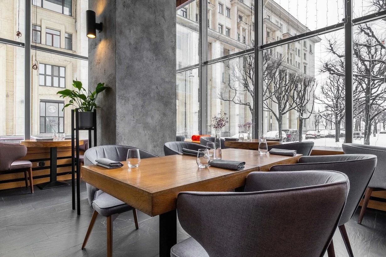 Атмосфера. Двухъярусное пространство в минималистичном стиле с дымчато-серой палитрой, натуральным камнем и деревом выглядит сдержанно, но здесь нашлось место и ярким акцентам. Нежно-желтые подушки на диванах, живые растения и светильники с теплым светом делают заведение более уютным, добавляют тепла в интерьер и оттеняют бетонные колонны. Панорамные окна открывают вид на Петровскую набережную и Домик Петра I, а летняя терраса и игровая комната для детей делают ресторан подходящим и для посиделок на открытом воздухе, и для посещений всей семьей.