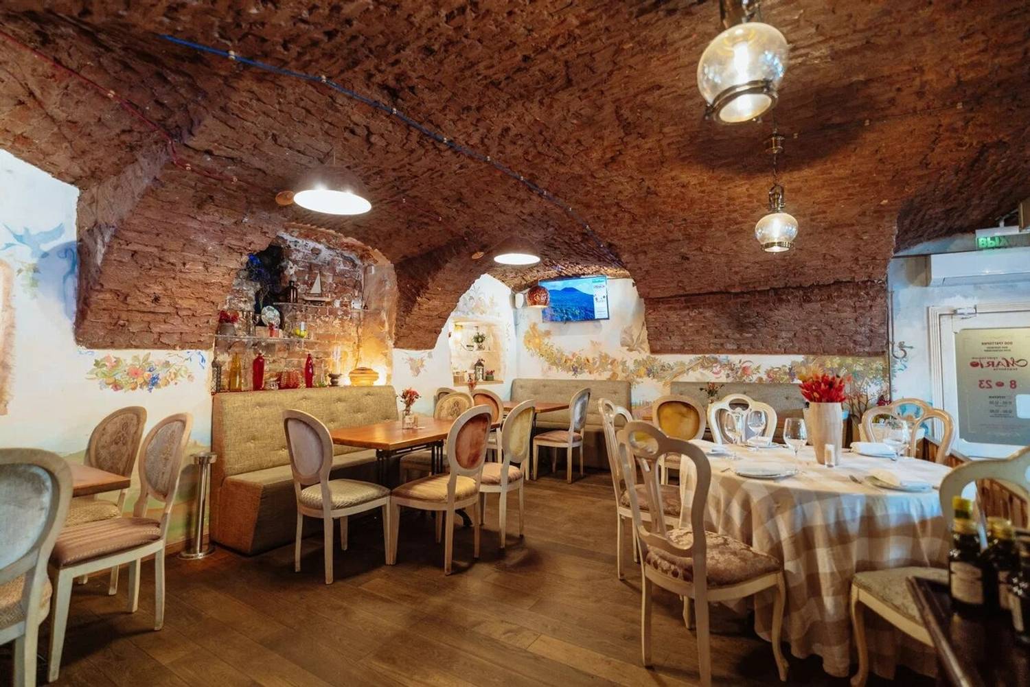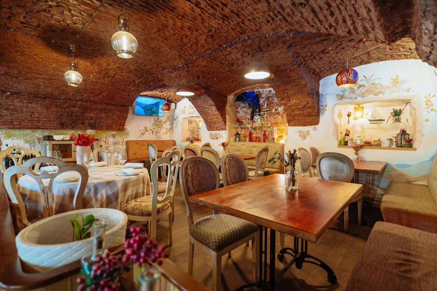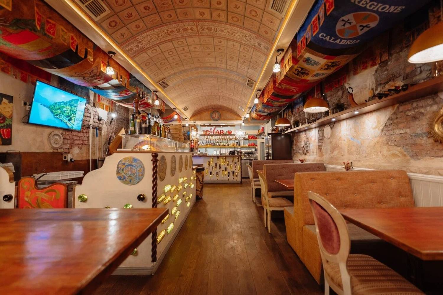 В нашем ресторане атмосфера Италии начинается с самой кухни: в зале стоит подлинная помпейская печь из Неаполя, а шоу-подача пасты происходит прямо внутри головы элитного пармезана, что не только удивляет гостей, но и дарит им истинный вкус Италии. Наш интерьер переносит гостей в древнюю Италию: расписанные стены, арочные кирпичные потолки, детали из натурального дерева и керамики, винные бочки и светильники создают атмосферу уютной траттории, где каждый элемент напоминает о классических итальянских вкусах и традициях, а ощущение тепла и аутентичности дополняется живой зеленью и мягкой мебелью.