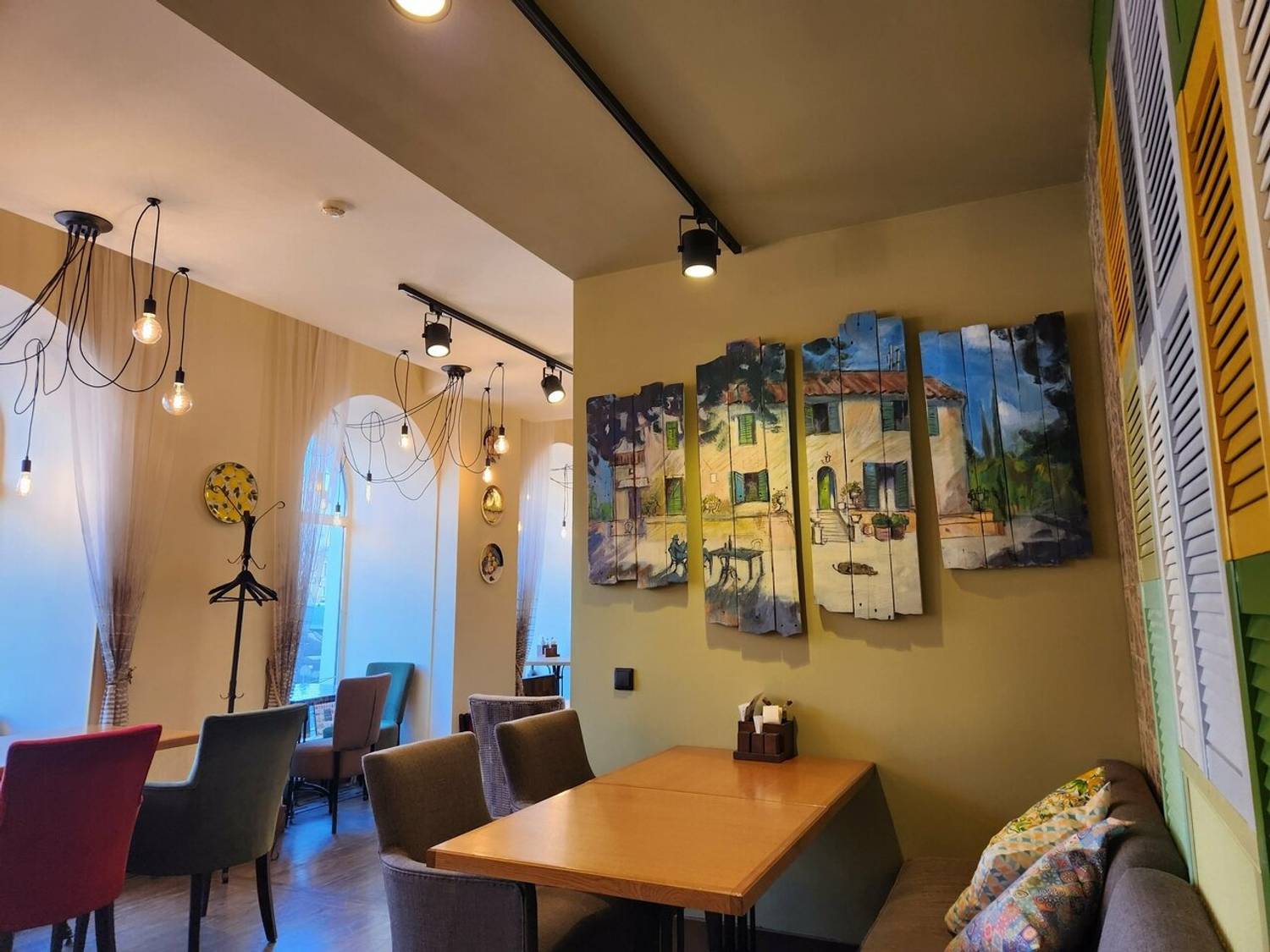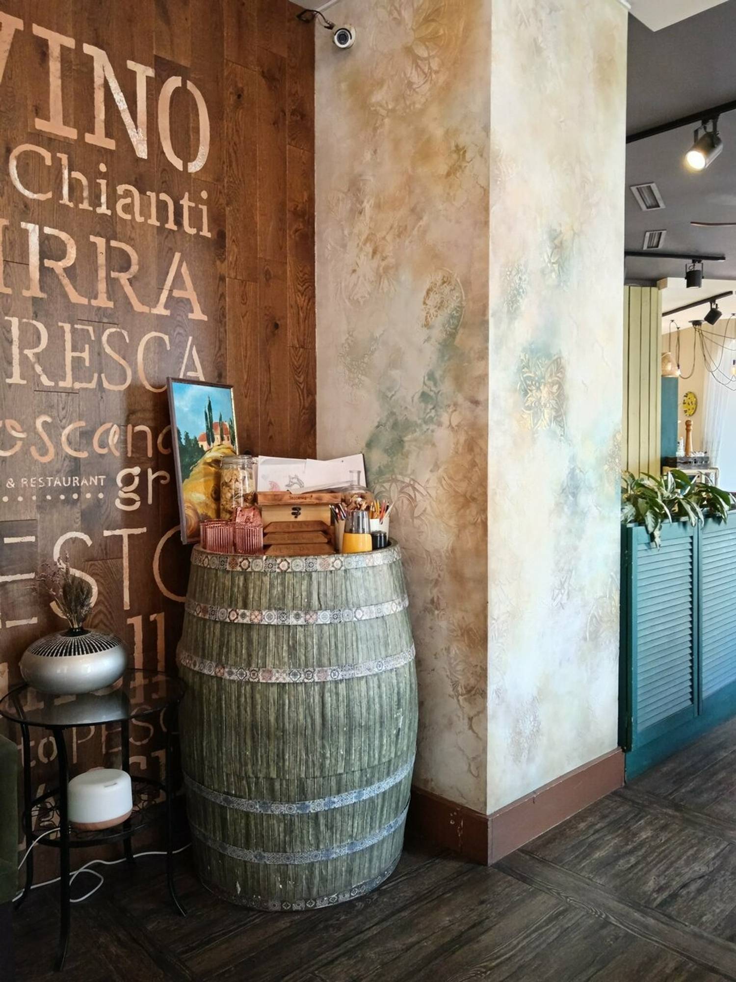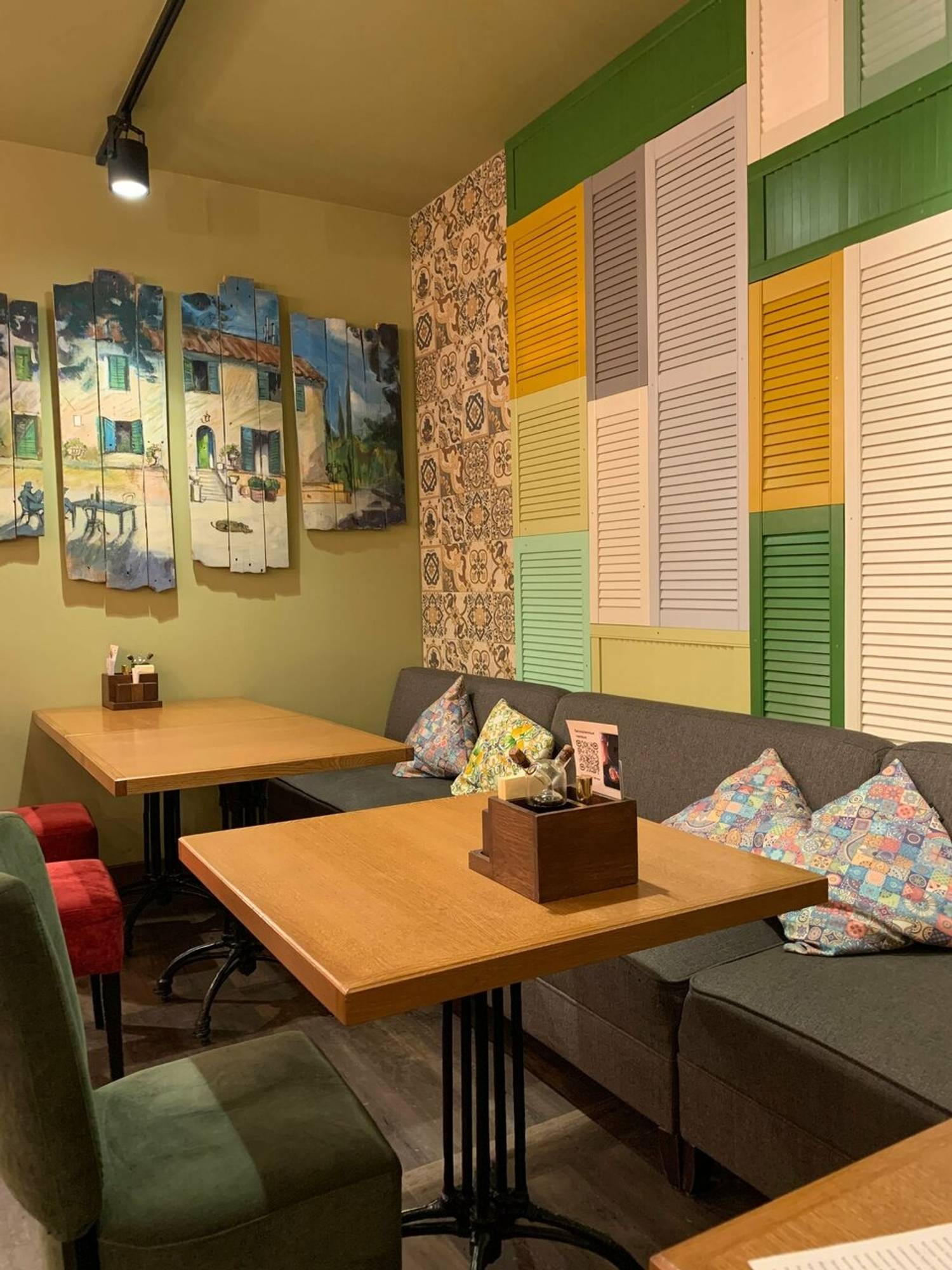 Атмосфера. Интерьер наполнен средиземноморскими акцентами: бежевые стены, декоративная стена с тарелками в традиционных орнаментах и панно с изображением итальянских городов. Разноцветные кресла и яркие декоративные подушки добавляют колорита. Здесь можно не только заказать итальянские блюда, но и отправиться в путешествие прямо за обедом. В ресторане подготовили бесплатные аудиоэкскурсии о Петербурге, которые сделают трапезу только вкусной, но и познавательной.