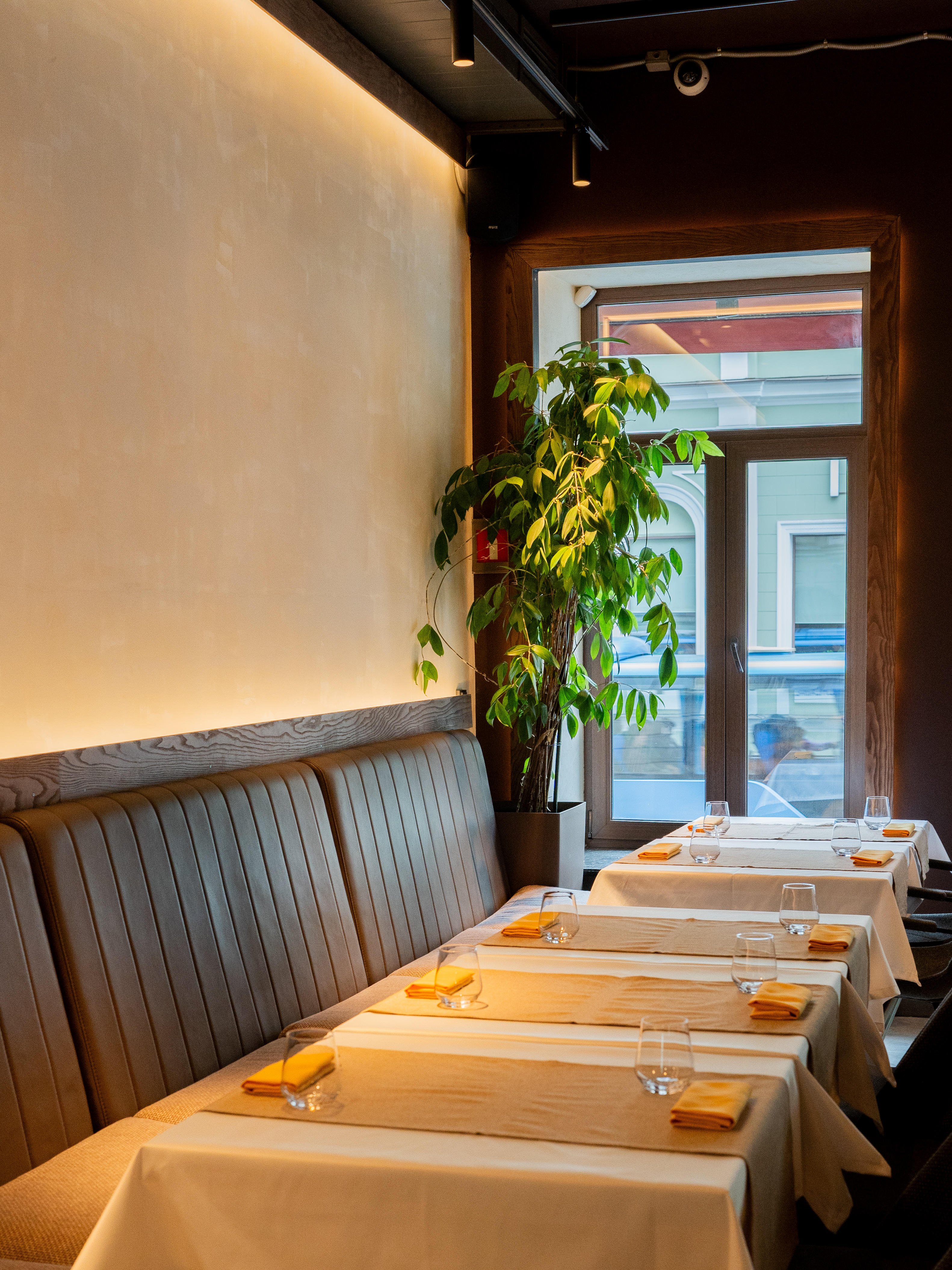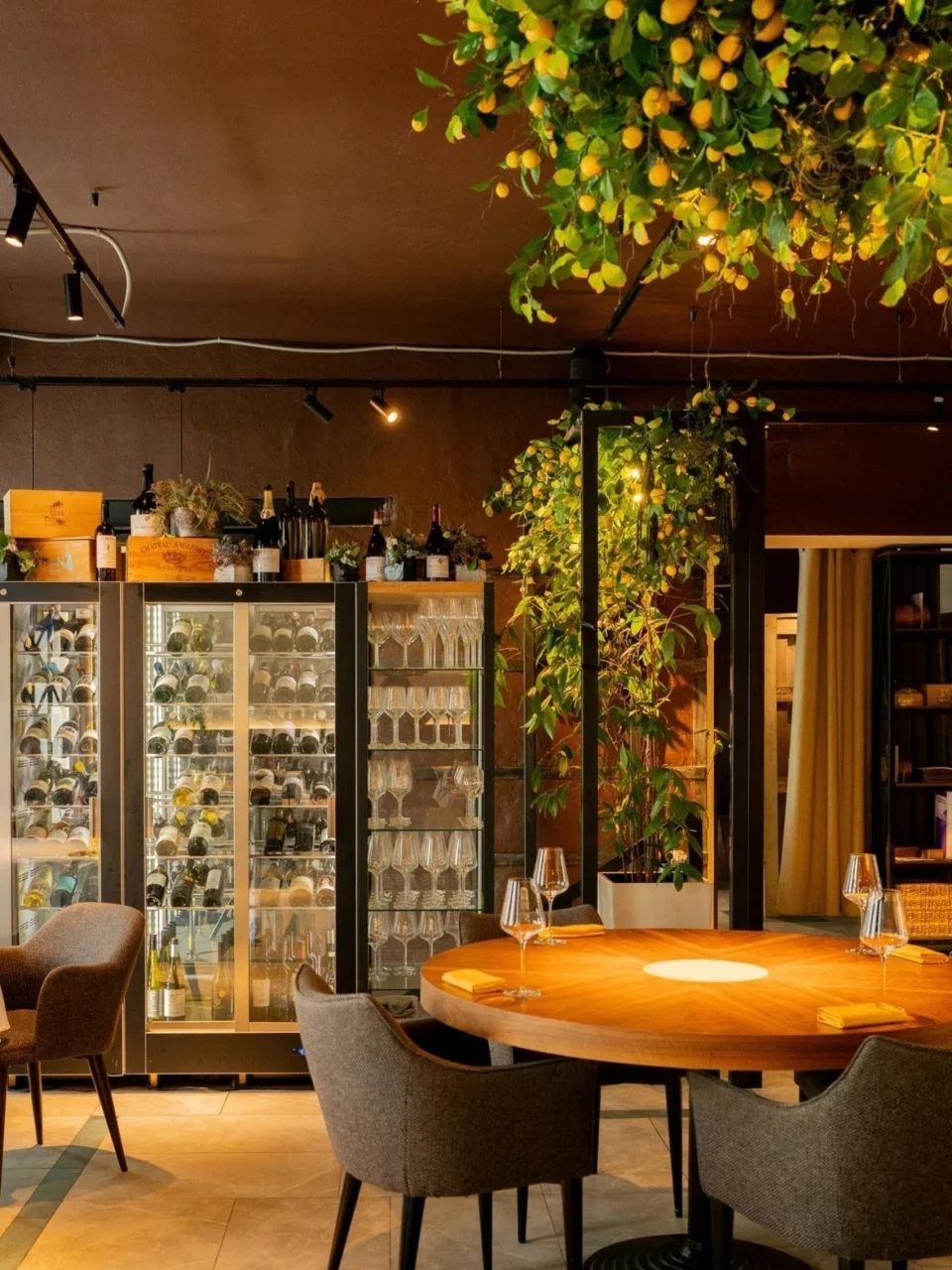 Атмосфера. Пространство напоминает гостеприимный тосканский дом с современными акцентами: здесь доминируют теплые оттенки, стеклянные витрины и обилие зелени. Благодаря этому пространство располагает к неспешным ужинам и деловым встречам, а открытый винный бар становится центром притяжения для ценителей эногастрономии.