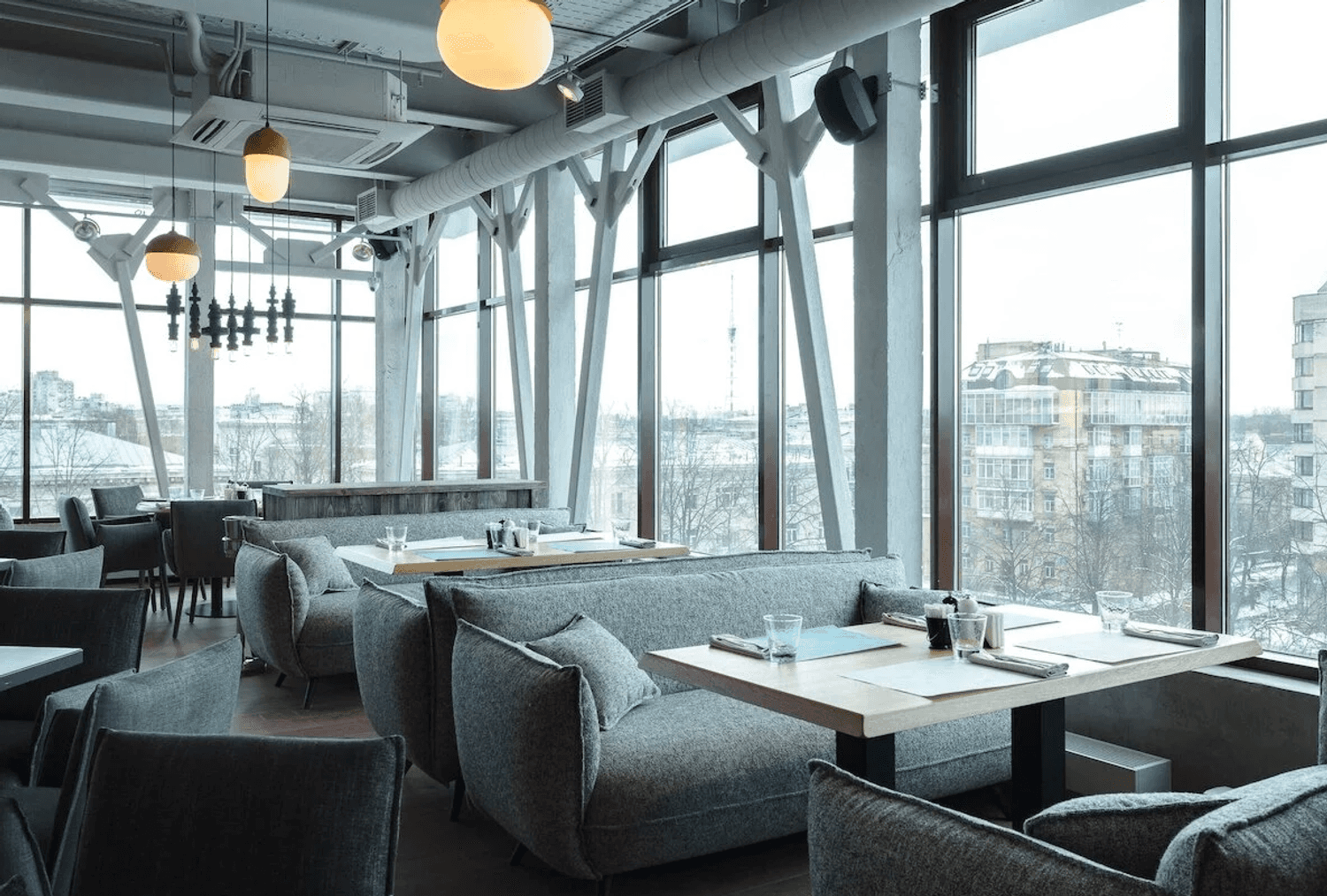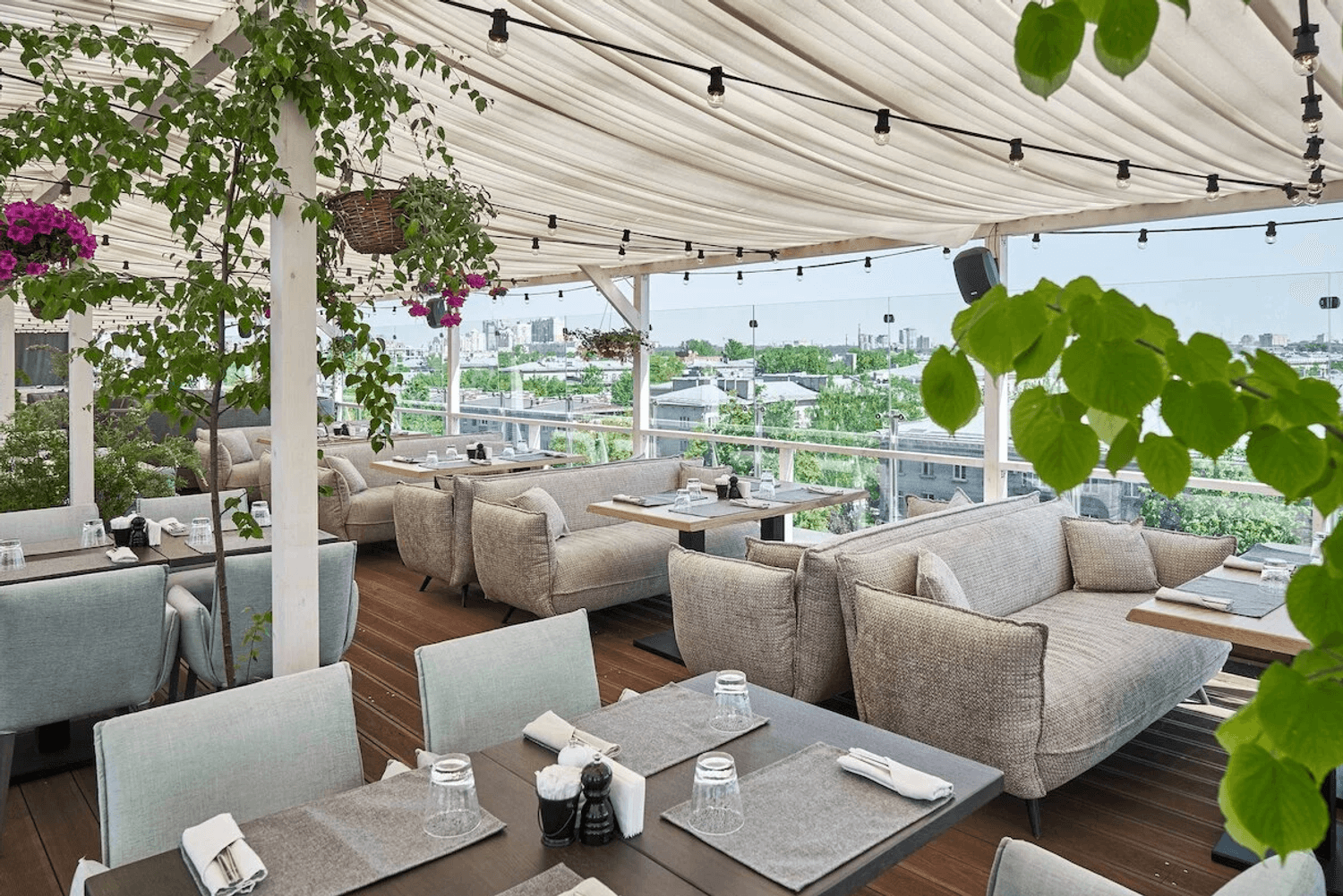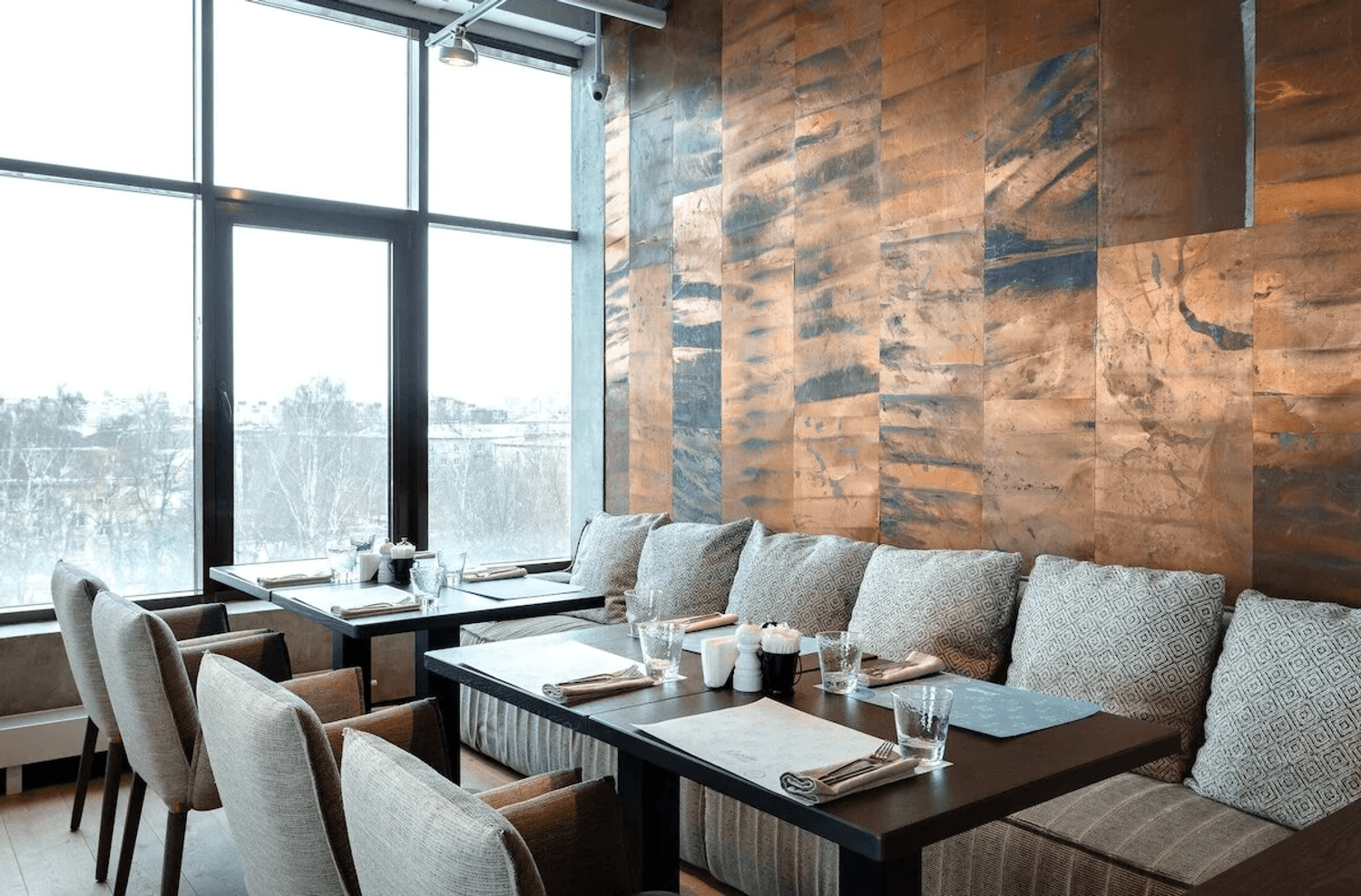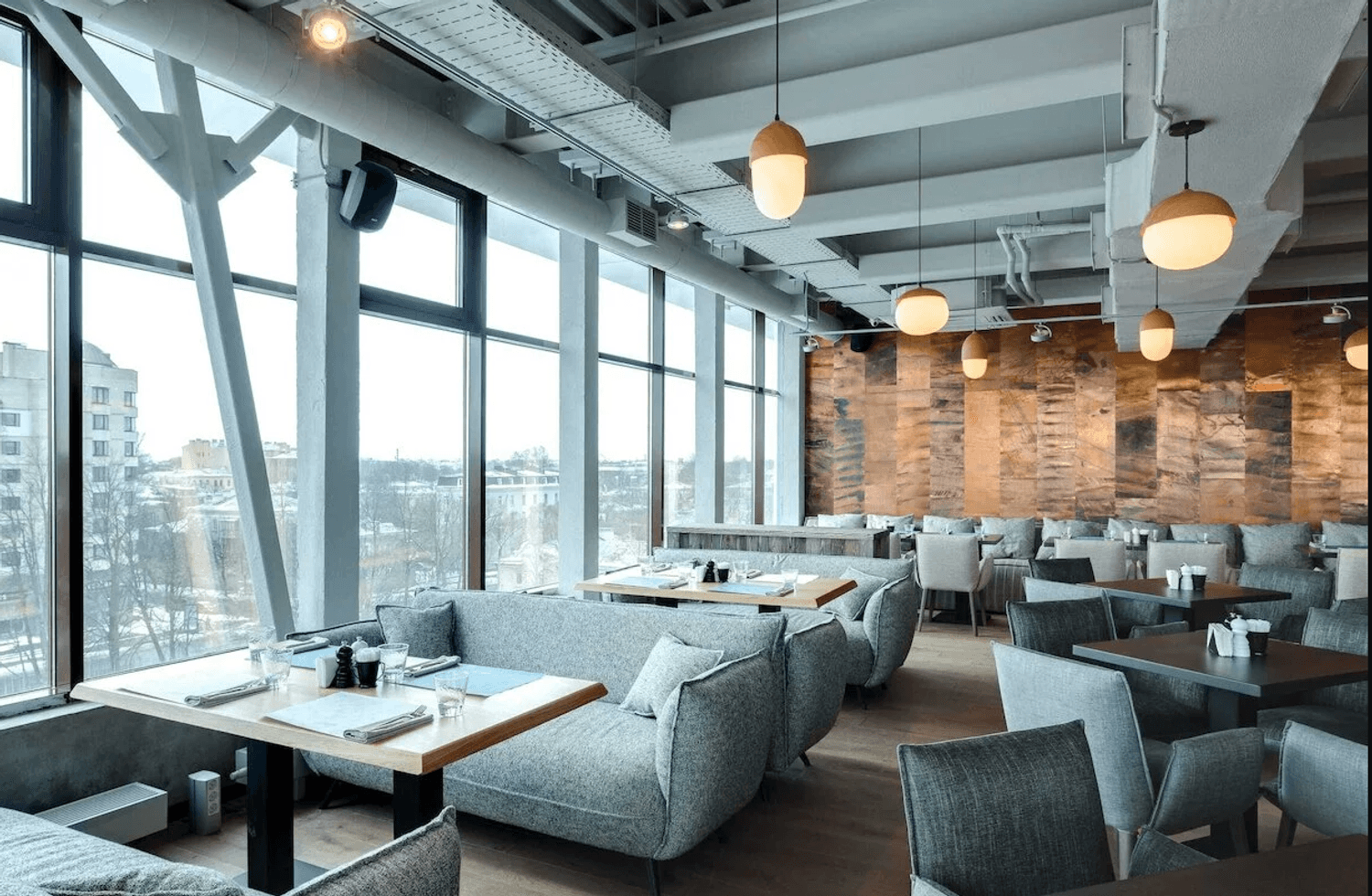 Атмосфера. Два просторных зала оформлены в светлых тонах с дубовыми перегородками, мягкими диванами и декоративными шарами. На крыше — летняя терраса с видом на Лахтинский залив. Для детей есть игровой уголок, а по вечерам звучит живая музыка.