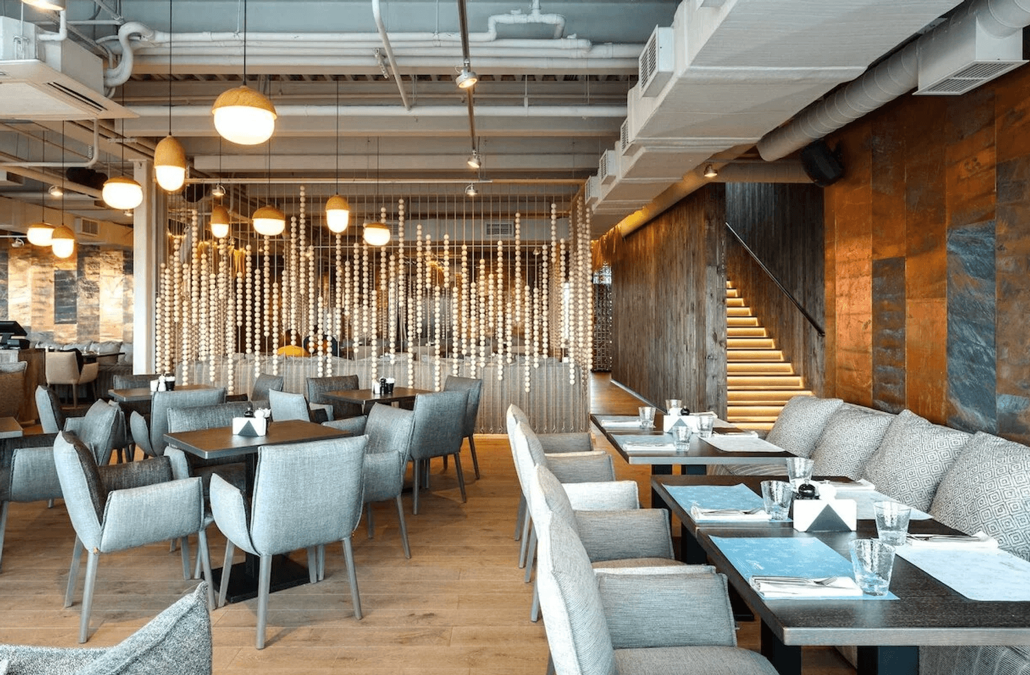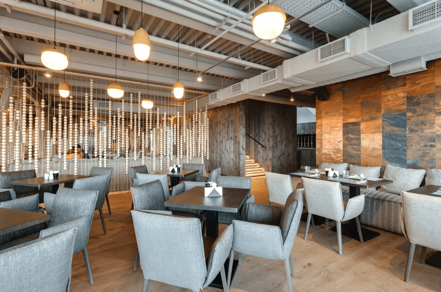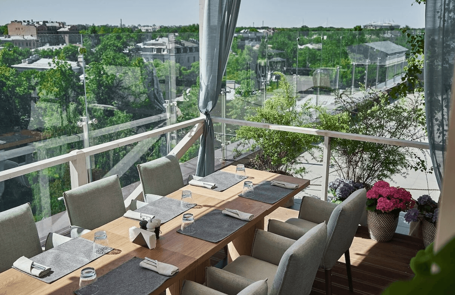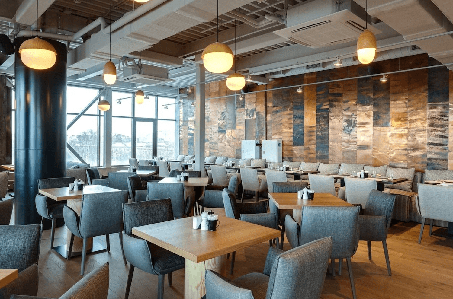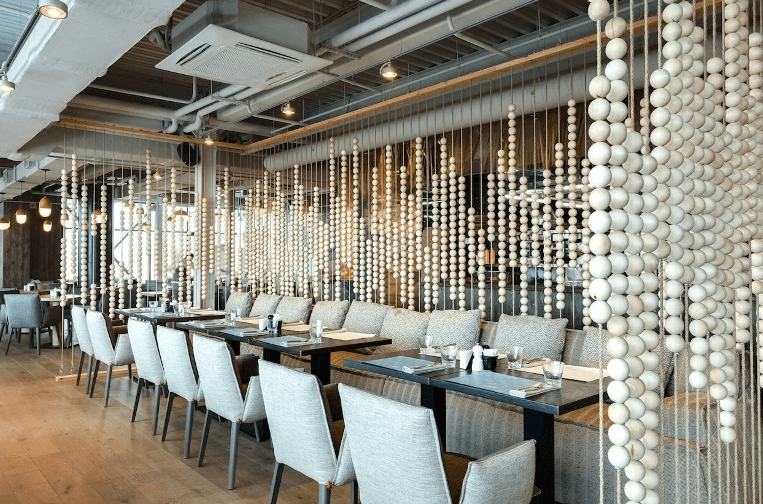 Атмосфера. Два просторных зала оформлены в светлых тонах с дубовыми перегородками, мягкими диванами и декоративными шарами. На крыше — летняя терраса с видом на Лахтинский залив. Для детей есть игровой уголок, а по вечерам звучит живая музыка.