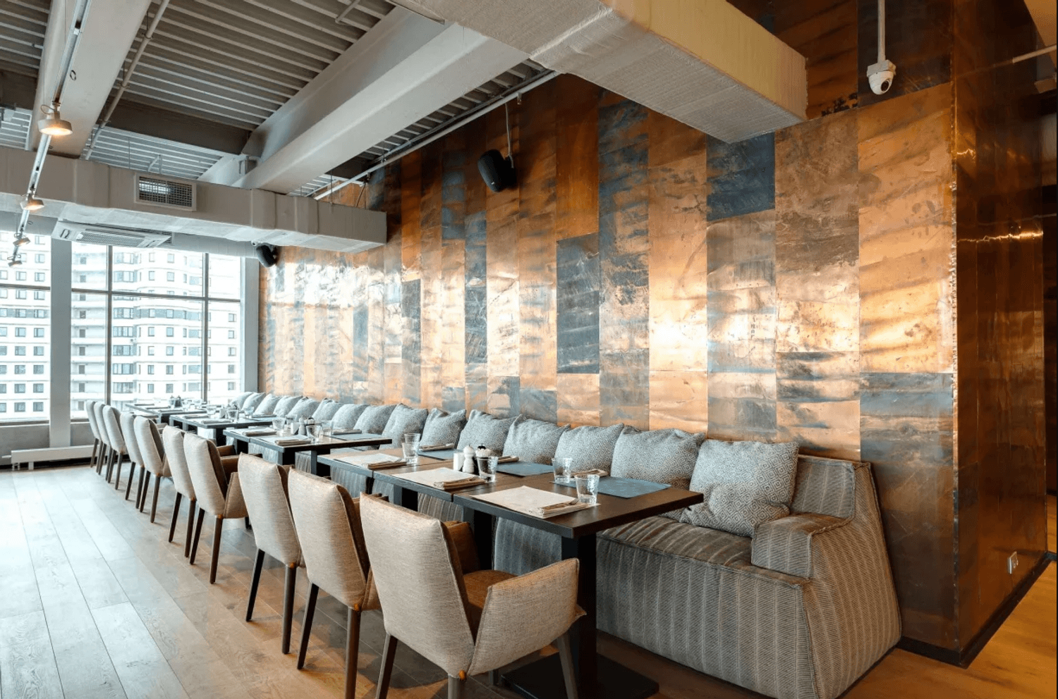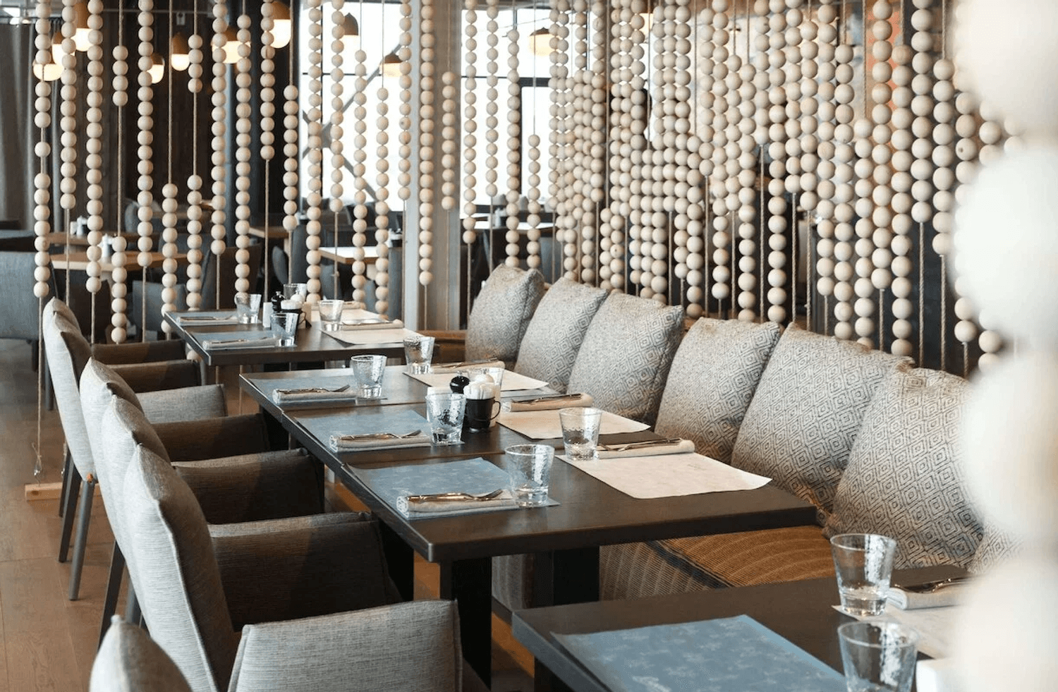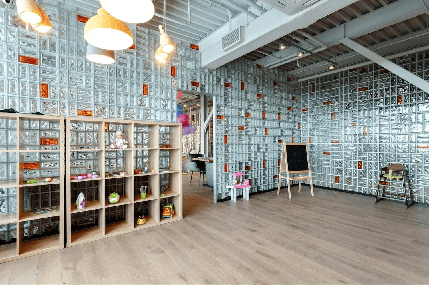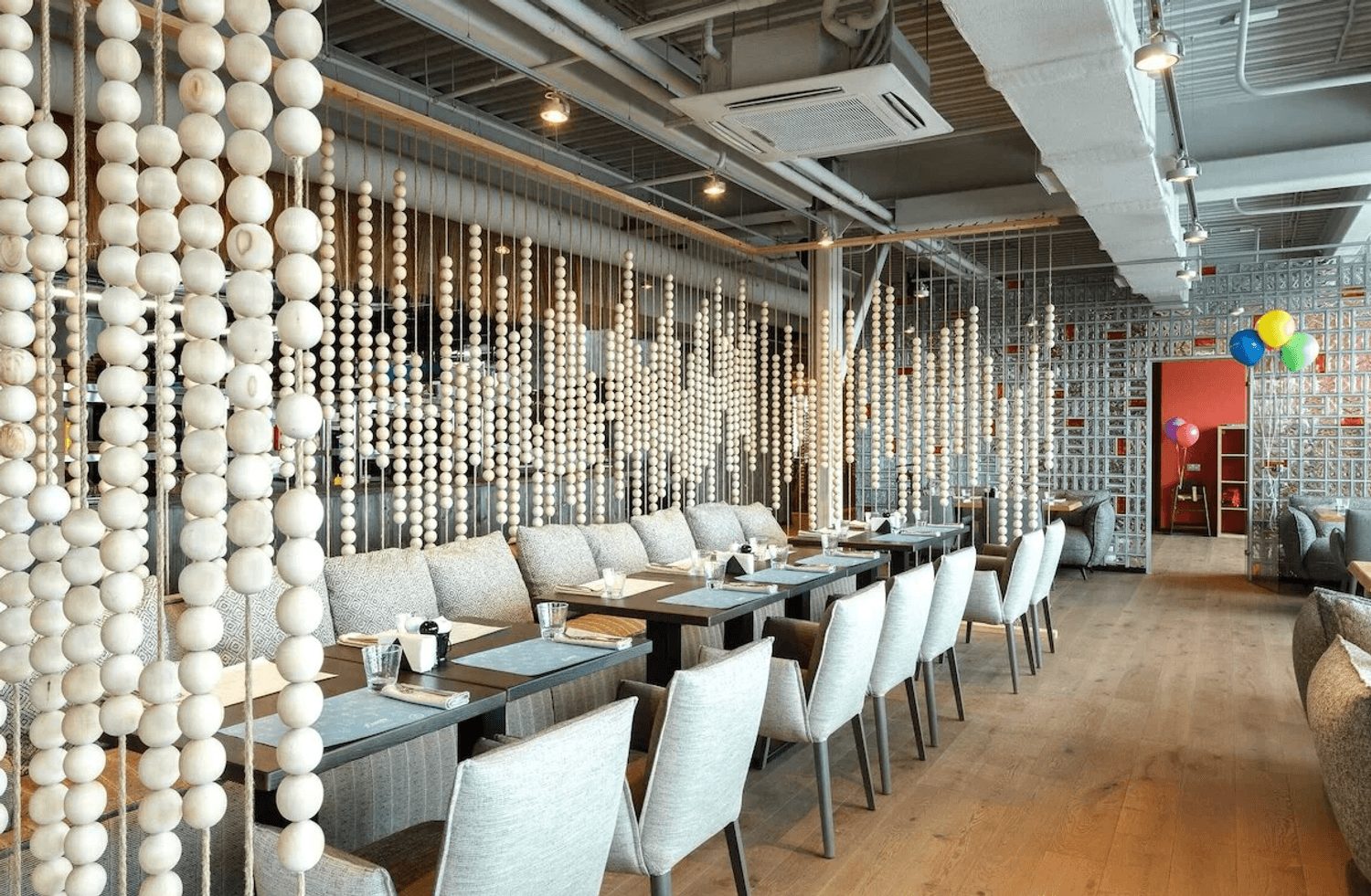 Атмосфера. Два просторных зала оформлены в светлых тонах с дубовыми перегородками, мягкими диванами и декоративными шарами. На крыше — летняя терраса с видом на Лахтинский залив. Для детей есть игровой уголок, а по вечерам звучит живая музыка.