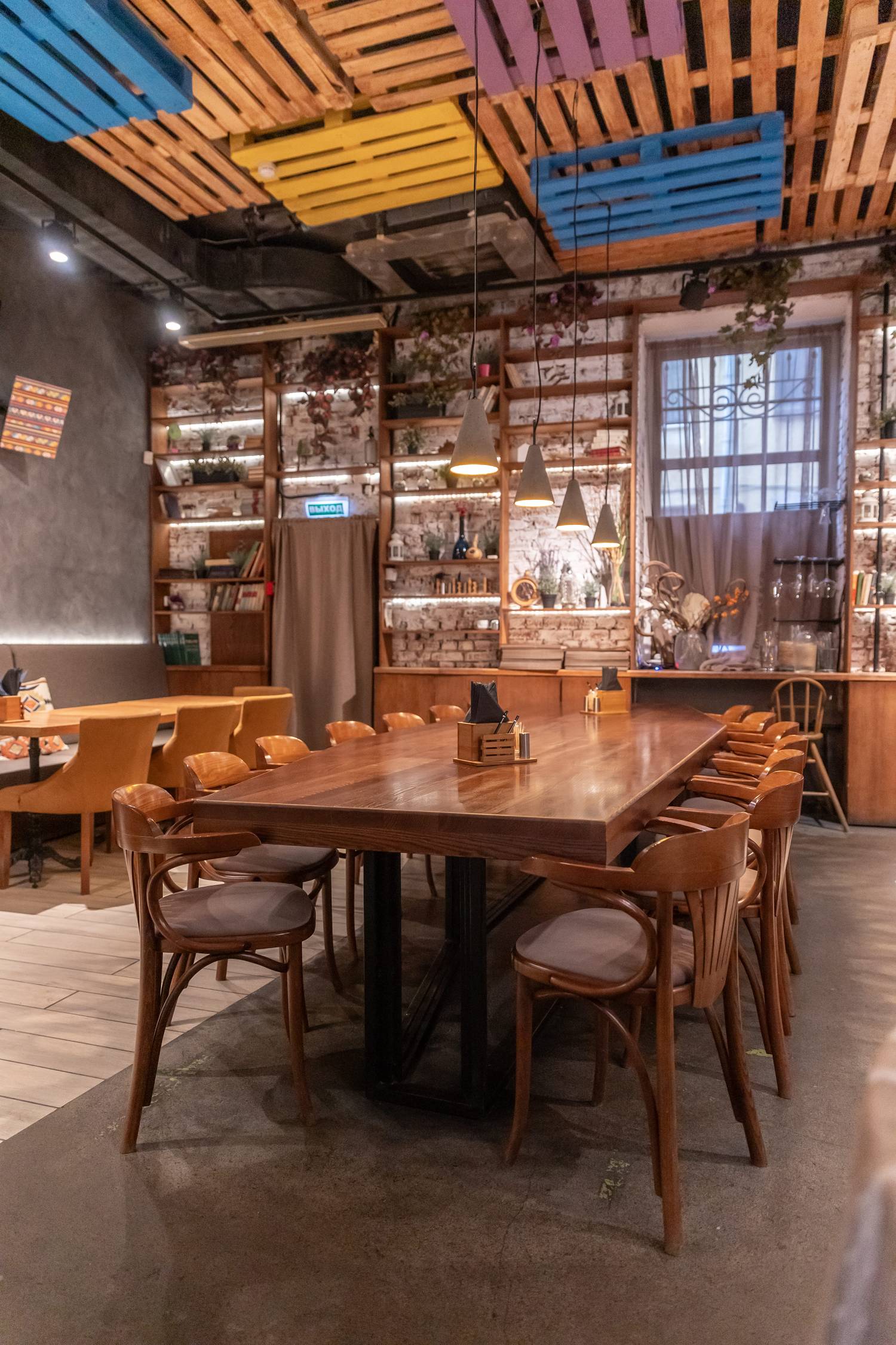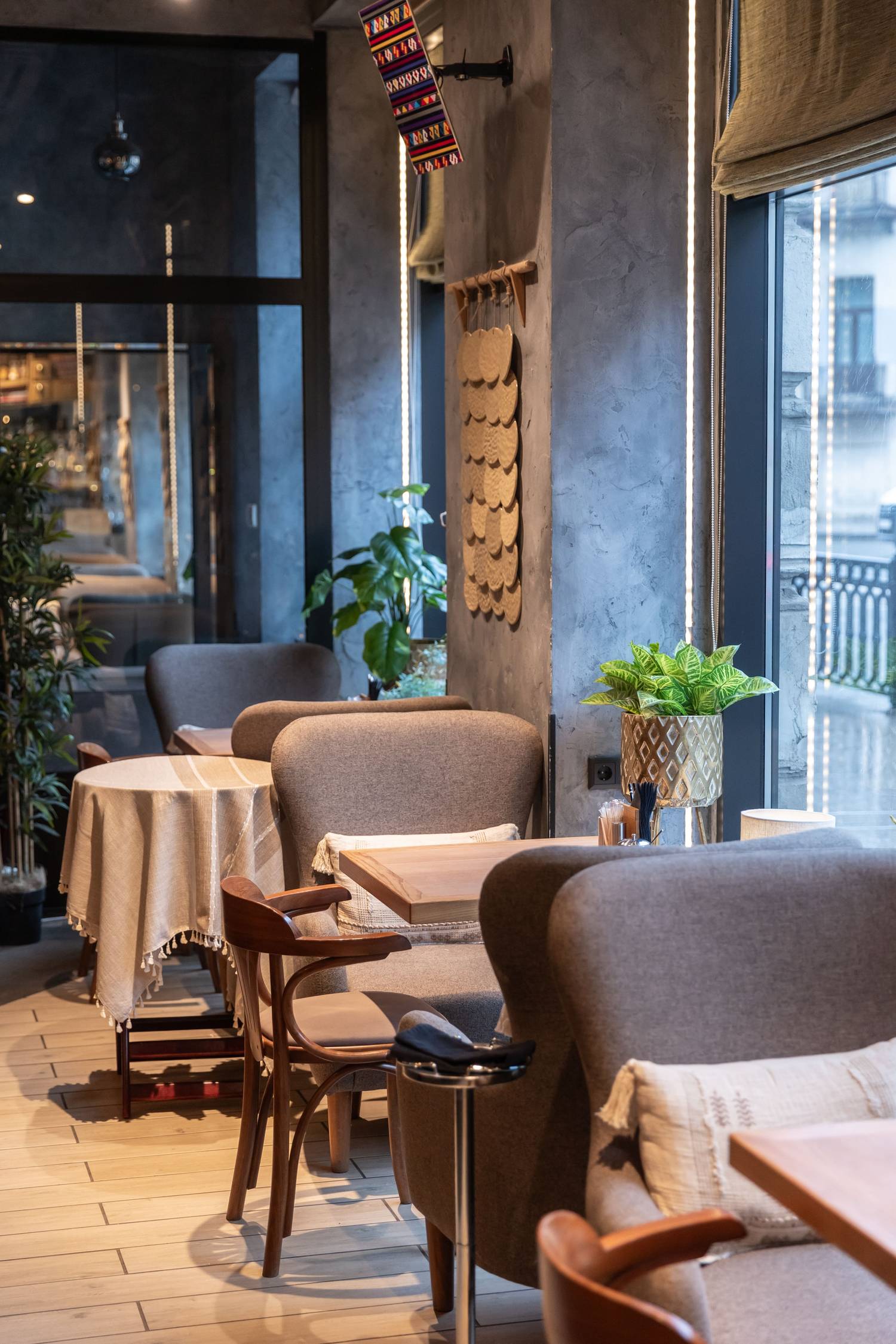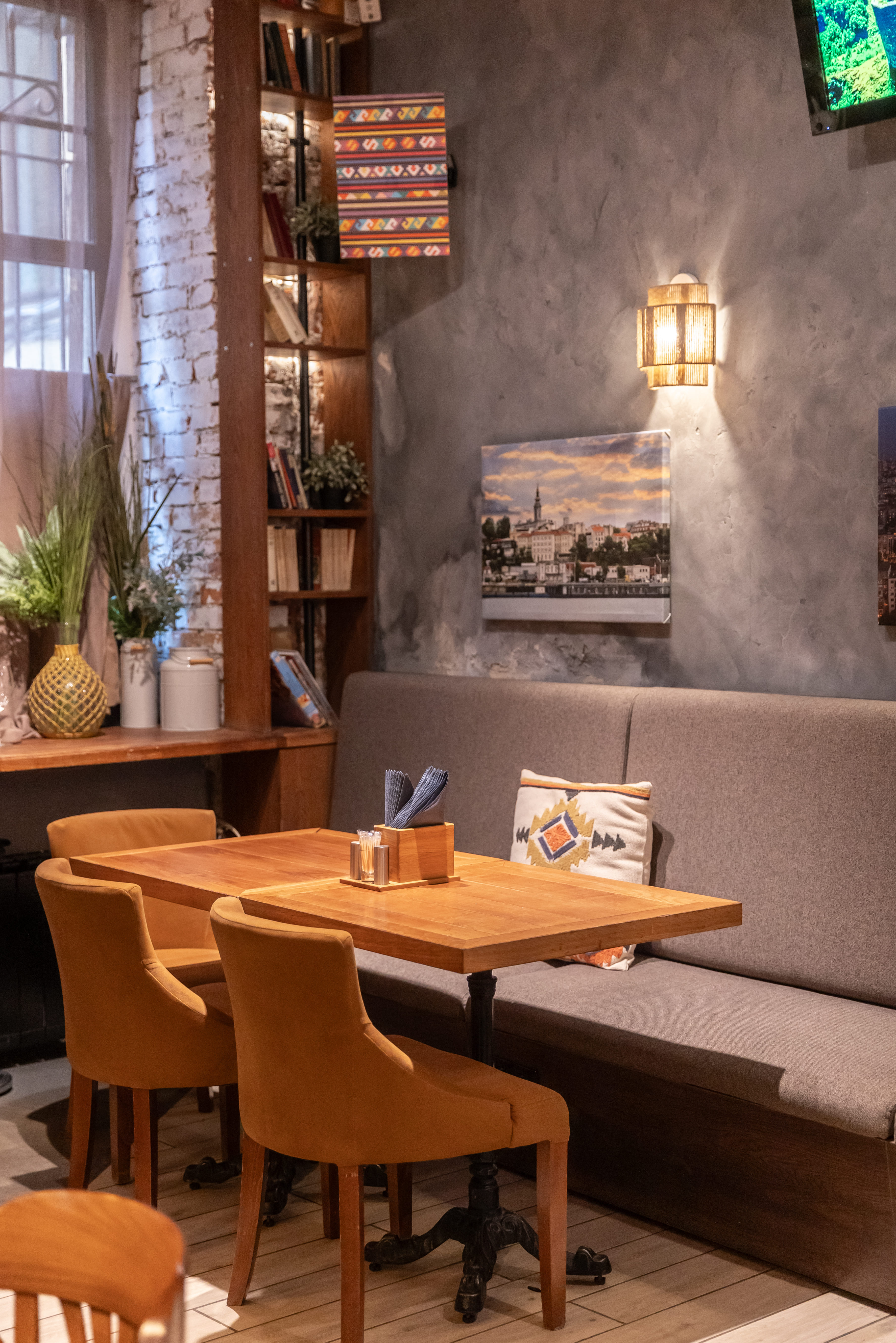 Атмосфера. Пространство с деревянным декором на потолке и просторной рассадкой создает атмосферу балканского гостеприимства. Здесь очень уютно благодаря текстилю, мягкой мебели и декоративной атрибутике в домашнем стиле. В заведении царит радушная обстановка, где гостей встречают как старых друзей, а стол на 12 персон идеально подходит для шумных застолий.