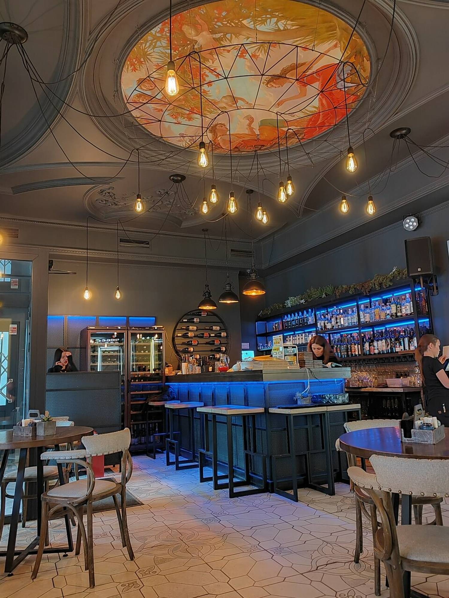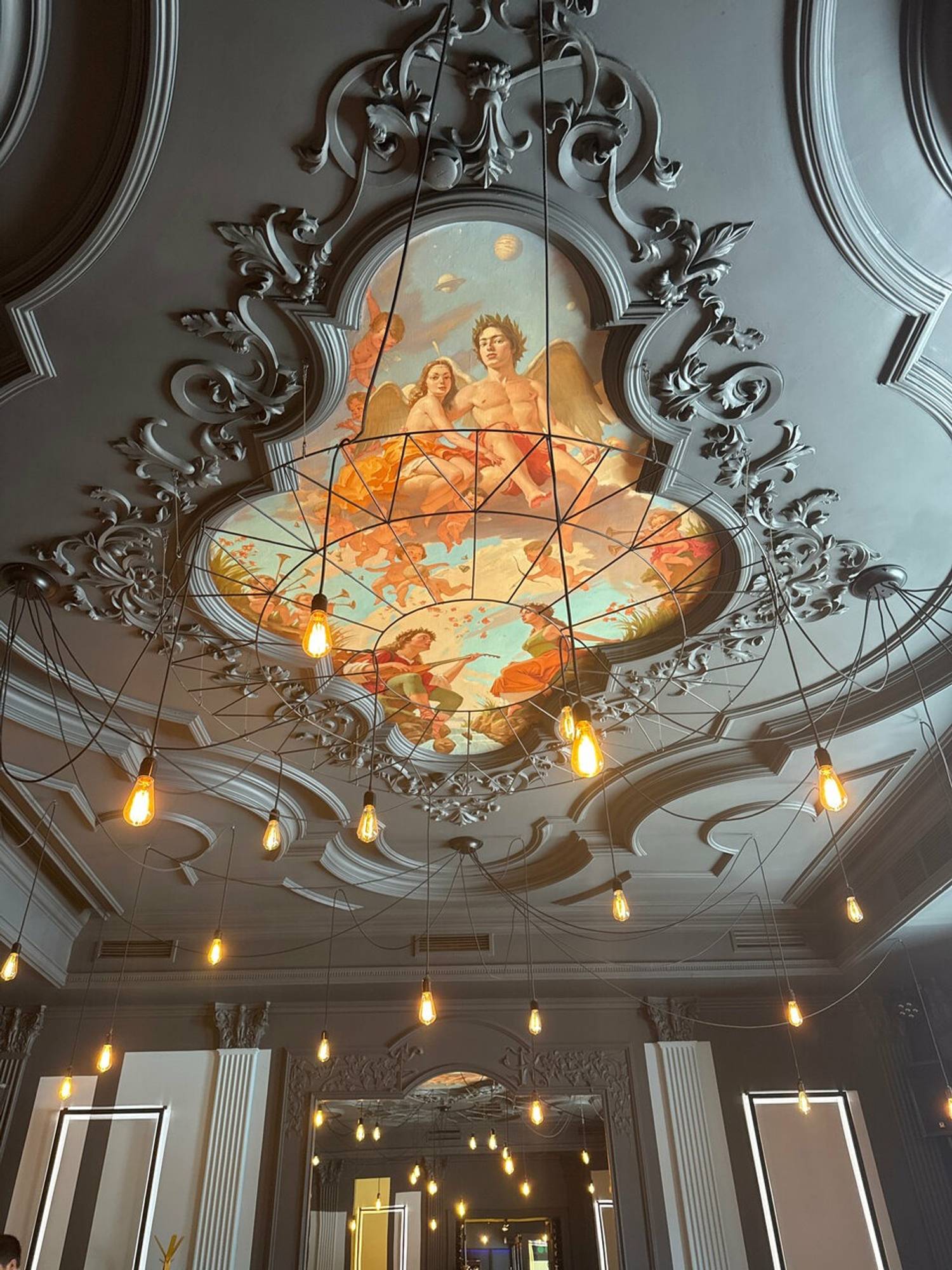 Атмосфера. Пространство оформлено в элегантном стиле: потолок с фресками, лепнина, лаконичная мебель и окна с видом на Таганку создают. Среди деталей розовая подсветка и круглые панно с бутылками вина.