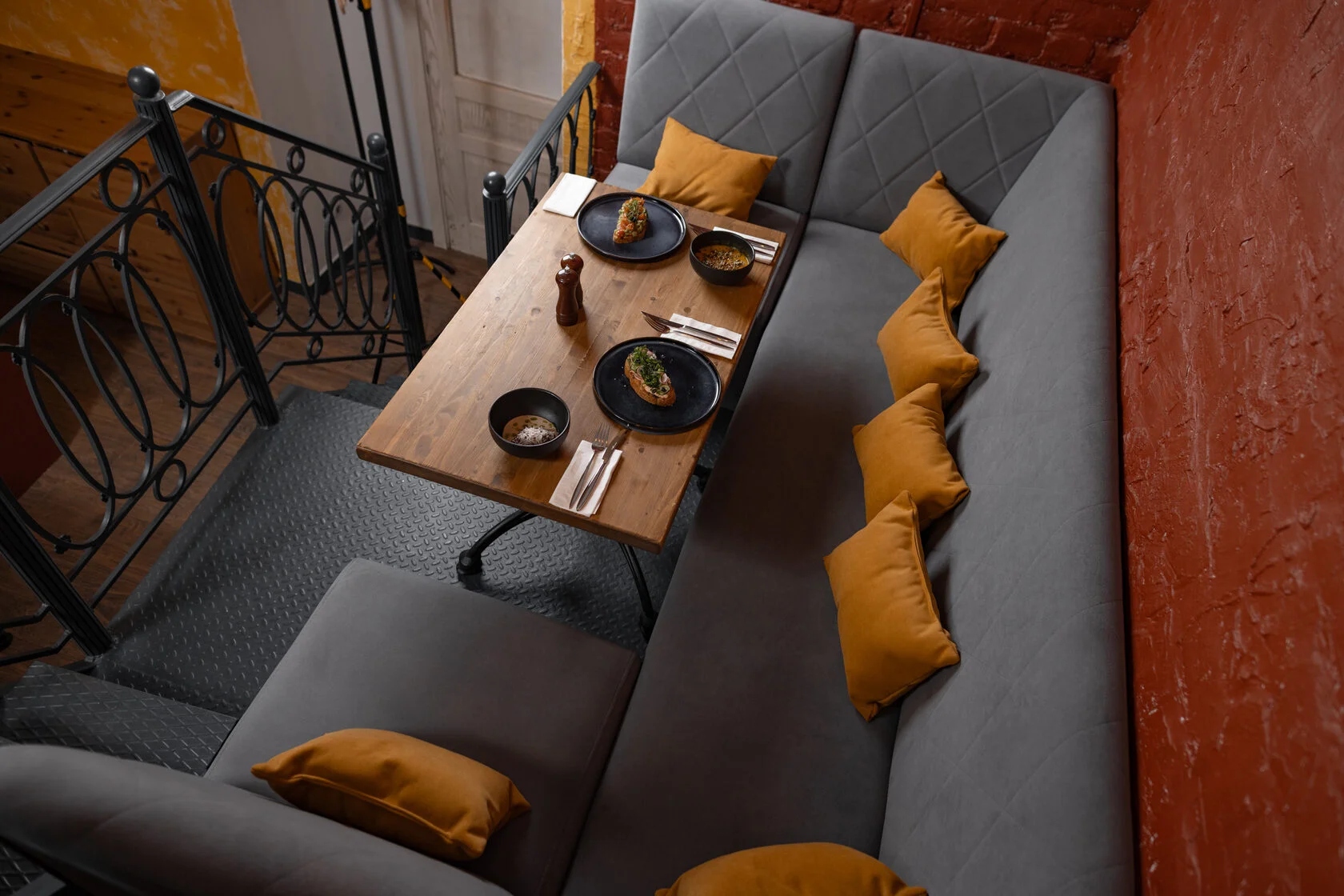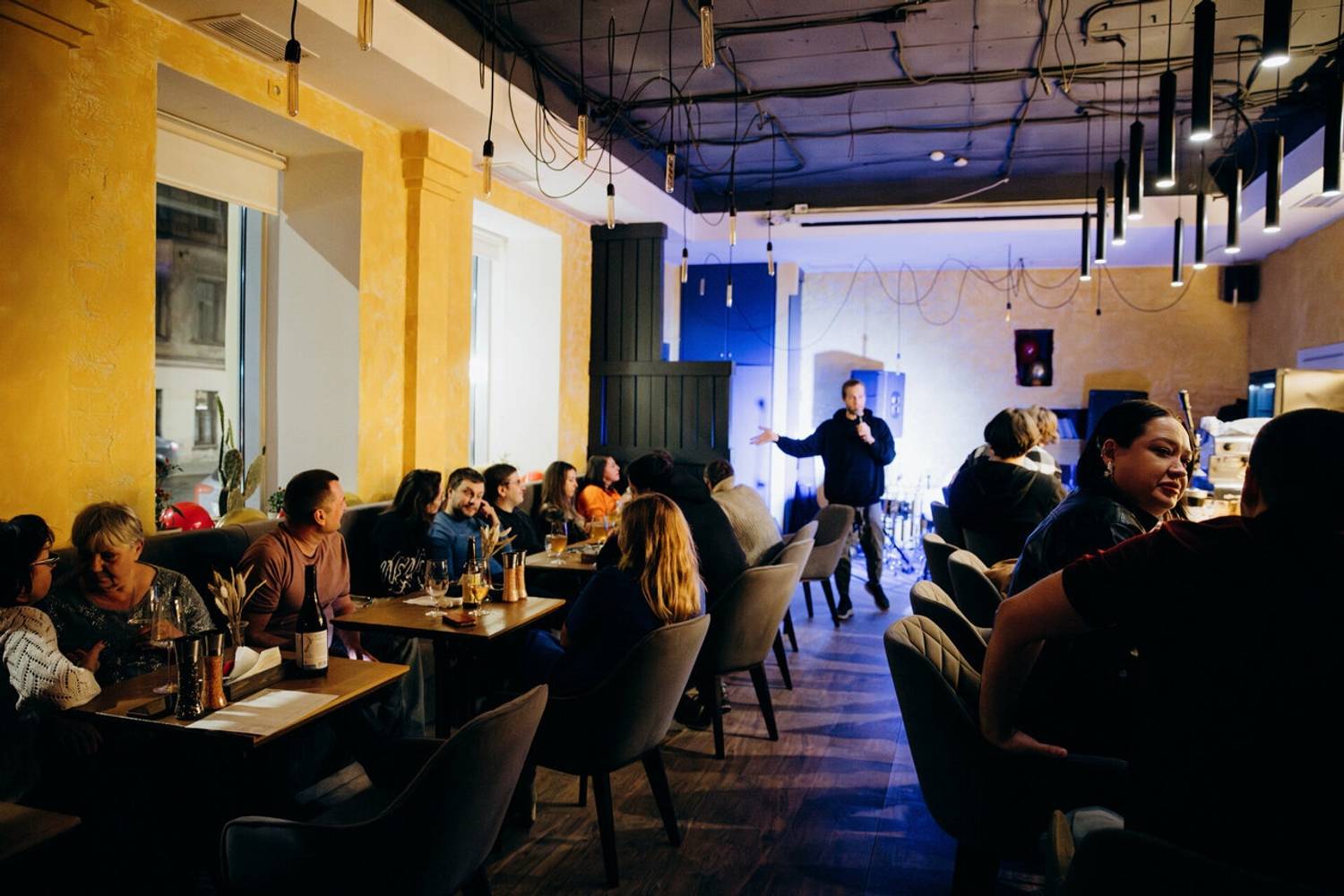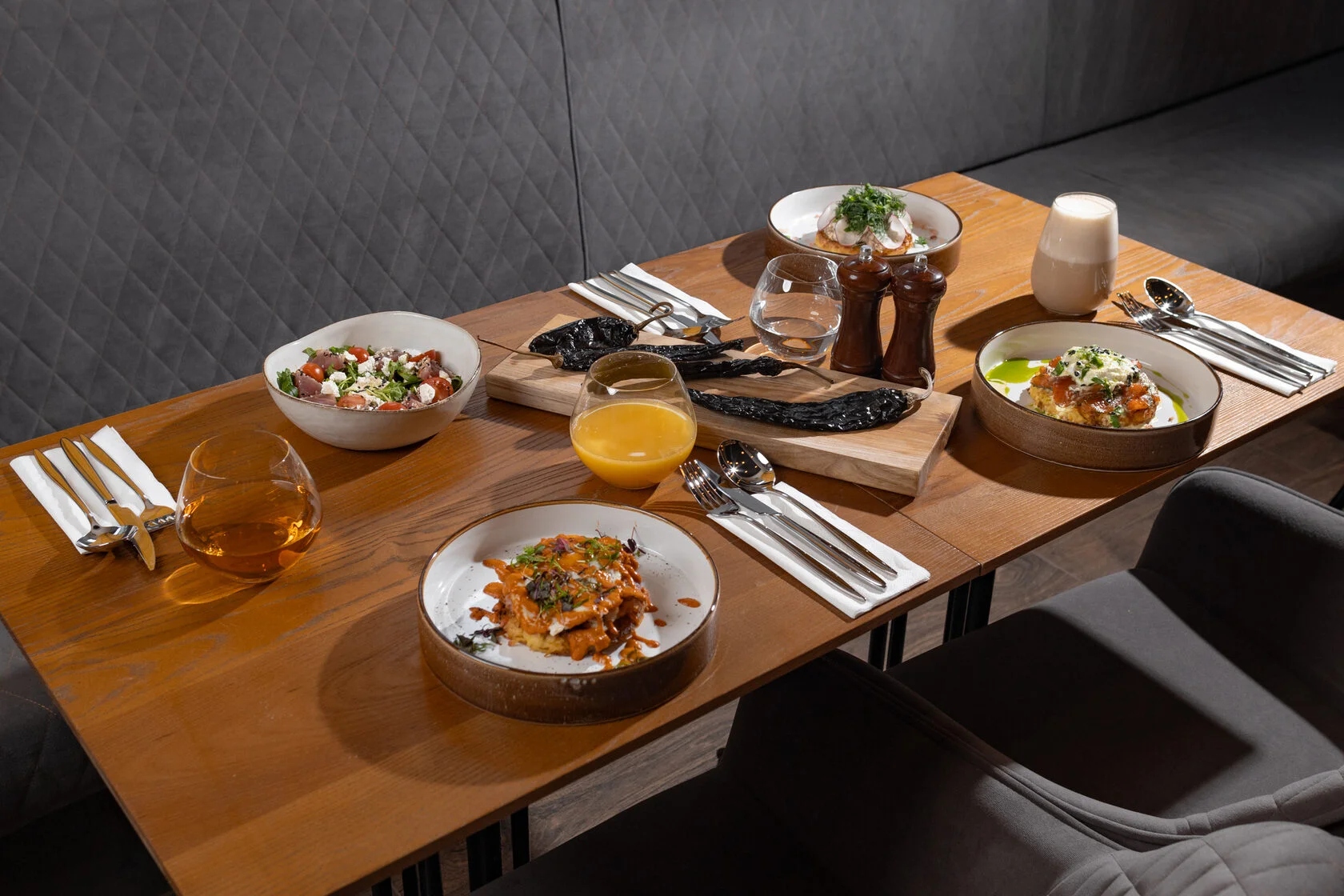 Атмосфера. Пространство оформлено в стиле лампового лофта: кирпичные стены, деревянные столы, мягкие диваны в серых тонах и точечные светильники создают уютную и расслабленную обстановку. Акценты горчичного цвета и живые перчики чили на полках тонко обыгрывают концепцию. Зал достаточно просторный, здесь можно не только поужинать, но и потанцевать, а также провести мероприятие: от кулинарного квиза до выступления стендап-резидентов. Летом работает уличная терраса, а по утрам сюда приходят за завтраками, которые подают до 10 утра.
