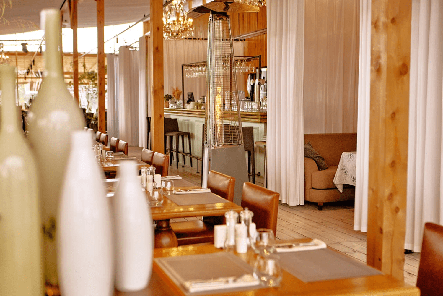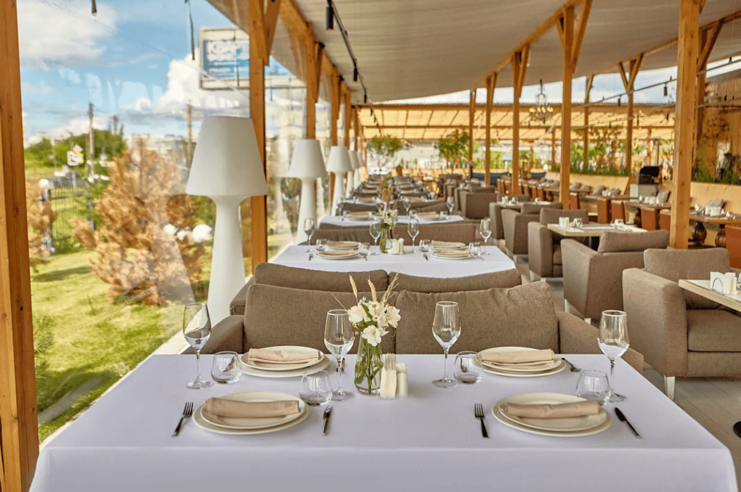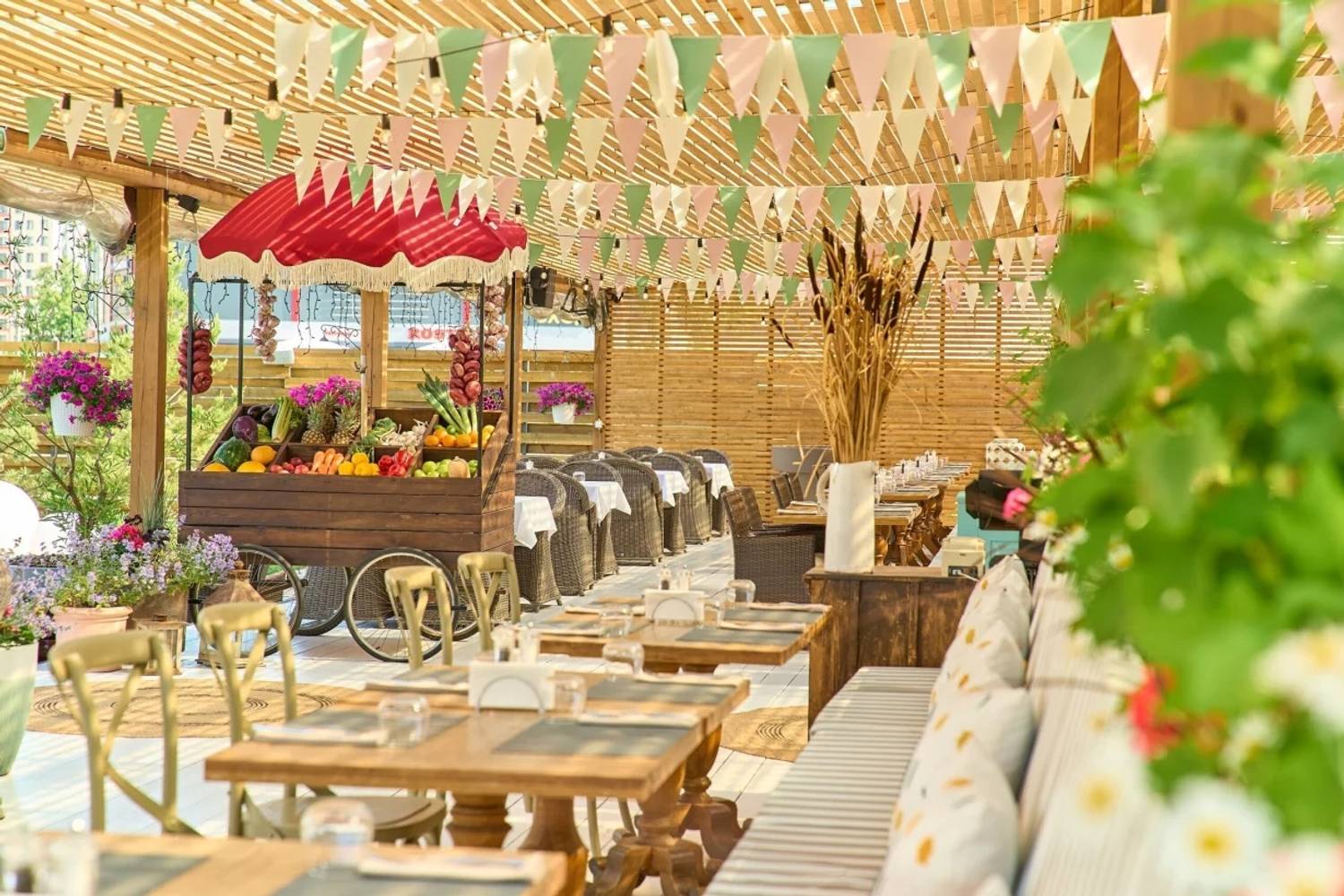 Атмосфера. Просторный зал и летняя терраса навевают мысли о лете в любое время года. Яркие флажки неизменно поднимают настроение, а обилие природных материалов и яркий мягкий текстиль создают ощущение теплы, праздника и радости.