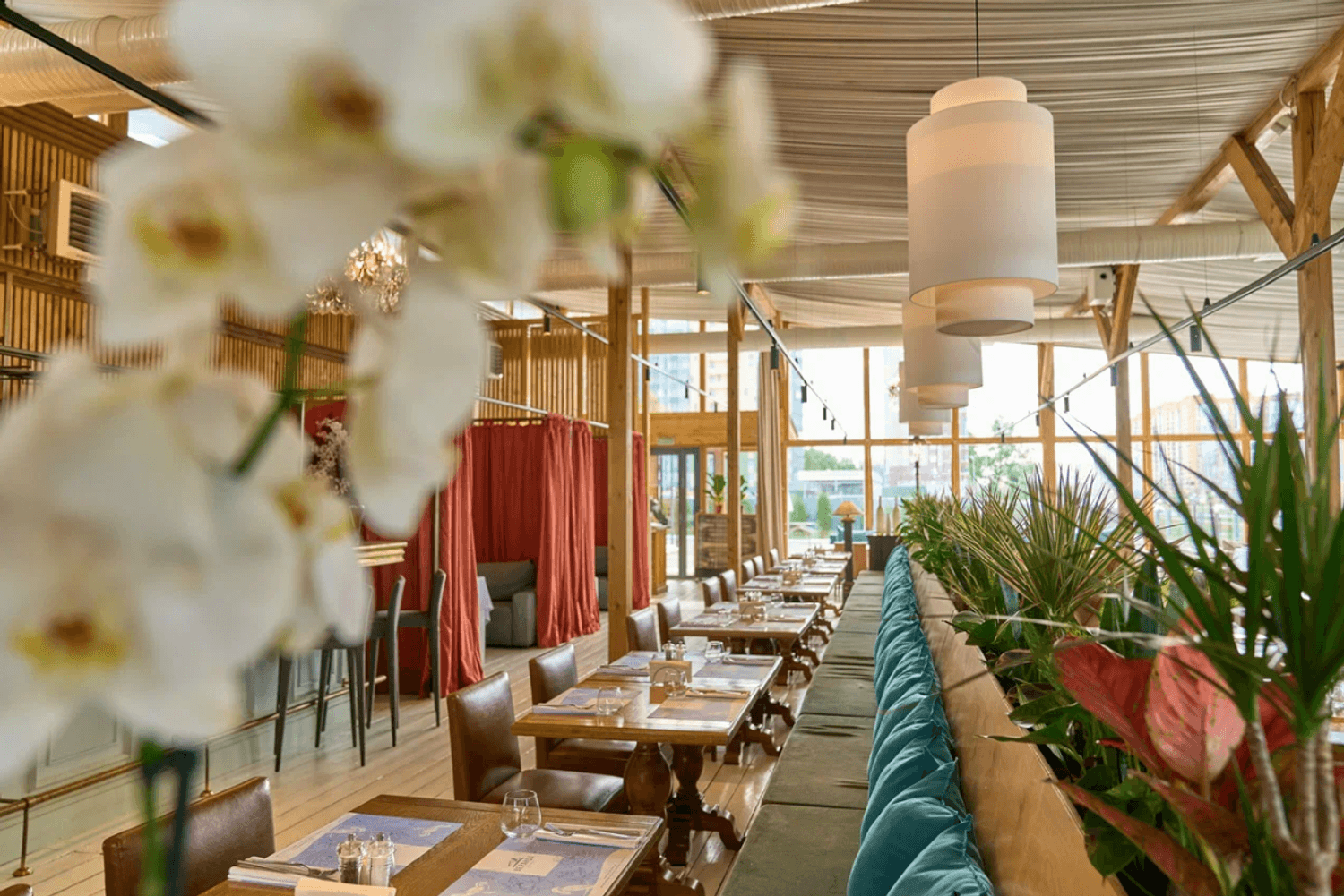 «Веранда» по адресу проспект Маршала Блюхера, 6А — ресторан Ginza Project с открытой террасой и собственной зеленой зоной.
