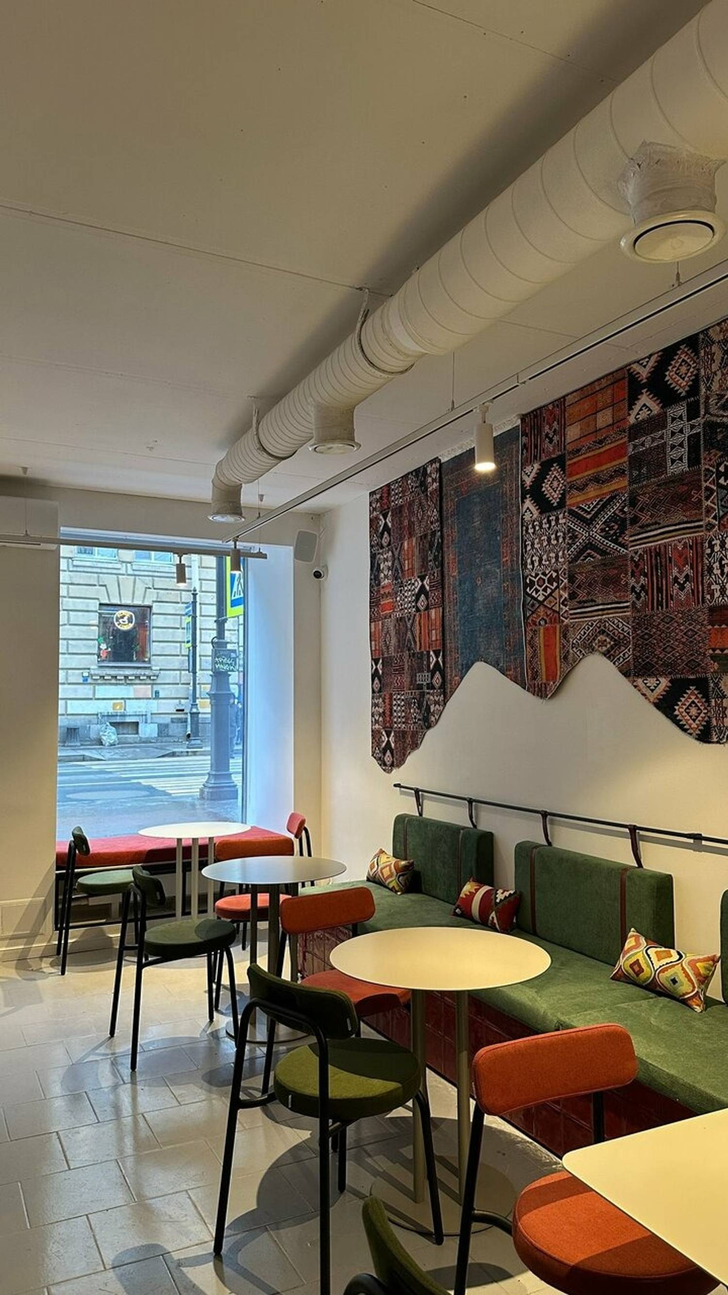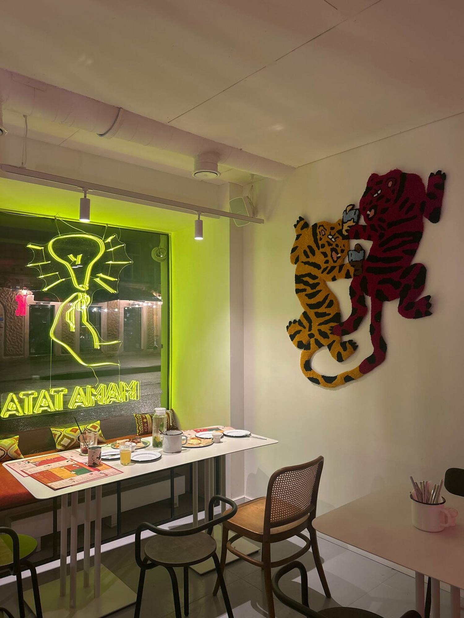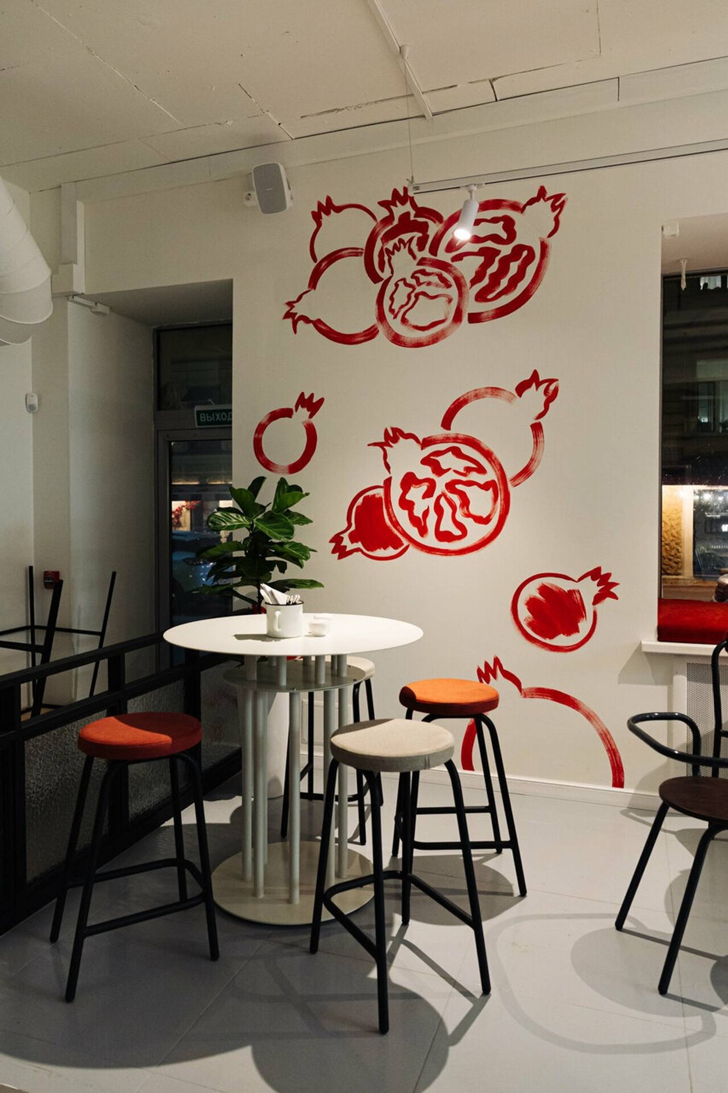 Атмосфера. Попадая сюда, вы оказываетесь в эпицентре веселого и непринужденного пира. Такое ощущение создают характерные детали: яркая фреска с тиграми, забавный рисунок чокающихся рук на стене и открытая печь, у которой лепят хинкали. Длинная контактная стойка с высокими стульями подчеркивает формат рюмочной, где легко знакомиться и общаться. Интерьер настроен на живое общение и подходит для шумных компаний.