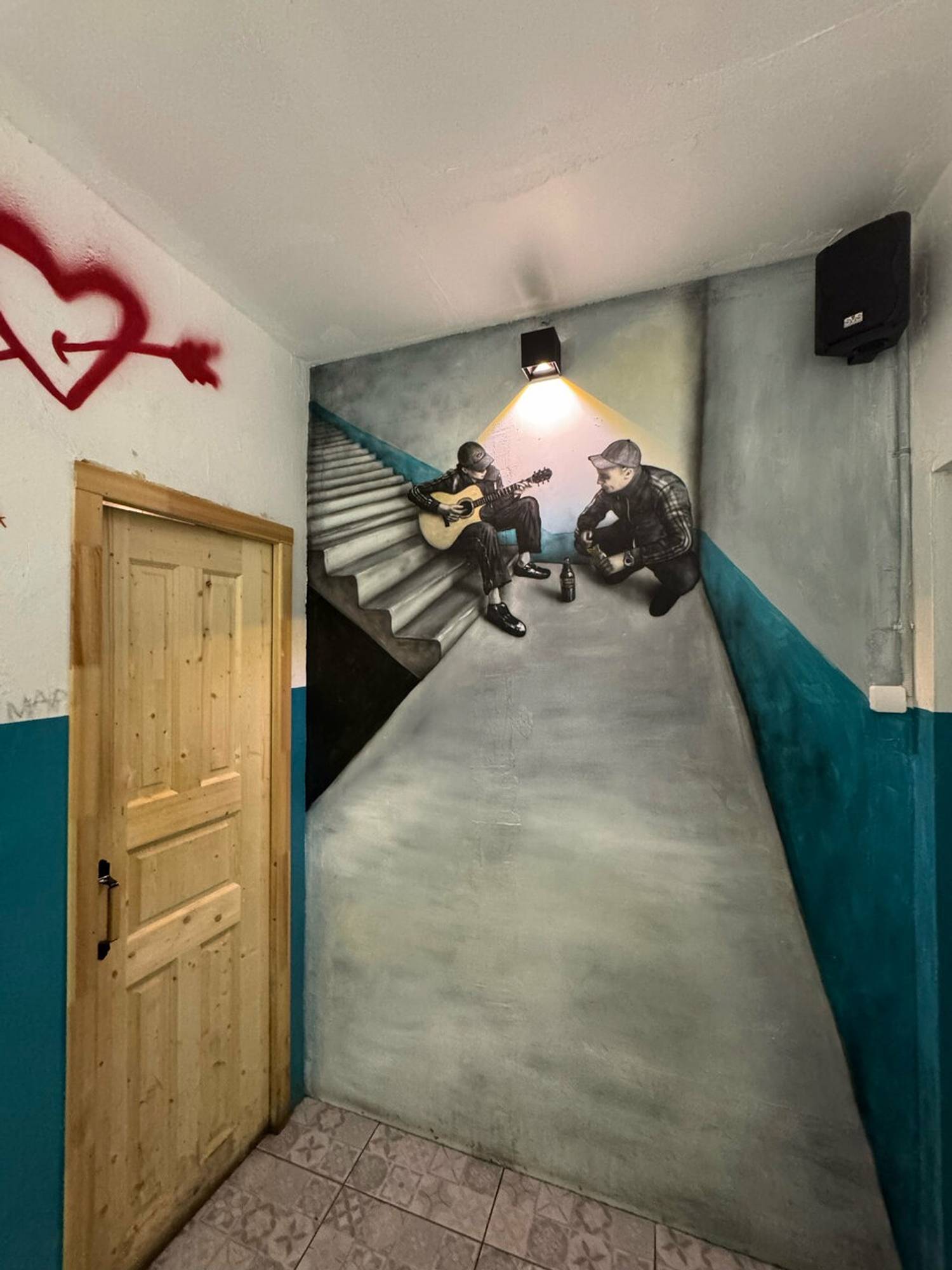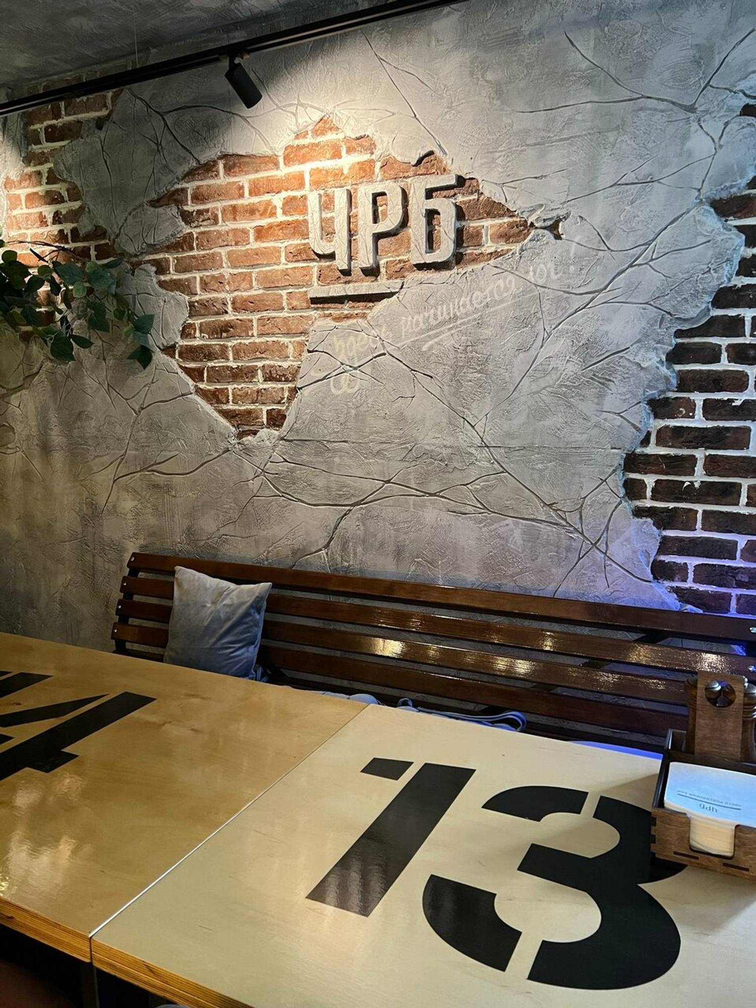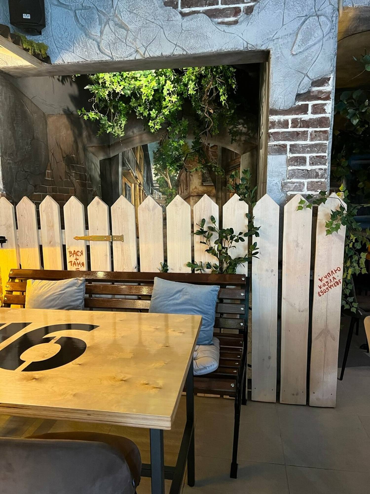 Атмосфера. Дизайн бара погружает в непринужденную и оживленную атмосферу, которая напоминает дружеские посиделки во дворе. Важную роль играют характерные детали: стилизованный ретро-мопед, ярко-желтая пивная бочка, расписной забор с надписями и плакаты на серо-кирпичных стенах и темно-коричневые деревянные лавочки. Летом гостям предлагают отдохнуть на терраса. В баре часто транслируют спортивные матчи, за этим и приходят сюда большие компании.