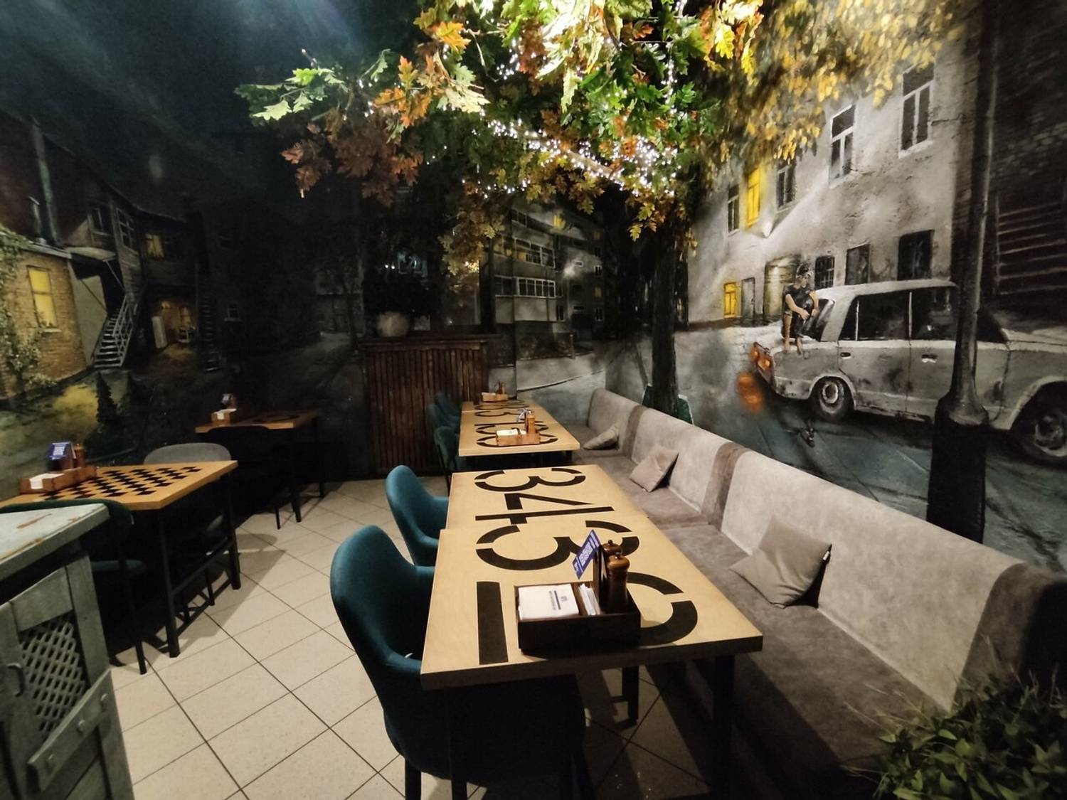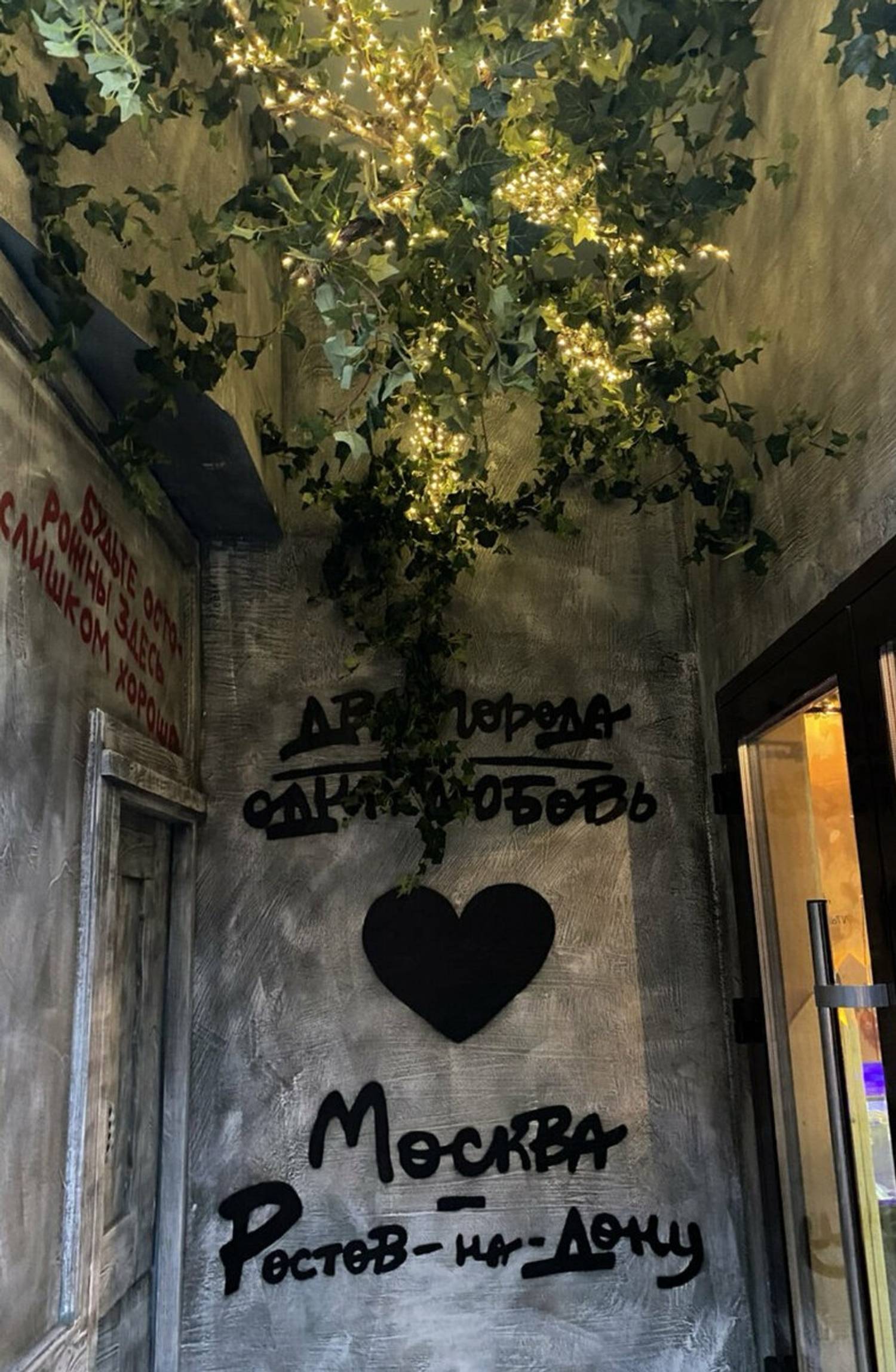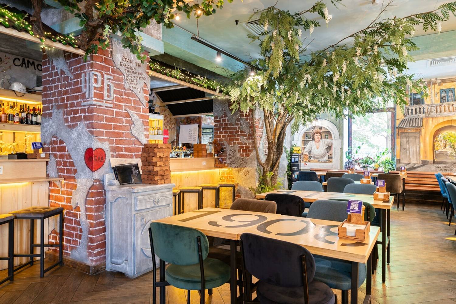Атмосфера. Бар погружает в теплое и ностальгическое состояние, словно перенося гостя в уютный провинциальный дворик. Интерьер, стилизованный под ростовскую улочку, выглядит эффектно с помощью кирпичных стен с изображениями домиков, деревянных заборчиков с надписями, живых растений и деталей вроде старого мопеда. Мягкий рассеянный свет от гирлянд, деревянные скамьи и столики формируют непринужденную обстановку. Летом здесь открывается терраса, а гости могут взять у персонала настольные игры. Так что здесь можно по-настоящему сыграть в домино в ростовском дворике, сидя на лавке с пивом и семечками.
