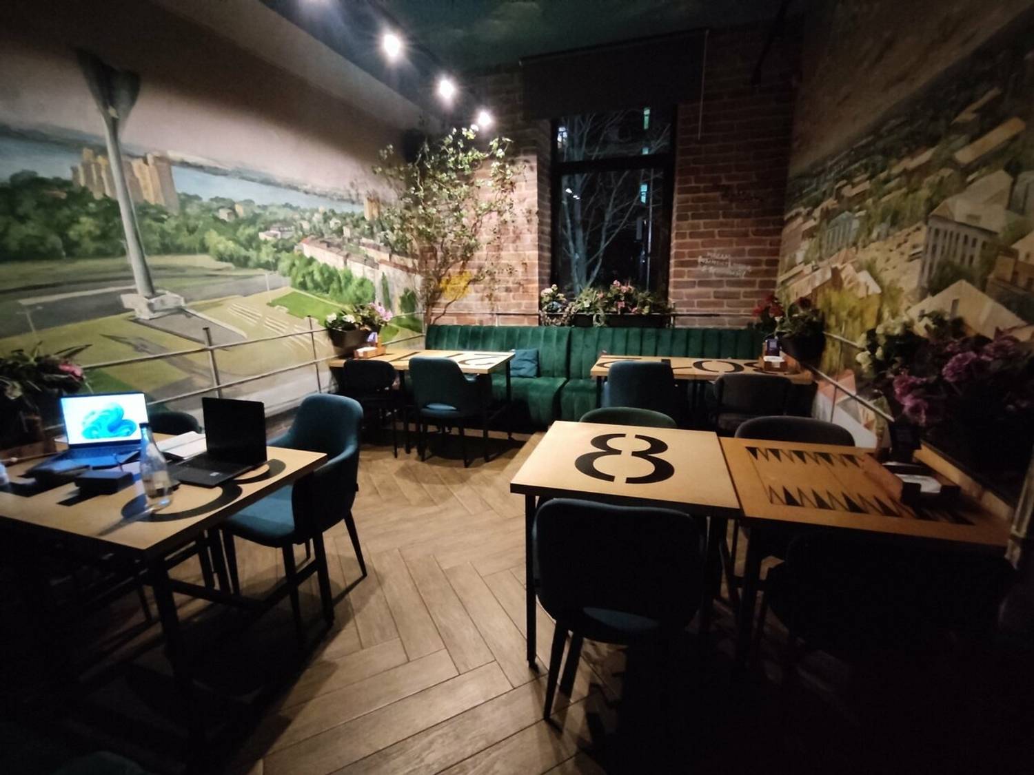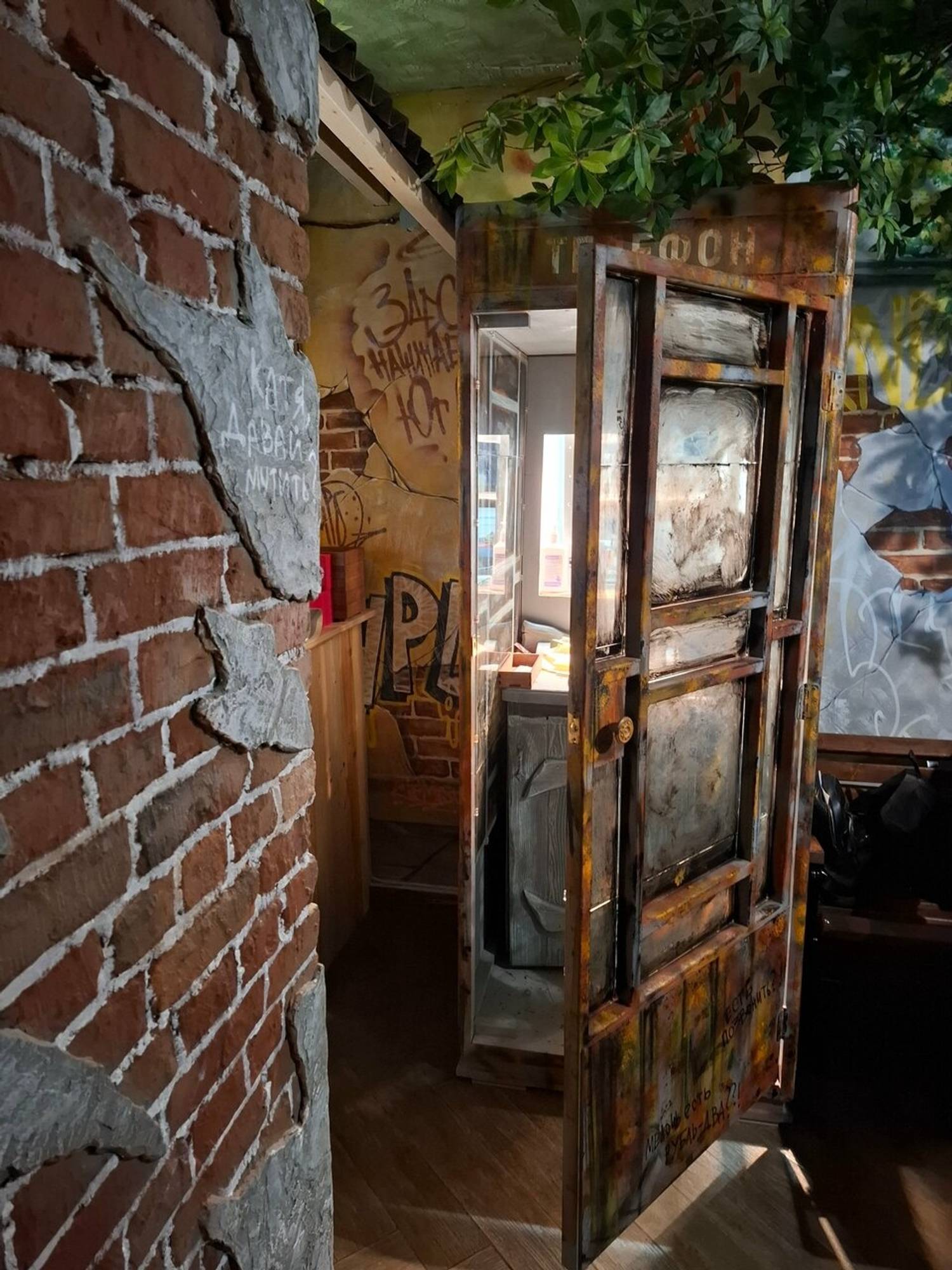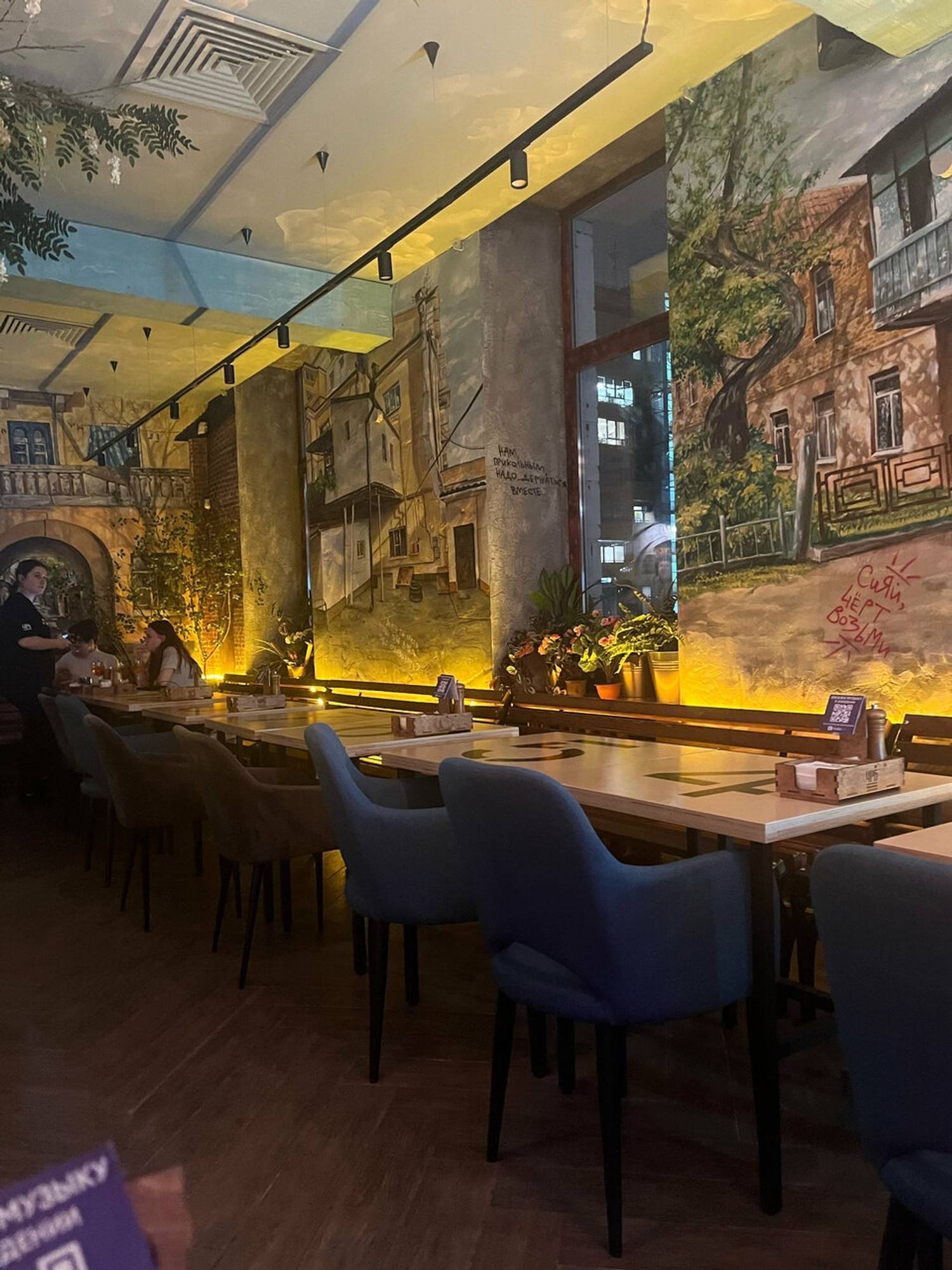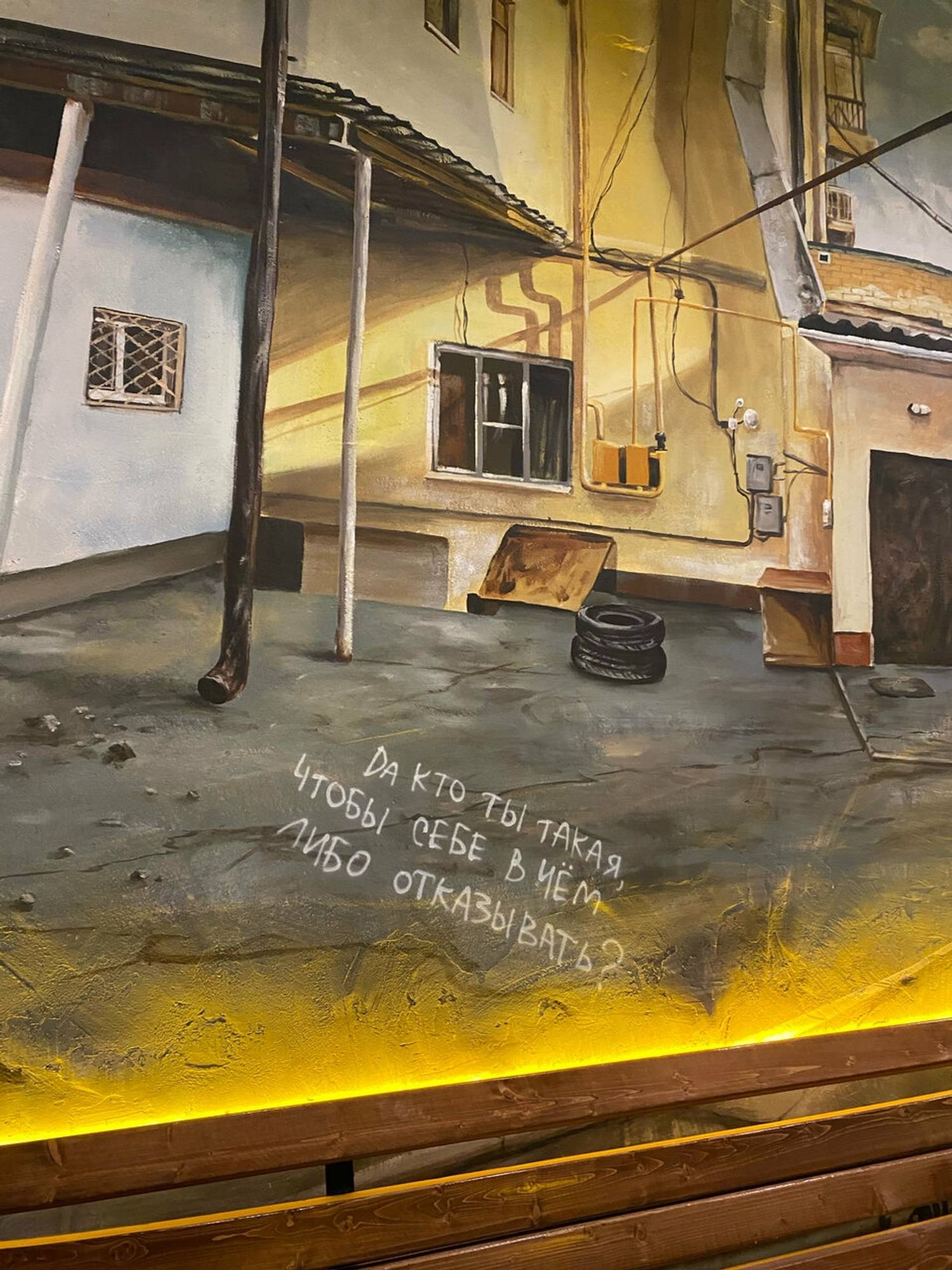 Атмосфера. Бар погружает в теплое и ностальгическое состояние, словно перенося гостя в уютный провинциальный дворик. Интерьер, стилизованный под ростовскую улочку, выглядит эффектно с помощью кирпичных стен с изображениями домиков, деревянных заборчиков с надписями, живых растений и деталей вроде старого мопеда. Мягкий рассеянный свет от гирлянд, деревянные скамьи и столики формируют непринужденную обстановку. Летом здесь открывается терраса, а гости могут взять у персонала настольные игры. Так что здесь можно по-настоящему сыграть в домино в ростовском дворике, сидя на лавке с пивом и семечками.
