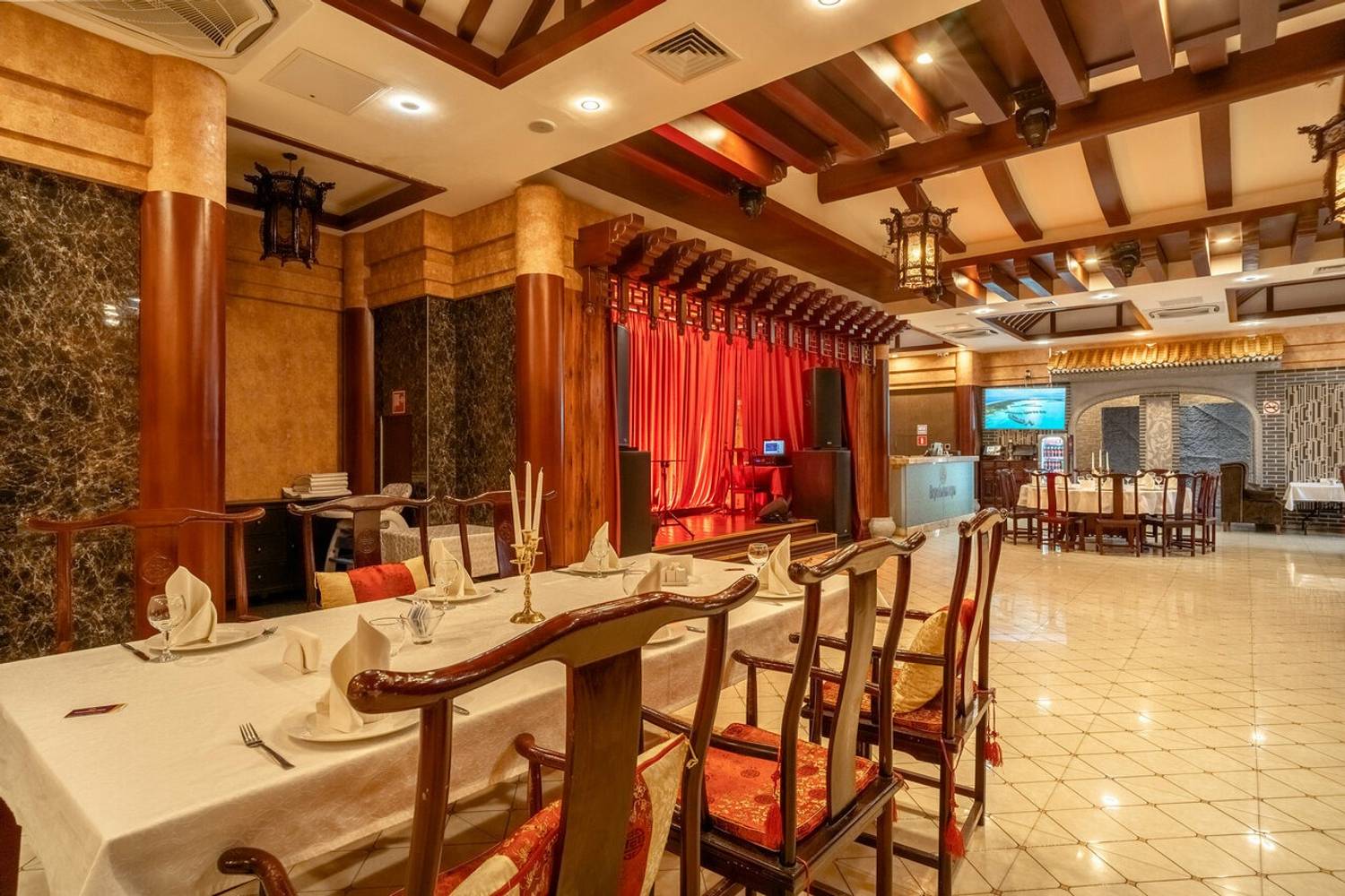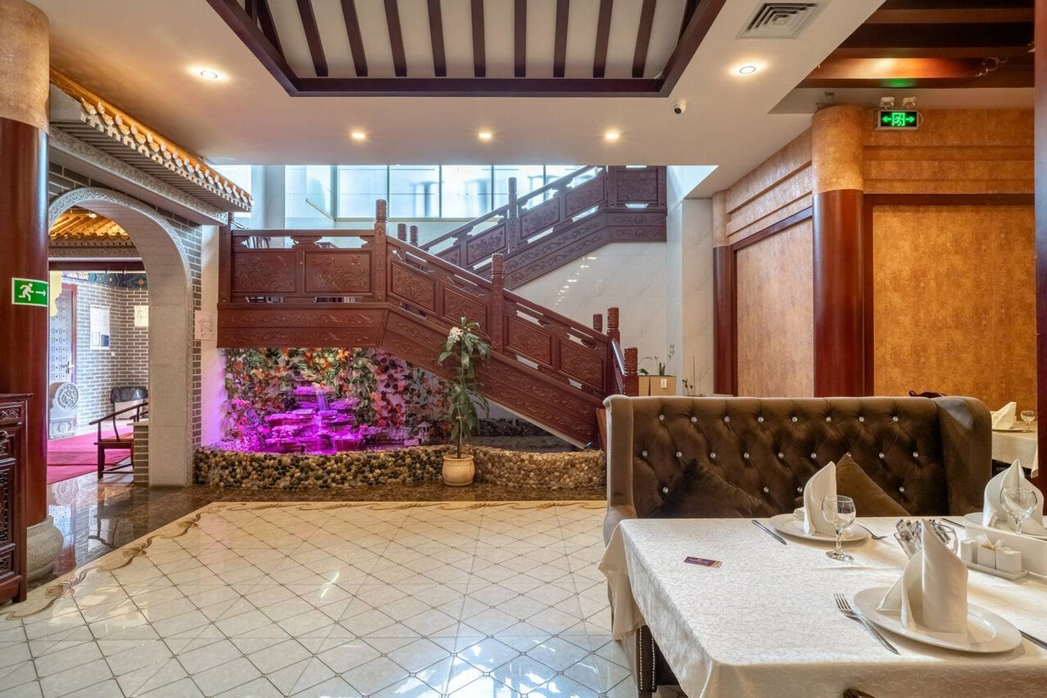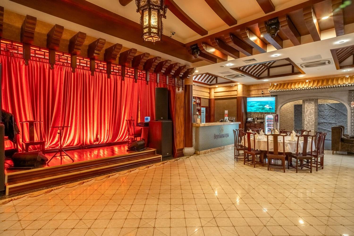 Атмосфера. Дизайн построен на строгих европейских линиях, которые гармонично переплетаются с восточной эстетикой. Кирпичные стены, светлые полы и арочные проемы соседствуют с деревянными темными столами, резными столбами с внутренней подсветкой и изящным орнаментом. Здесь проходят вечера с живой музыкой и развлекательной программой, также есть танцпол.