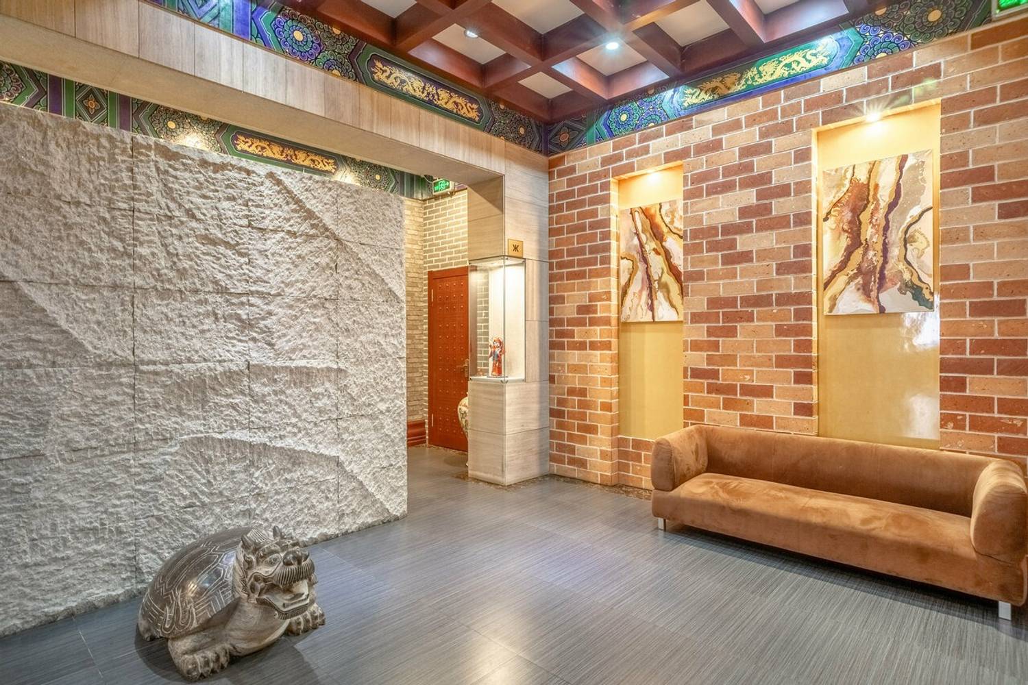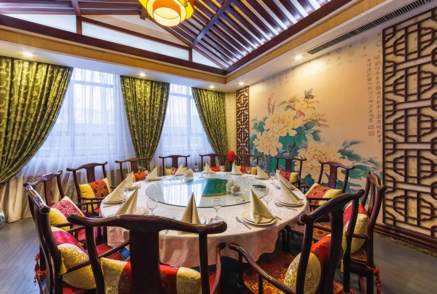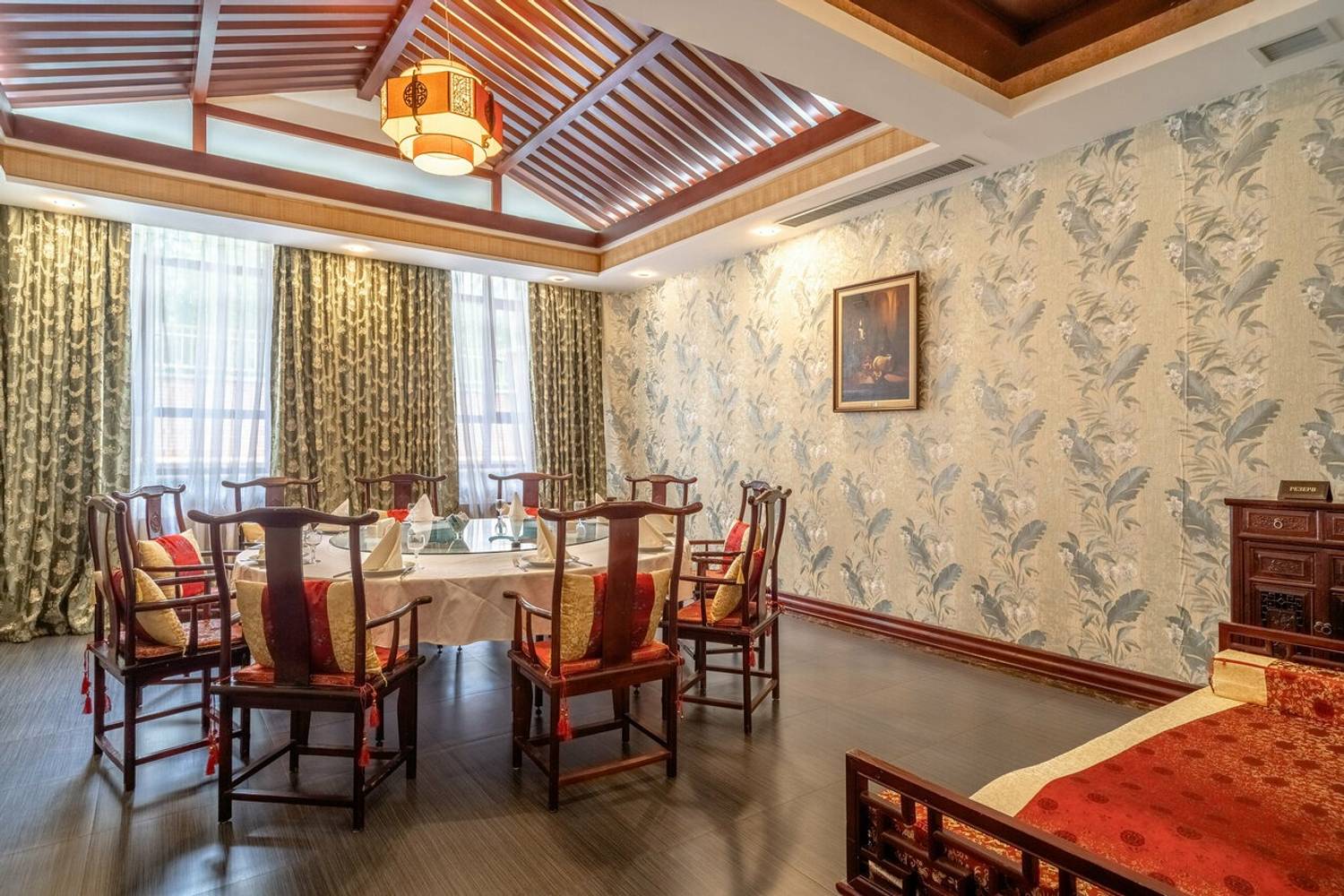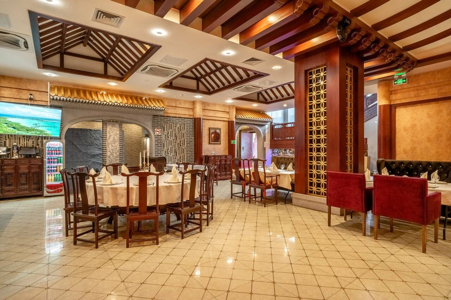 Атмосфера. Дизайн построен на строгих европейских линиях, которые гармонично переплетаются с восточной эстетикой. Кирпичные стены, светлые полы и арочные проемы соседствуют с деревянными темными столами, резными столбами с внутренней подсветкой и изящным орнаментом. Здесь проходят вечера с живой музыкой и развлекательной программой, также есть танцпол.