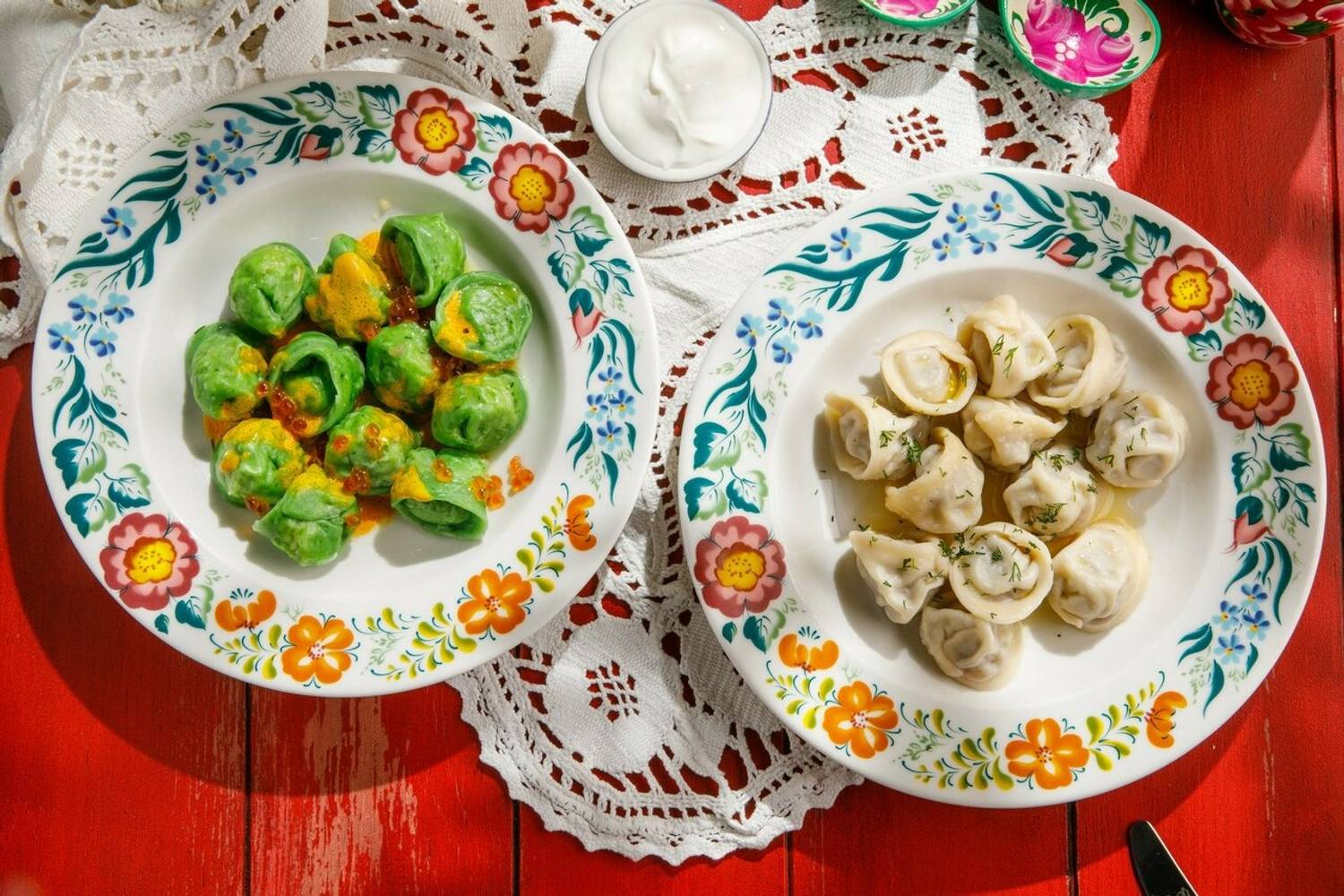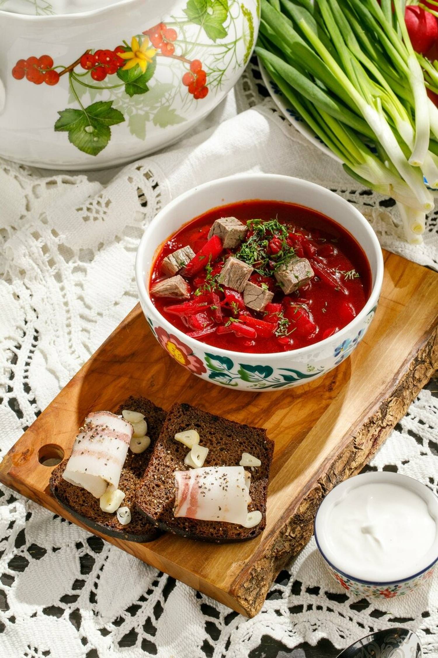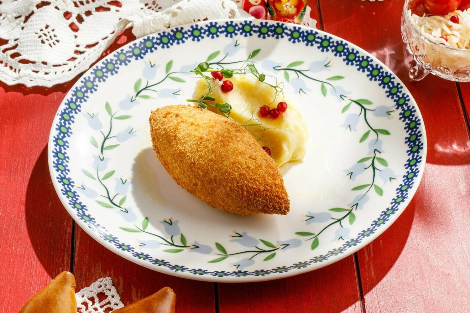 Еда и напитки. В меню — классика русской кухни: ассорти сала, бутерброд с балтийской килькой, салат с раковыми шейками, рассольник, пельмени из оленины с брусничным вареньем, макароны по-флотски.