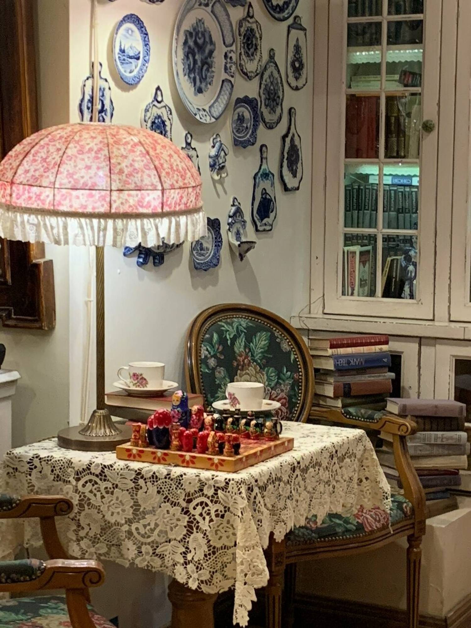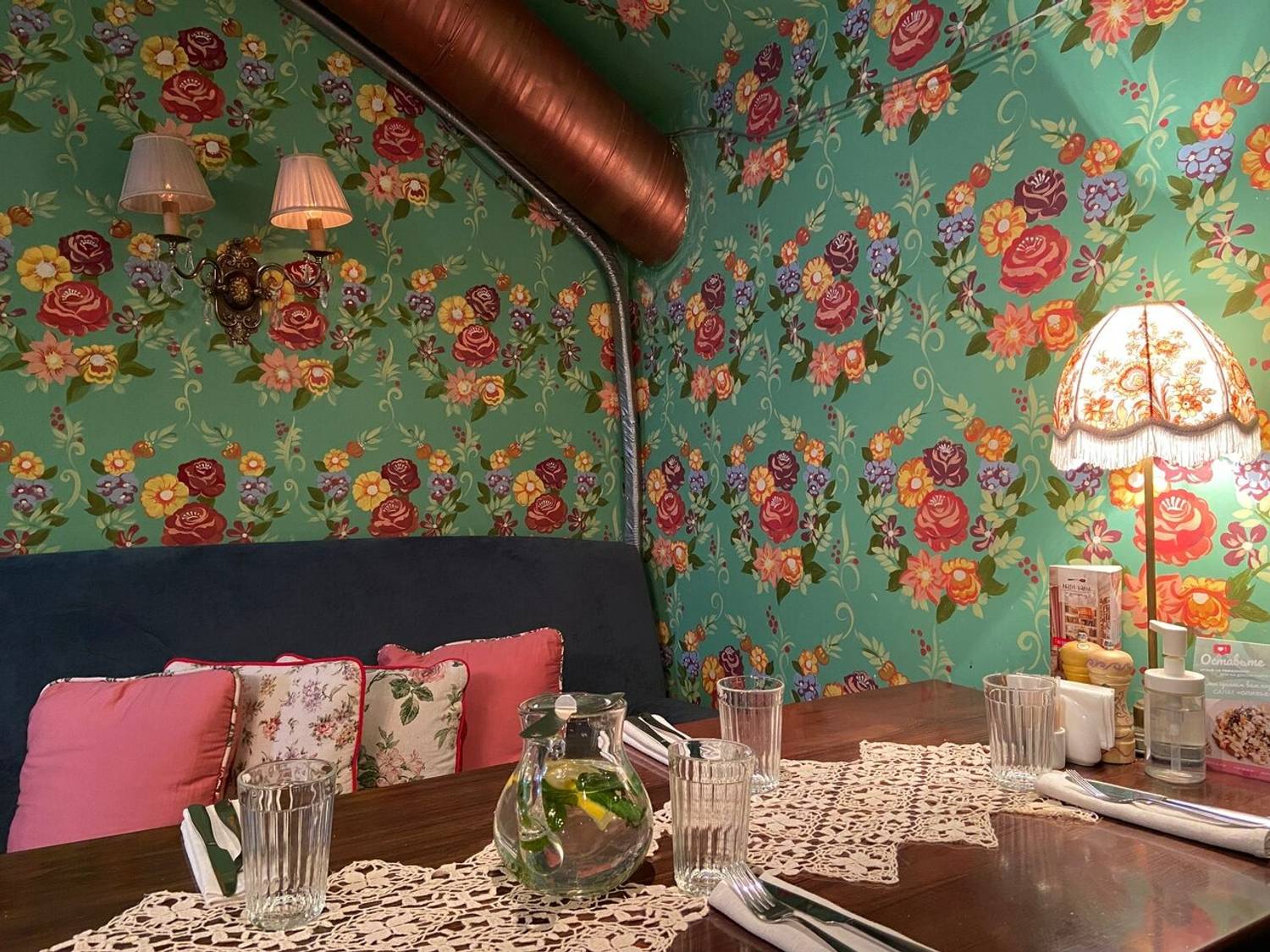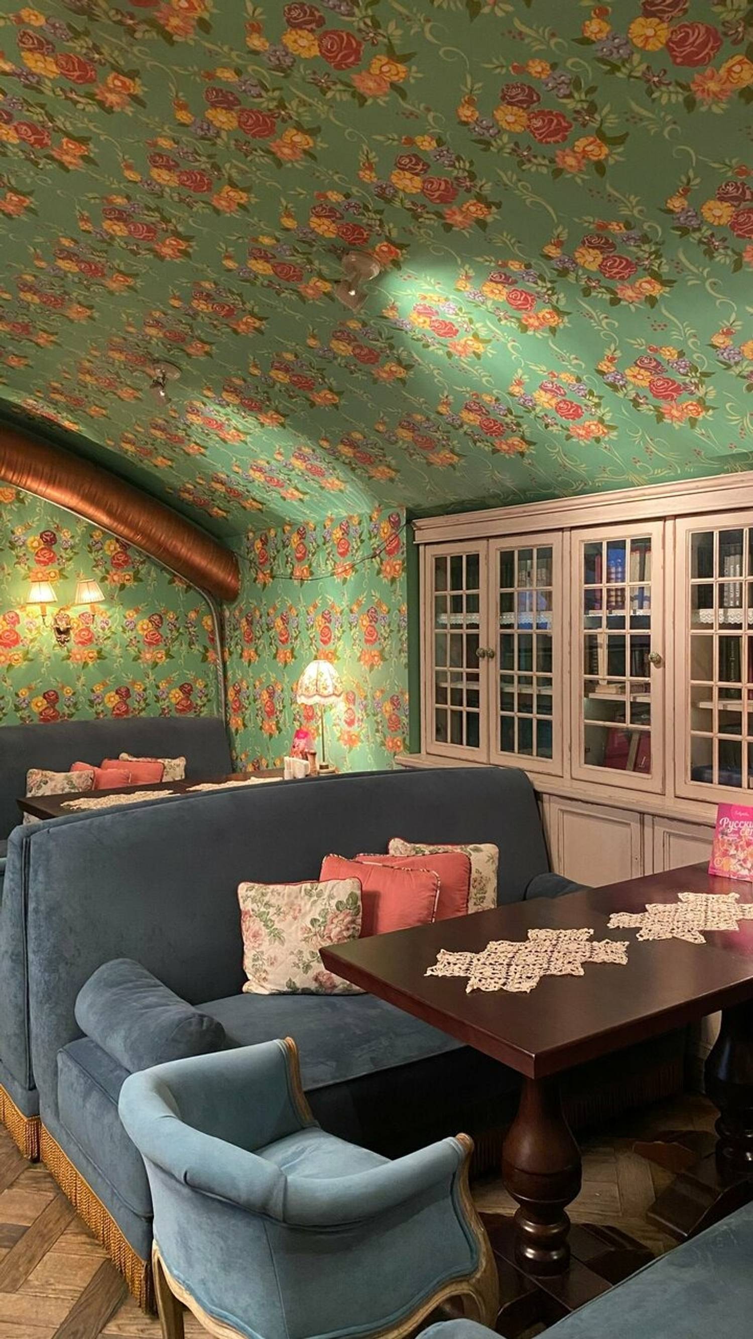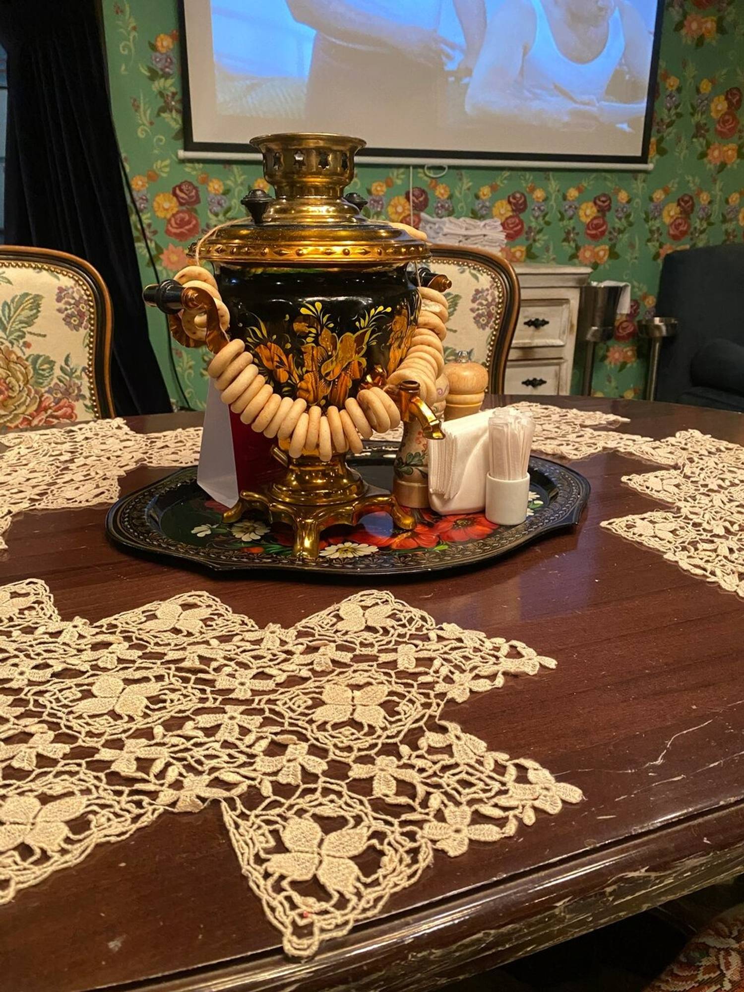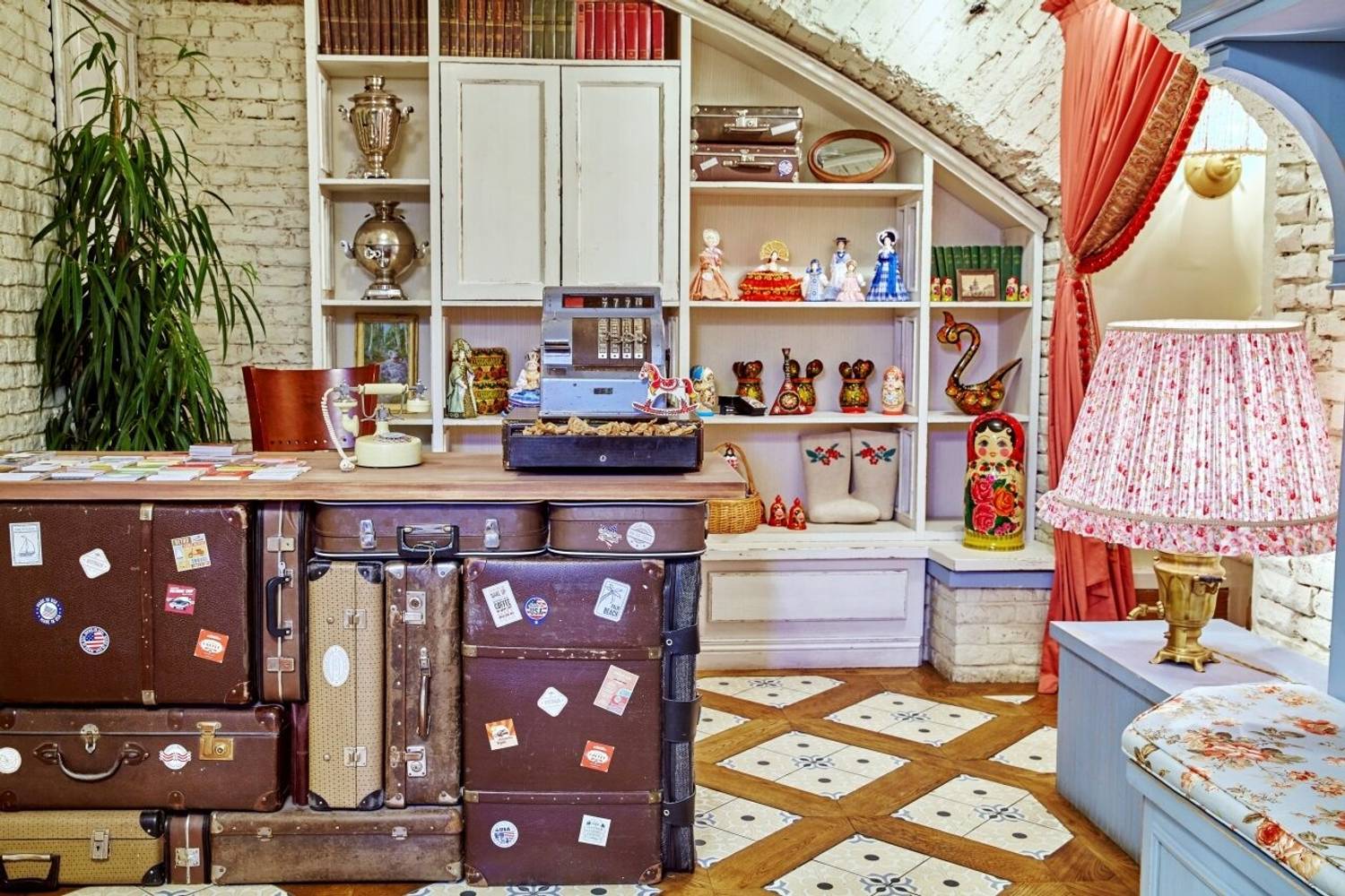 Атмосфера. Русский дореволюционный дух здесь передается за счет цветочных обоев, кружевных занавесок и буфетов с расписной посудой. Мебель тоже в советском стиле: диваны в павловопосадских платках, ситцевые абажуры и деревянные стулья.