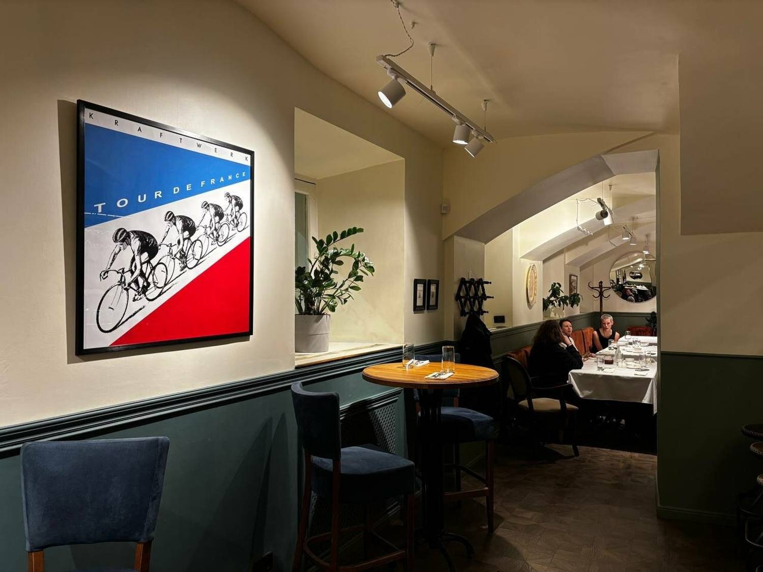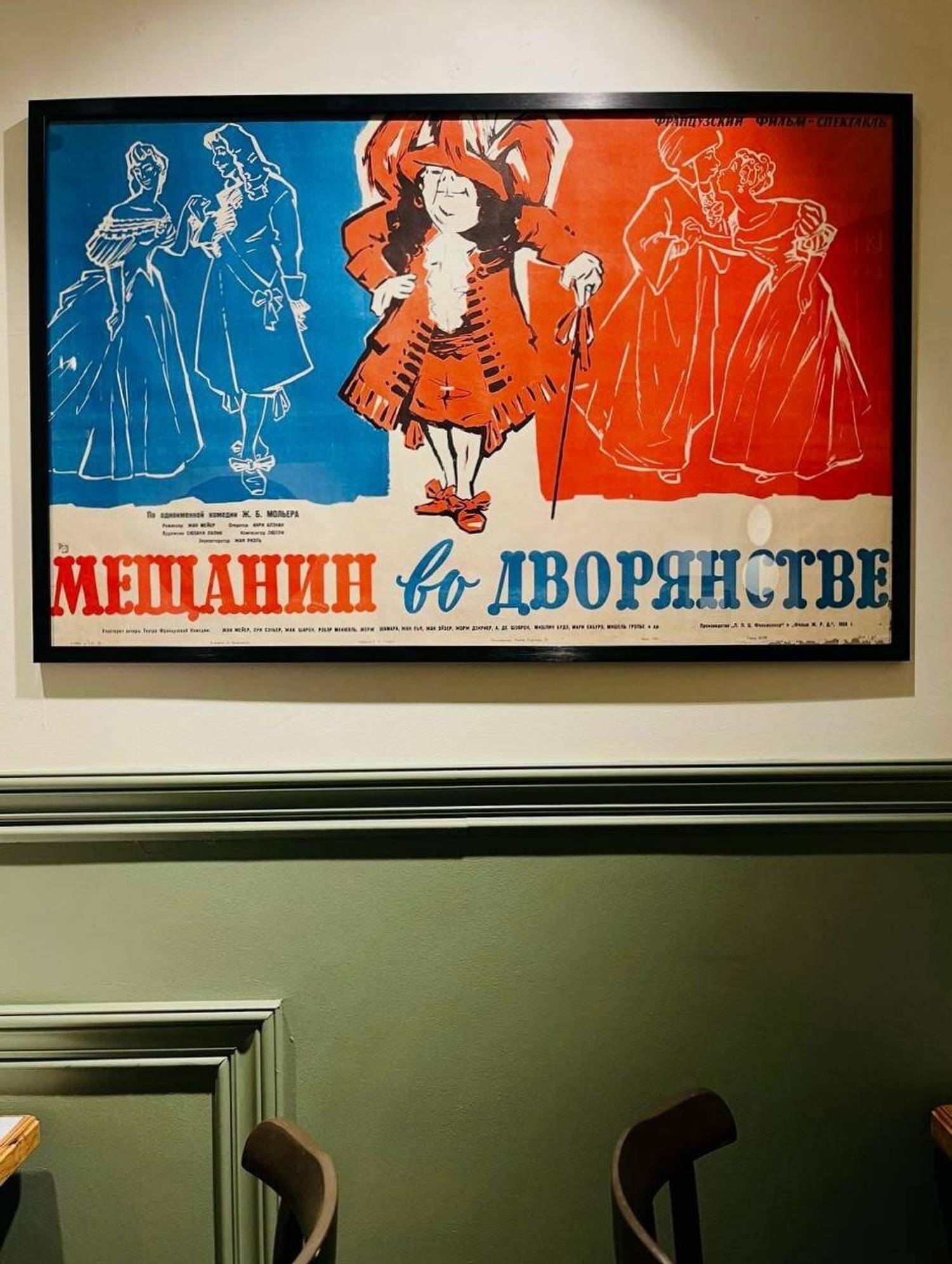 Атмосфера. Заведение создает ощущение интеллектуального и камерного салона, где ценится не только еда, но и искусство. Расположение между музеями, театрами и садами настраивает на философский лад. Интерьер выполнен в приглушенных серых и зеленых тонах, а на стенах висят советские афиши французских фильмов. Пространство делится на светлый зал для завтраков и обедов и уединенный бар для вечерних бесед о вине.
