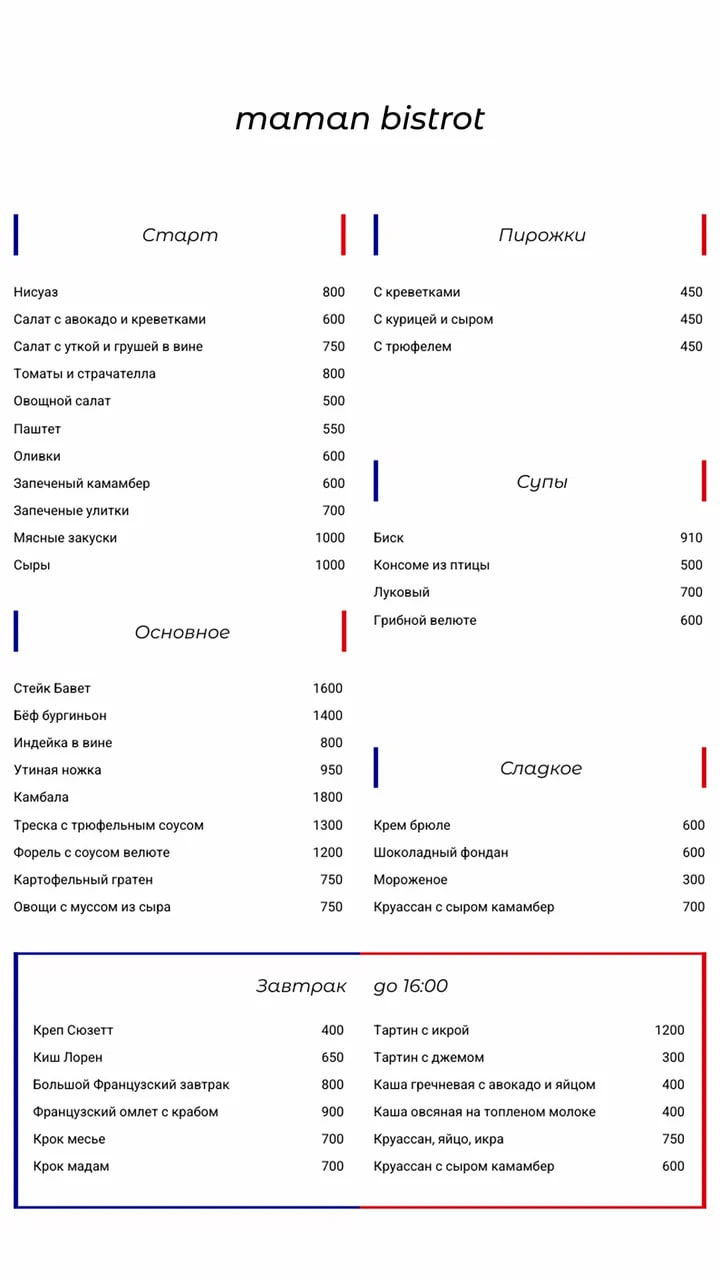 Maman Bistrot по адресу Конюшенный пер., 1/6 — это бар с культурными вечерами и акцентом на вино, расположенный в историческом сердце города. Концепция объединяет гастрономические традиции французской и русской кухни с программой поэтических чтений, выставок и музыкальных вечеров.