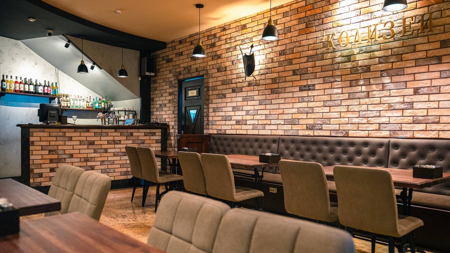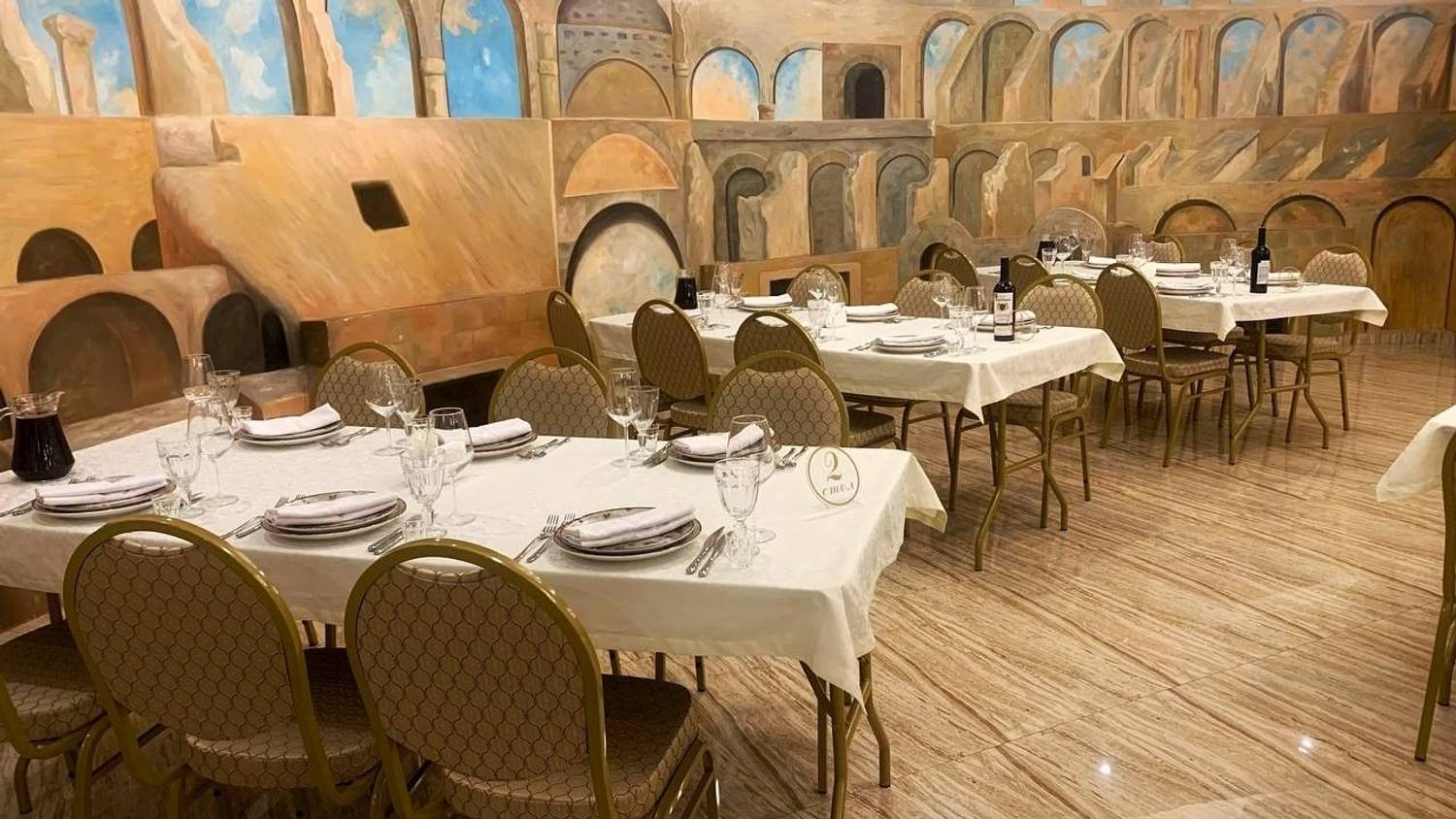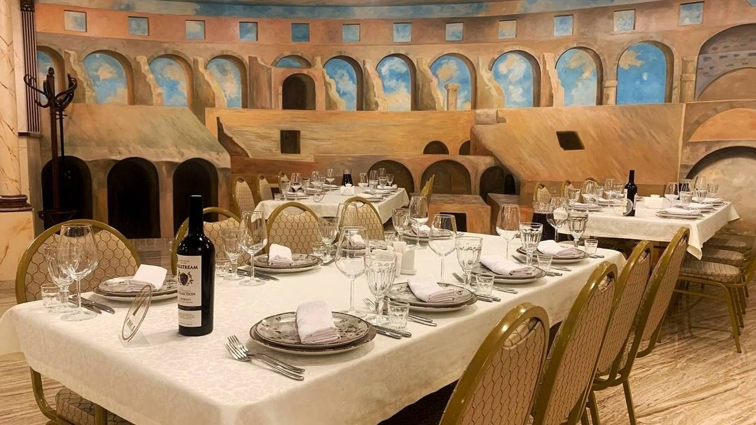 Атмосфера. В ресторане царит дух теплого и шумного застолья, где каждый гость чувствует себя желанным. Пространство разделено на два зала: светлый и торжественный основной зал с колоннами и настенной росписью, имитирующей настоящий колизей, и более камерный зал для семейных праздников. Отдельно стоящее здание, современное звуковое и световое оборудование, а также бесплатное караоке делают это место идеальным для банкетов и шумных мероприятий.