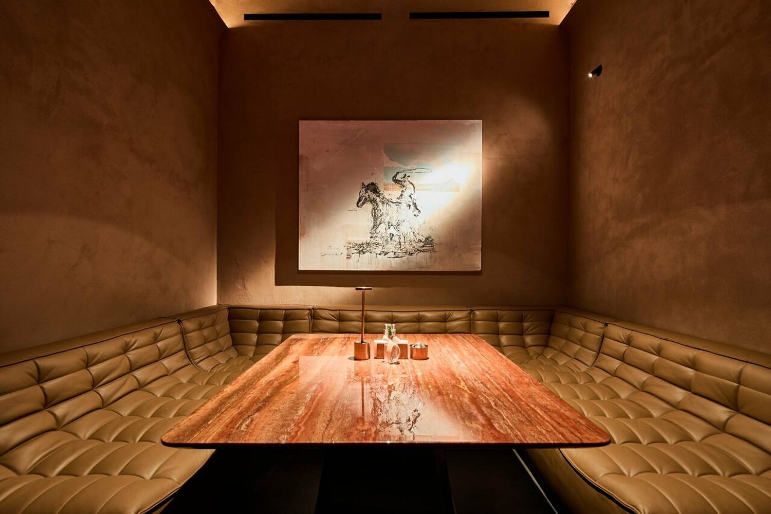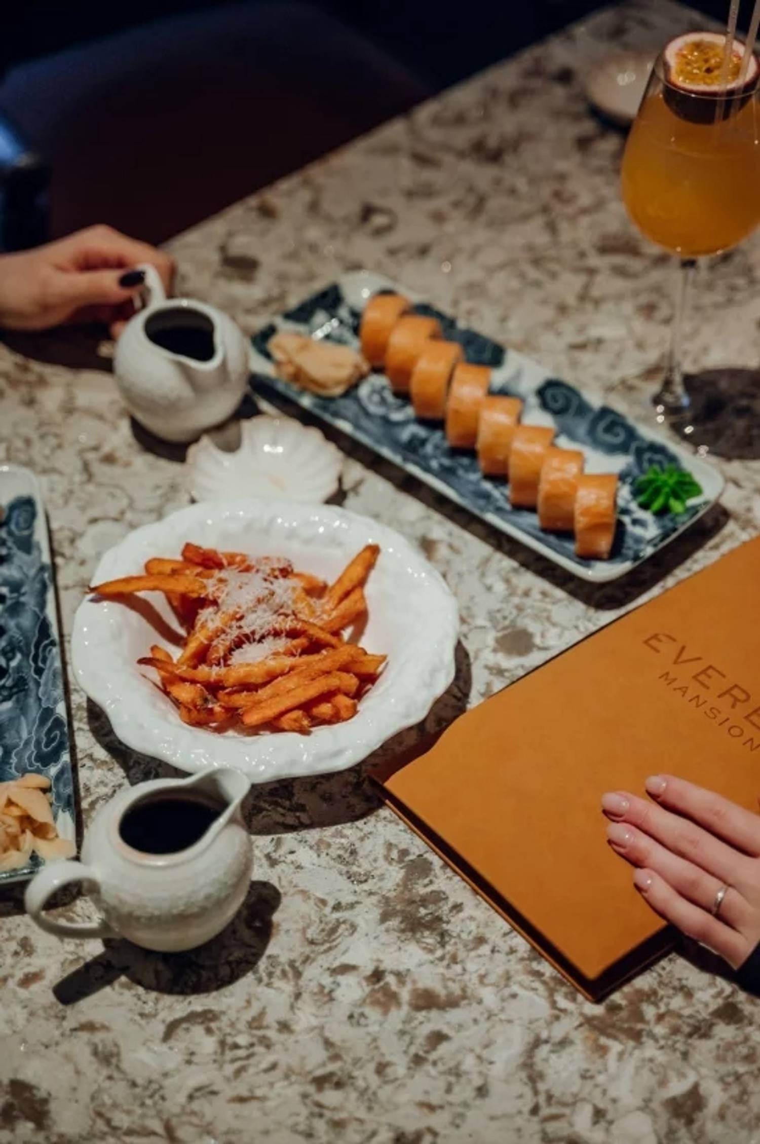 Еда и напитки. Меню представляет собой эклектичное сочетание блюд: от домашних пирожков и салата «Оливье» с лососем до авторских вариаций пасты Cacio e Pepe с крабом или рибаем. Особое внимание уделяется закускам и грилю: например, можно заказать тартар из говядины с угрем или стейк филе миньон. Отдельная гордость — аквариум со свежими морепродуктами: устрицами, морскими ежами и гребешками. Есть карта кальянов с мастерски подобранными миксами.