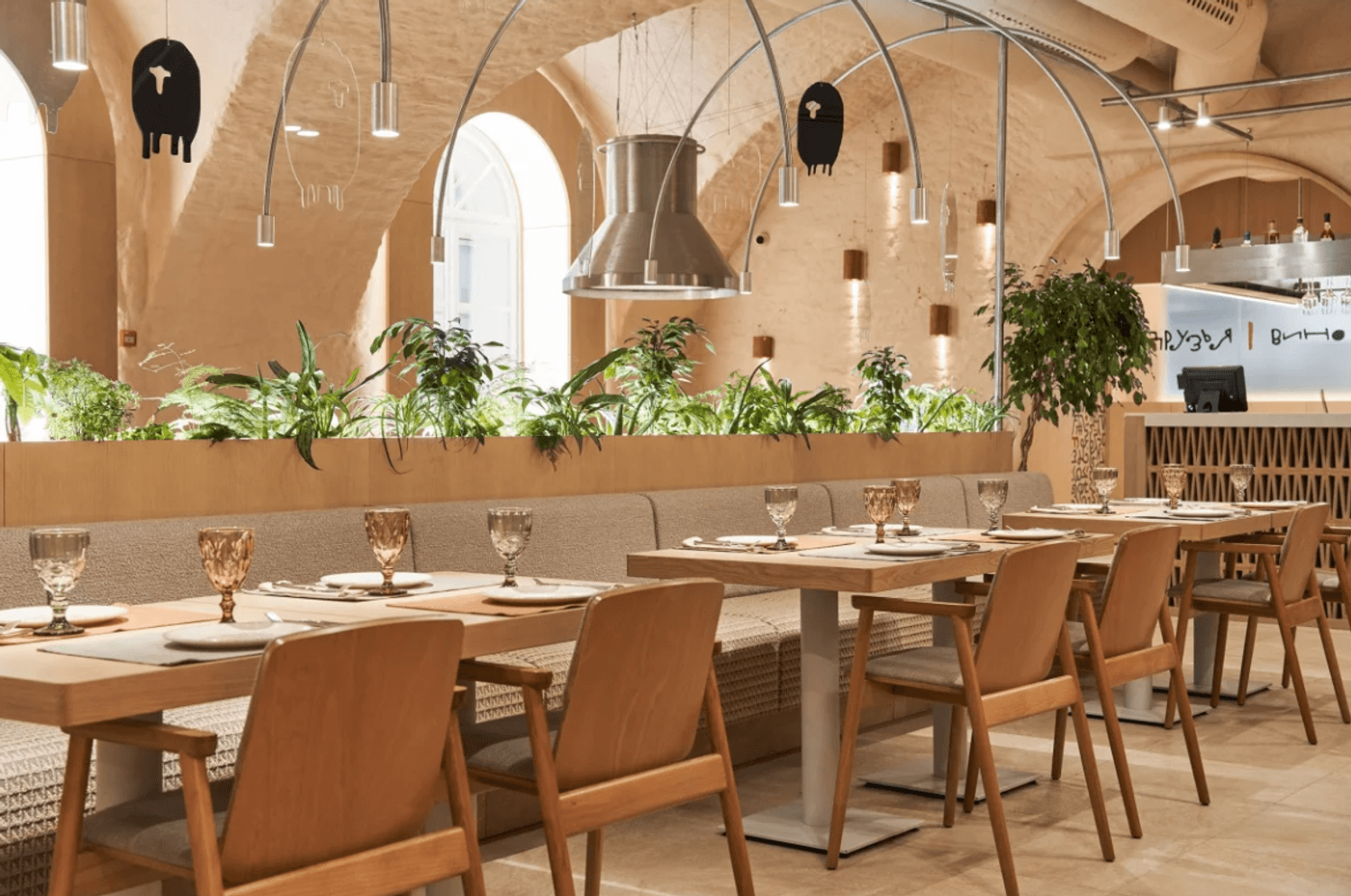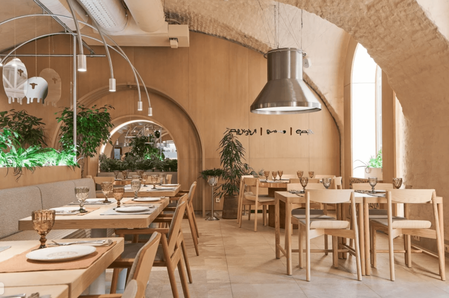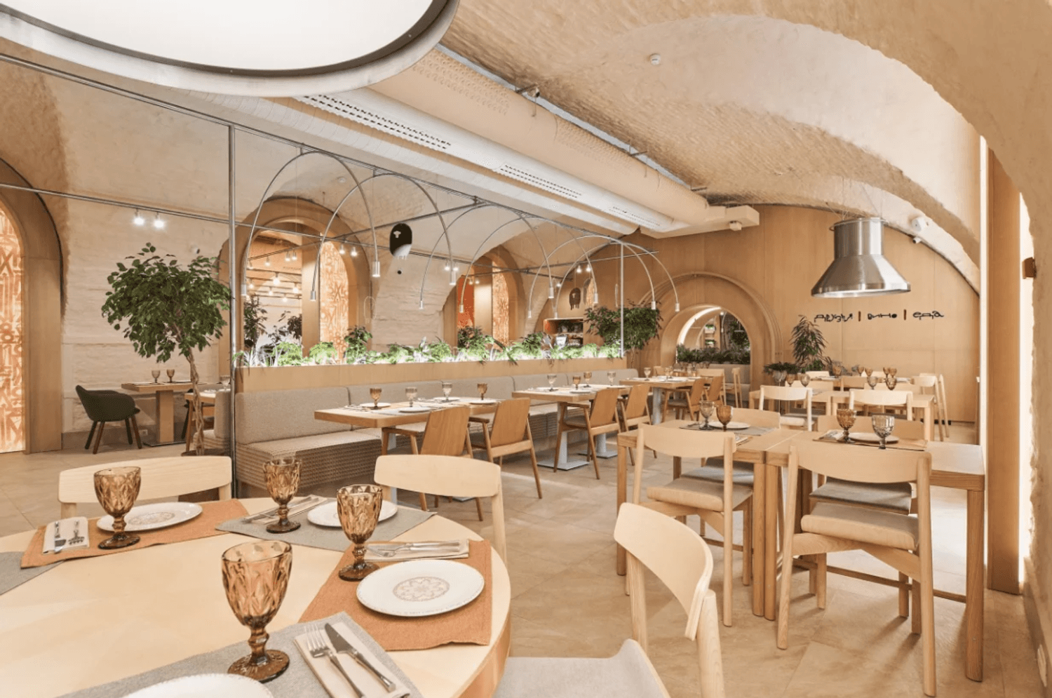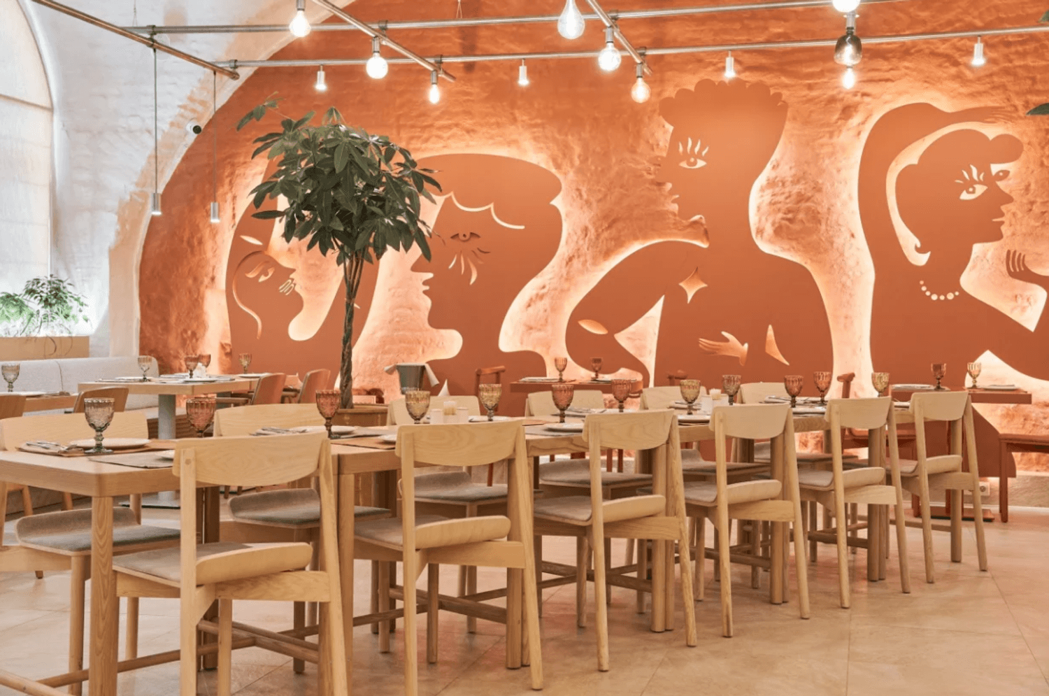 Атмосфера. Пространство сочетает минимализм с этническими акцентами: гранатовые детали, керамика, фактурный текстиль и обилие зелени создают стильный и гостеприимный образ. Светлый терракотовый зал с узорами и продуманным освещением отражает самобытность культур, а световое панно с танцующими людьми притягивает взгляд.