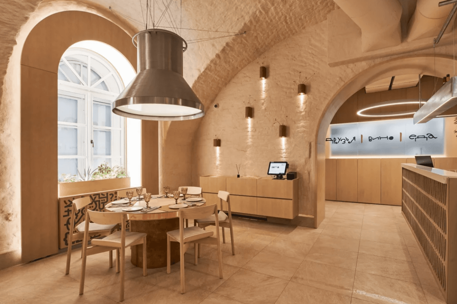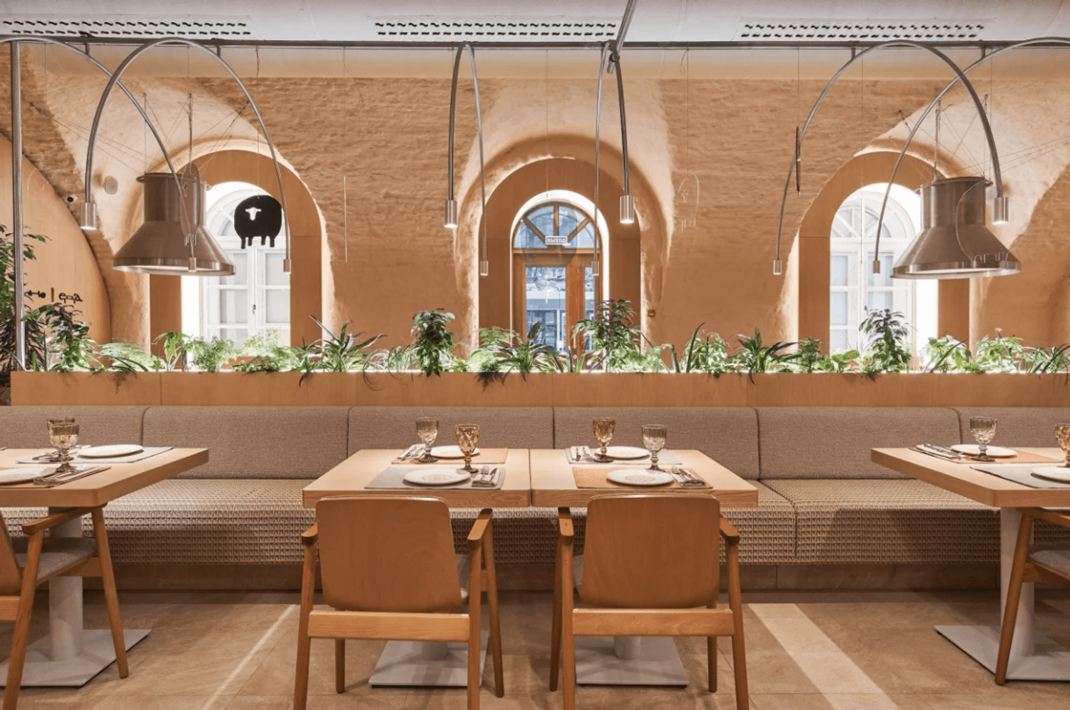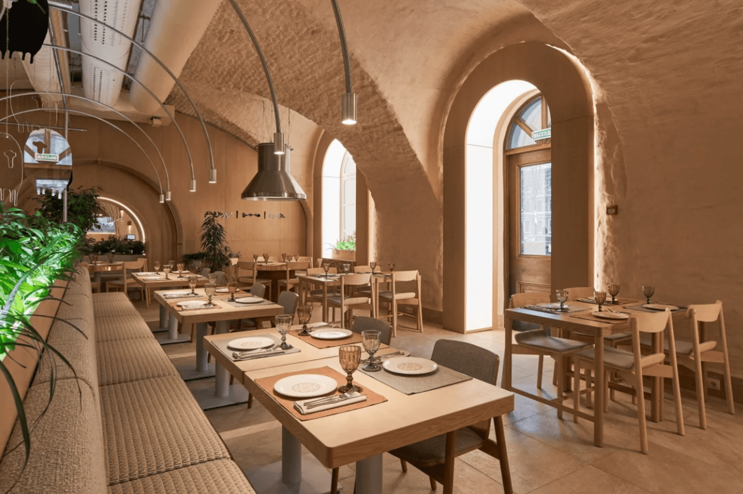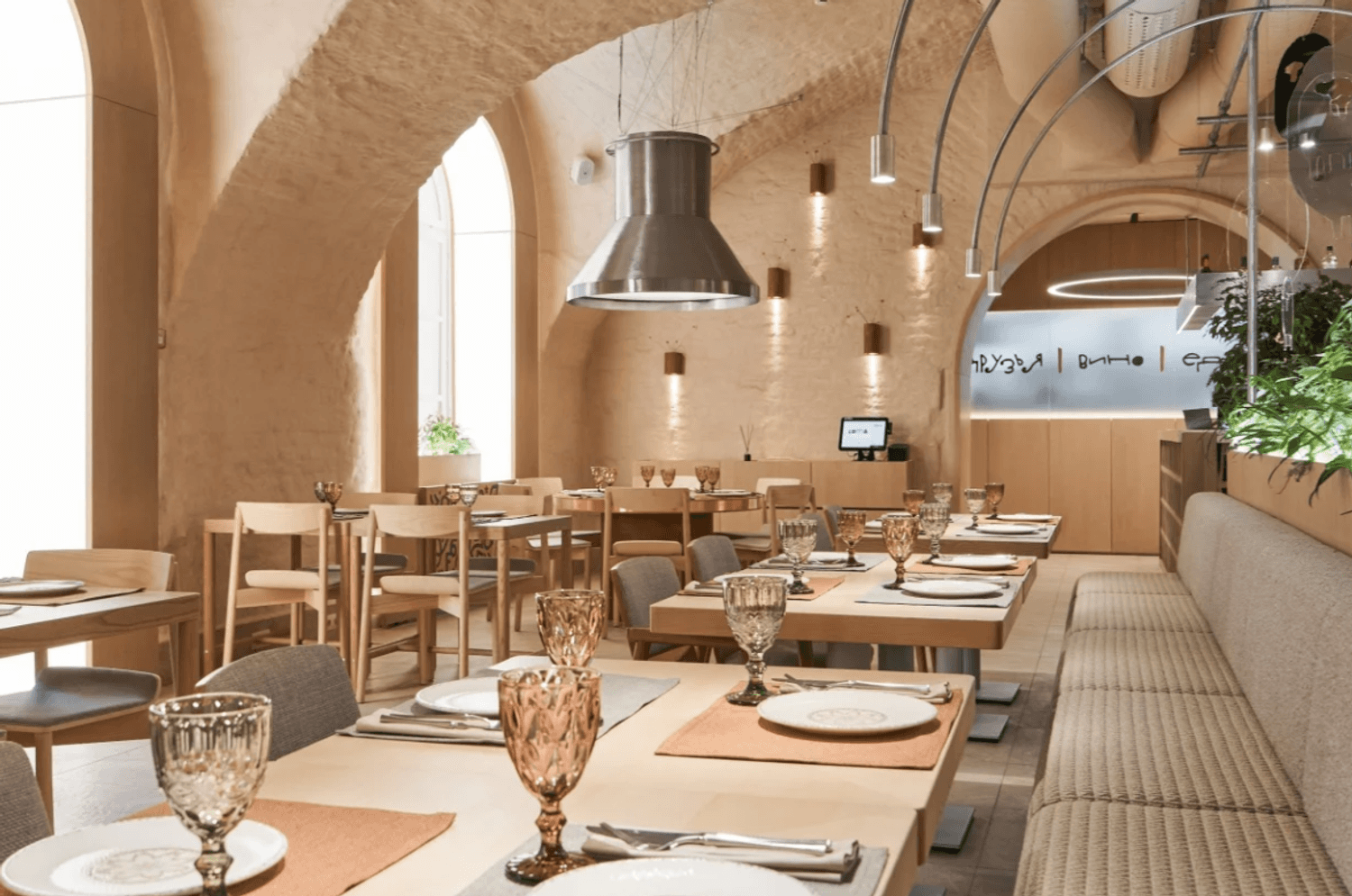 Атмосфера. Пространство сочетает минимализм с этническими акцентами: гранатовые детали, керамика, фактурный текстиль и обилие зелени создают стильный и гостеприимный образ. Светлый терракотовый зал с узорами и продуманным освещением отражает самобытность культур, а световое панно с танцующими людьми притягивает взгляд.
