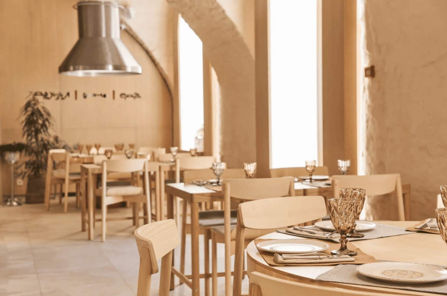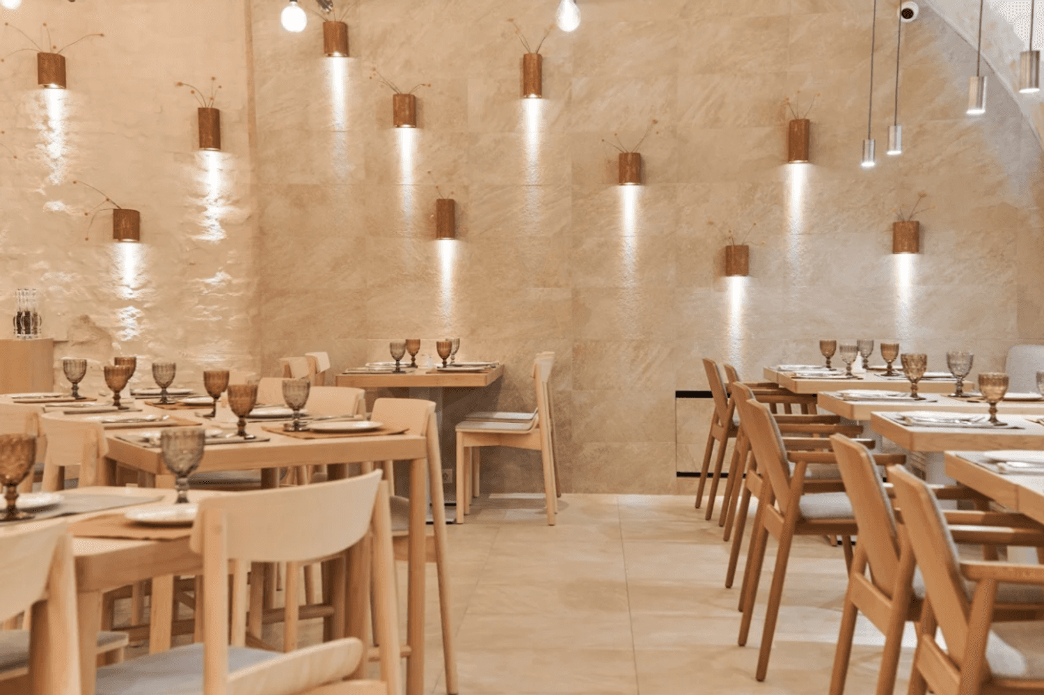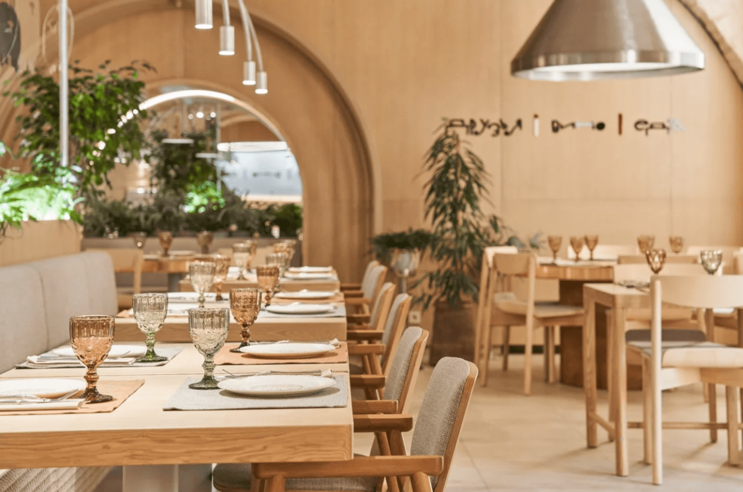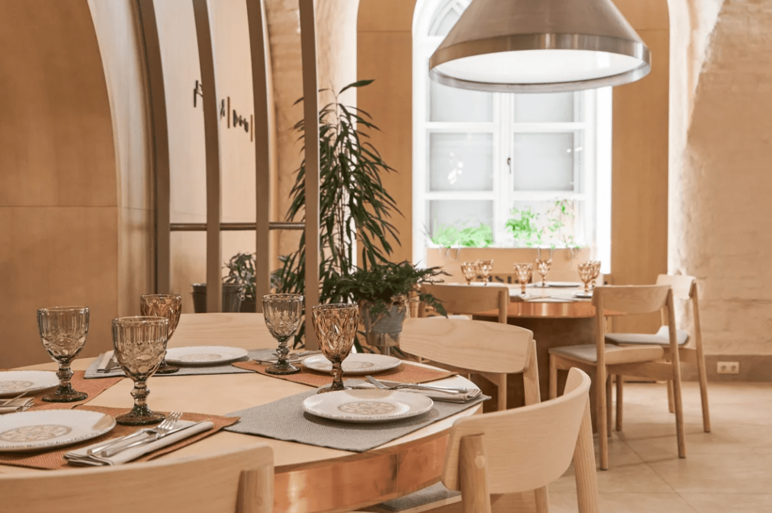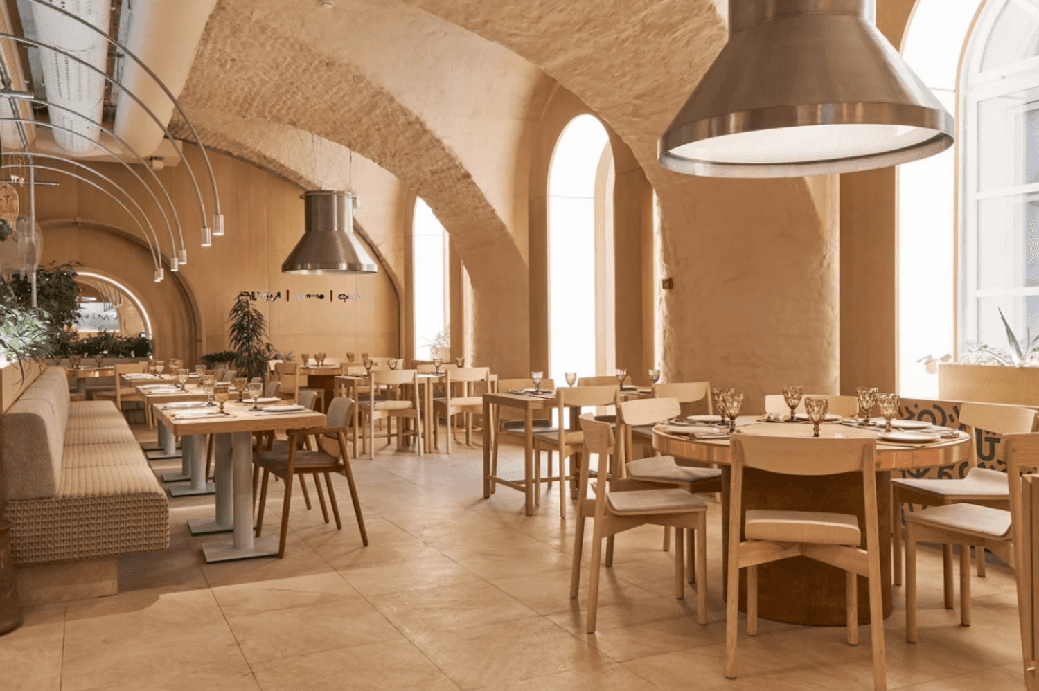 Атмосфера. Пространство сочетает минимализм с этническими акцентами: гранатовые детали, керамика, фактурный текстиль и обилие зелени создают стильный и гостеприимный образ. Светлый терракотовый зал с узорами и продуманным освещением отражает самобытность культур, а световое панно с танцующими людьми притягивает взгляд.