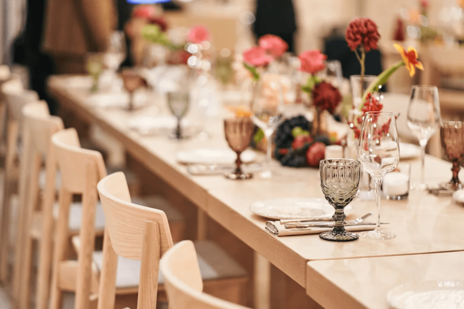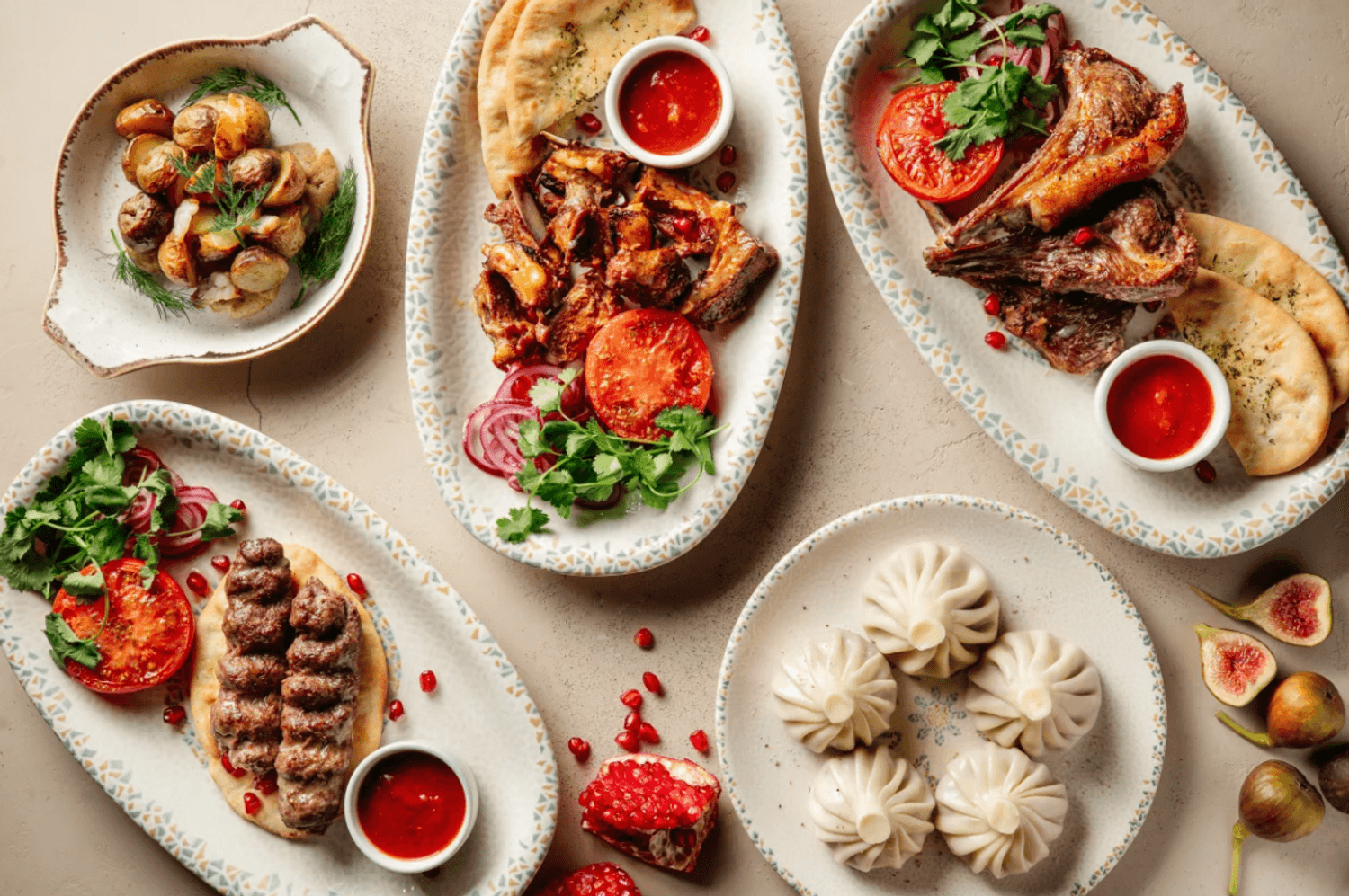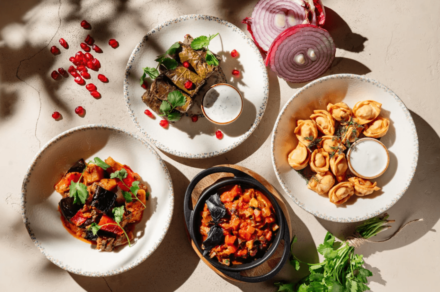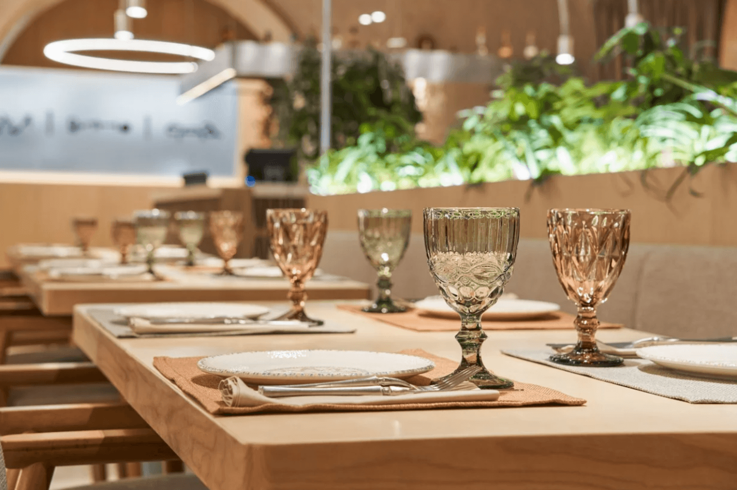 Атмосфера. Пространство сочетает минимализм с этническими акцентами: гранатовые детали, керамика, фактурный текстиль и обилие зелени создают стильный и гостеприимный образ. Светлый терракотовый зал с узорами и продуманным освещением отражает самобытность культур, а световое панно с танцующими людьми притягивает взгляд.
