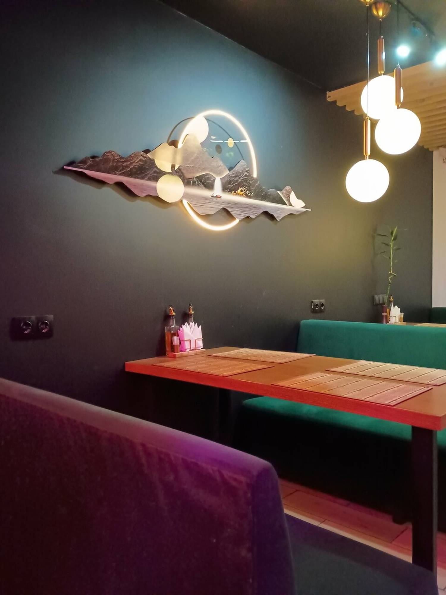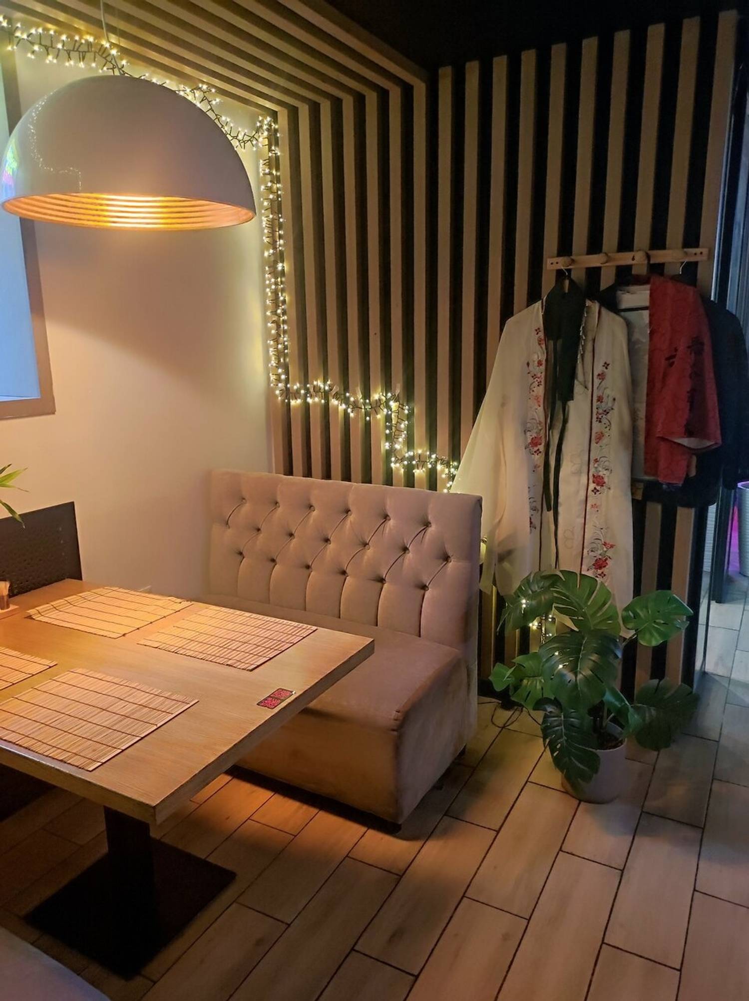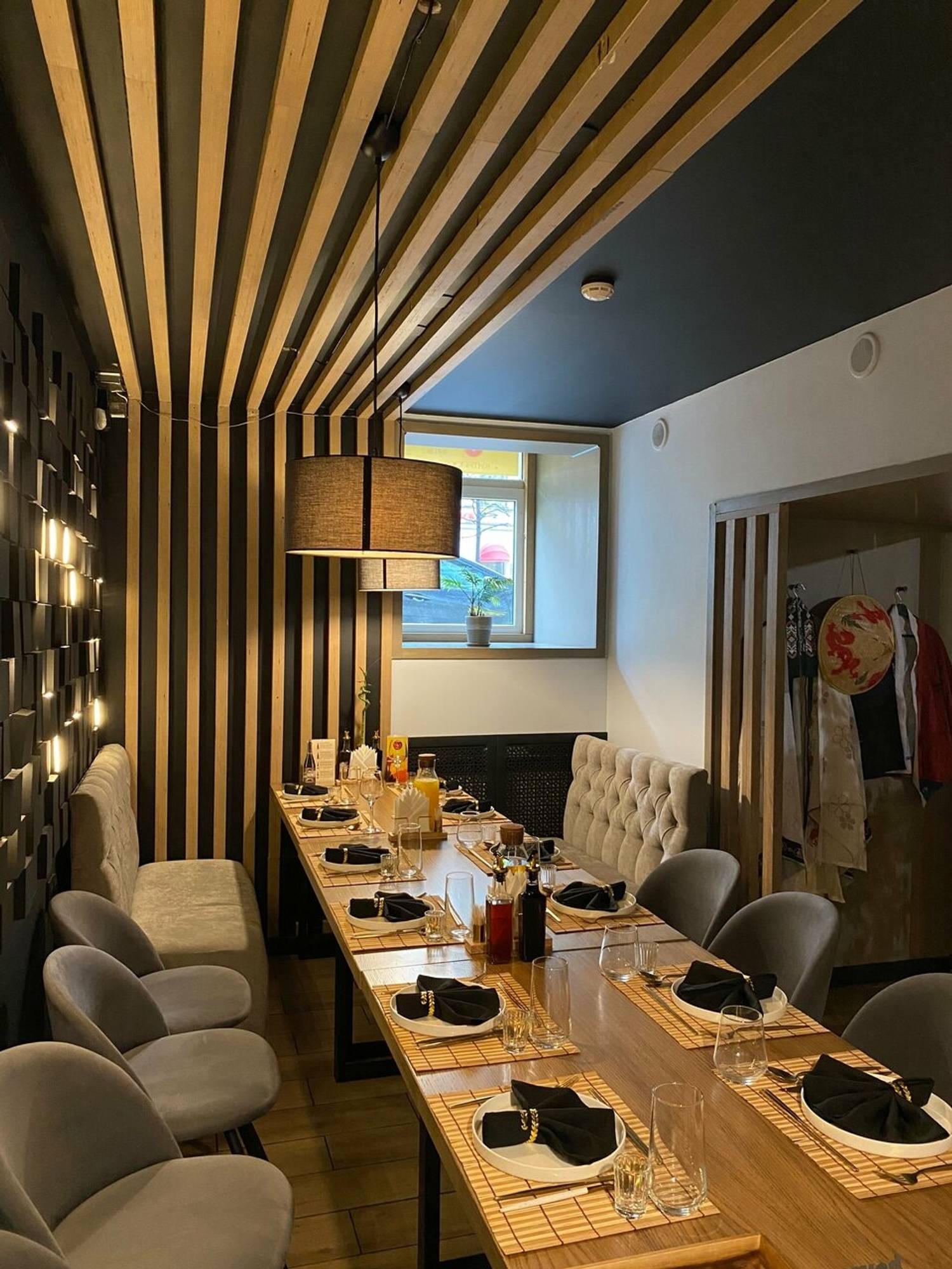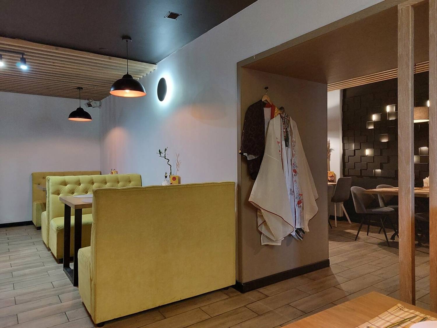 Атмосфера. Пространство ресторана погружает в стилизованную, но ненавязчивую восточную атмосферу. Интерьер оформлен с использованием характерных элементов: декоративных светильников, неоновых акцентов, деревянных перегородок и традиционных символов. Желающие могут даже примерить кимоно для полного погружения в атмосферу. Зонирование создает уютные уголки, где удобно расположиться как большой компанией друзей, так и парой.