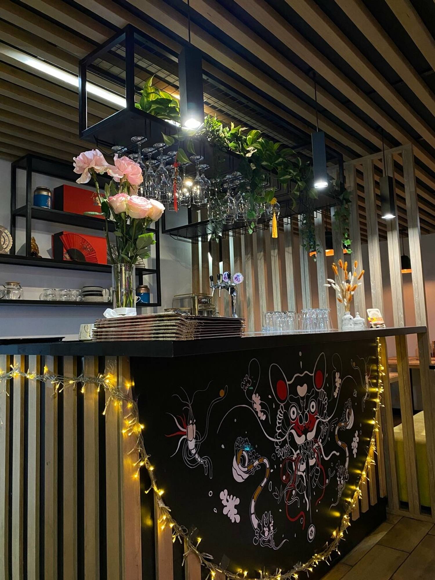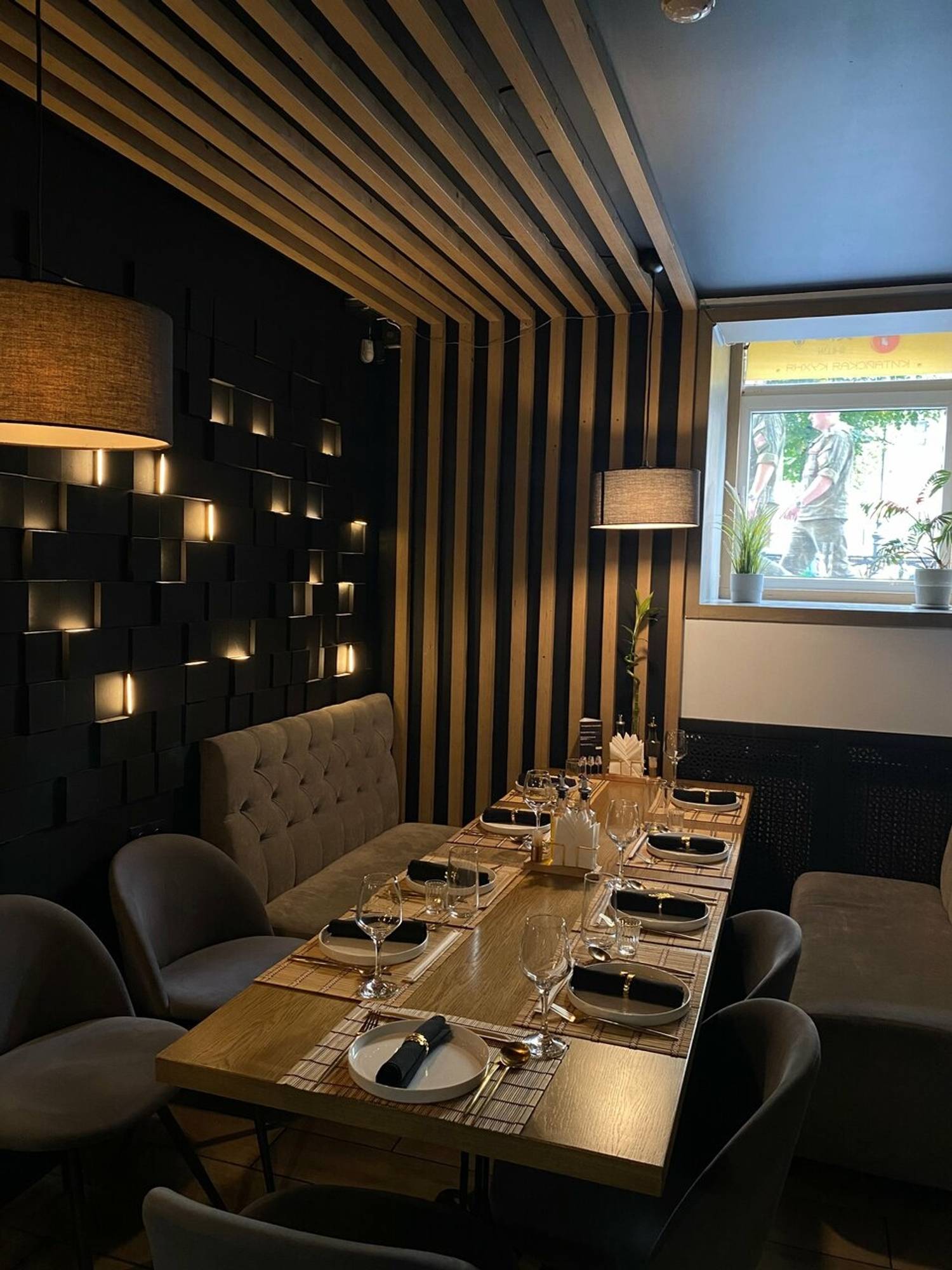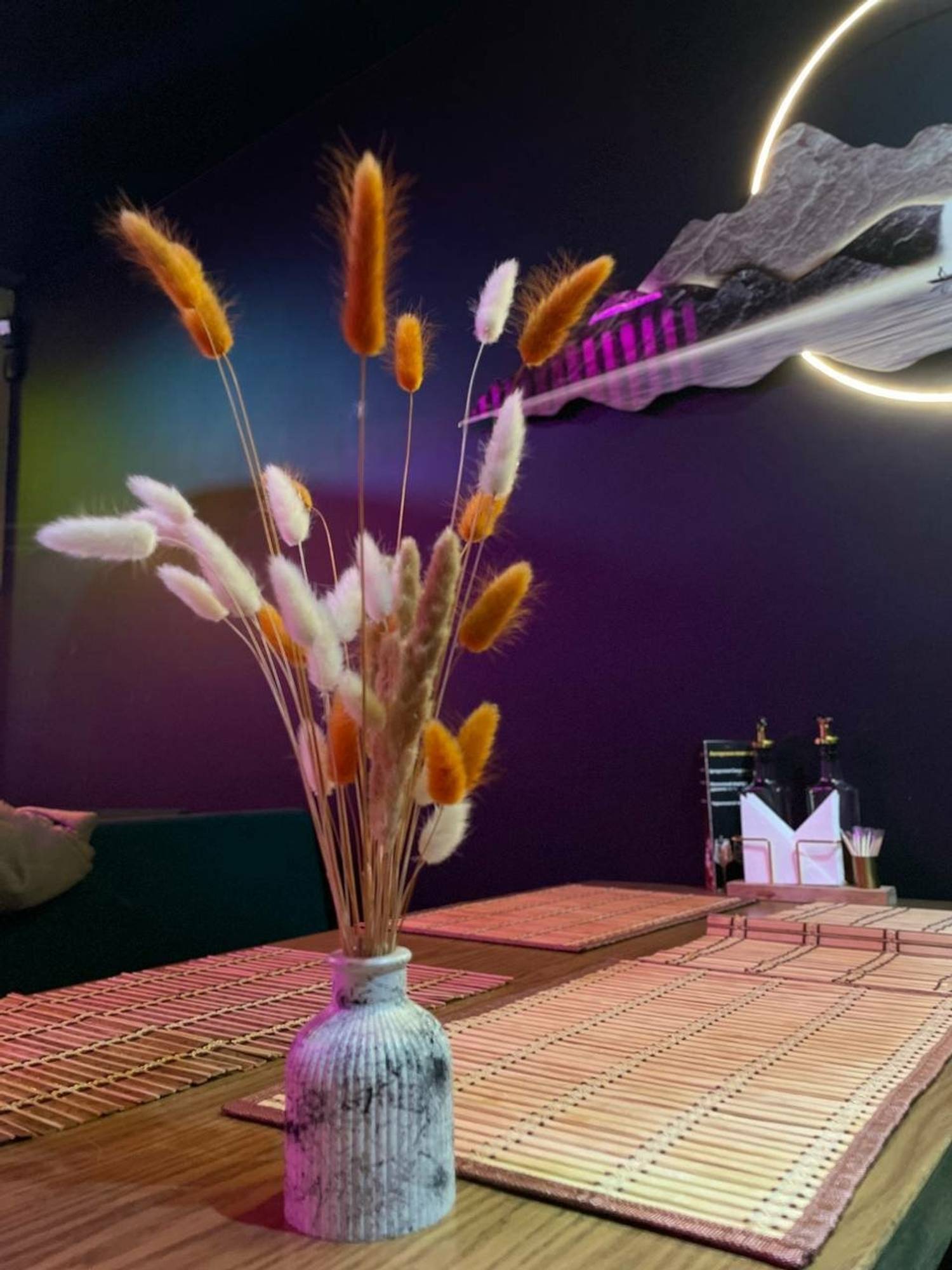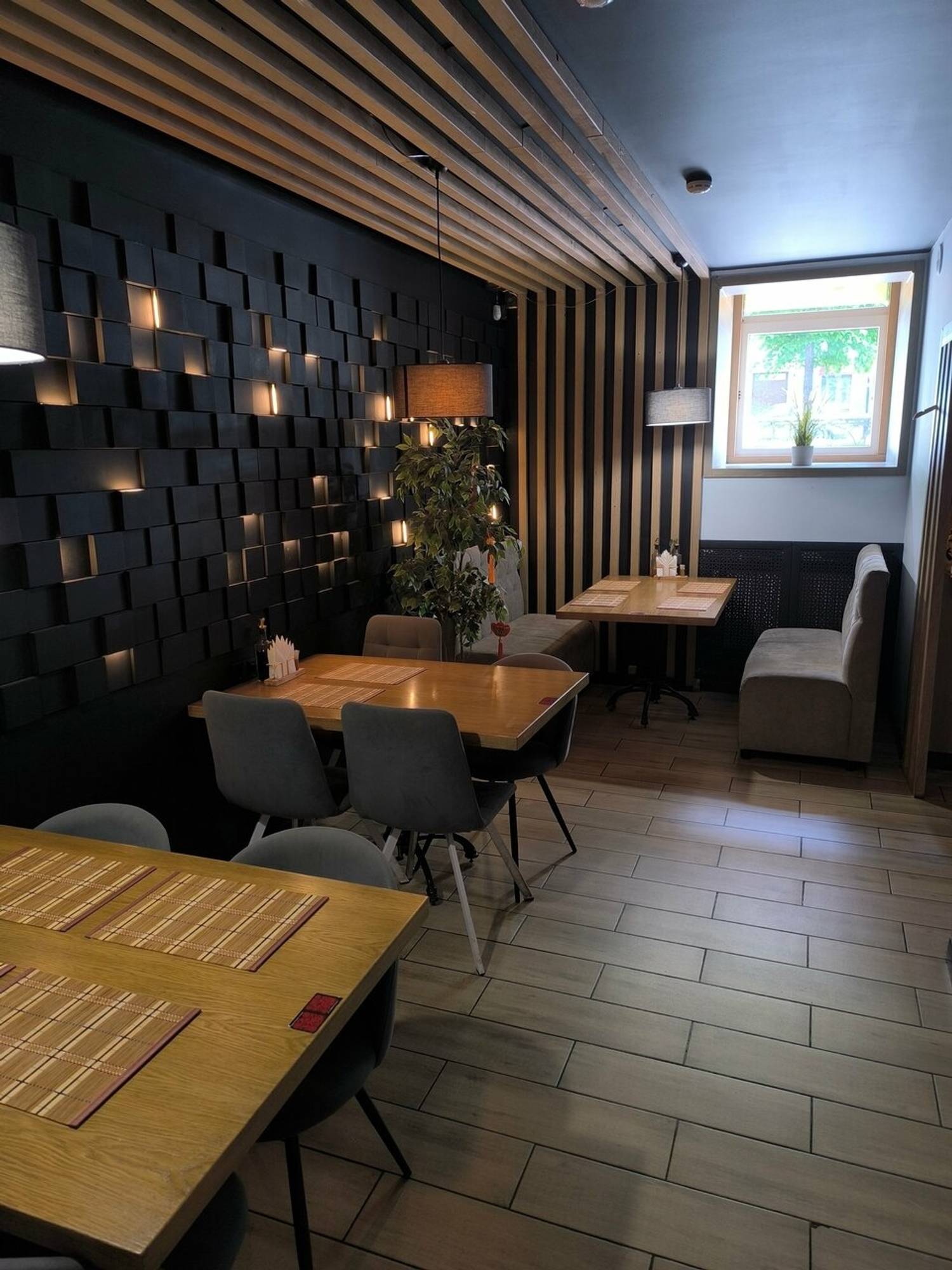 Атмосфера. Пространство ресторана погружает в стилизованную, но ненавязчивую восточную атмосферу. Интерьер оформлен с использованием характерных элементов: декоративных светильников, неоновых акцентов, деревянных перегородок и традиционных символов. Желающие могут даже примерить кимоно для полного погружения в атмосферу. Зонирование создает уютные уголки, где удобно расположиться как большой компанией друзей, так и парой.