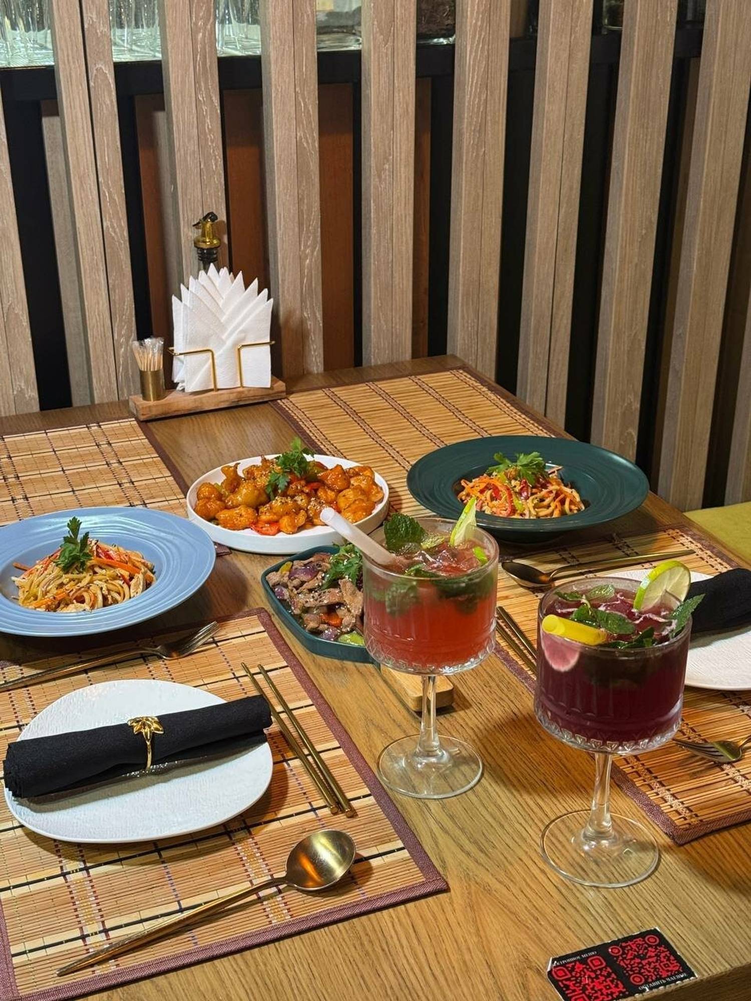 Еда и напитки. В меню собрали широкий спектр классических азиатских позиций. Среди закусок выделяются острые битые огурцы и салат из маринованных свиных ушек. На горячее можно заказать хрустящую утку, жареную лапшу со свининой или пестрый рис. В будни с 12:00 до 16:00 гостям предлагают комплексные бизнес-ланчи, включающие суп, салат, основное блюдо и напиток. Десерты в основном представлены европейскими вариантами: можно заказать, например, чизкейк «Нью-Йорк».