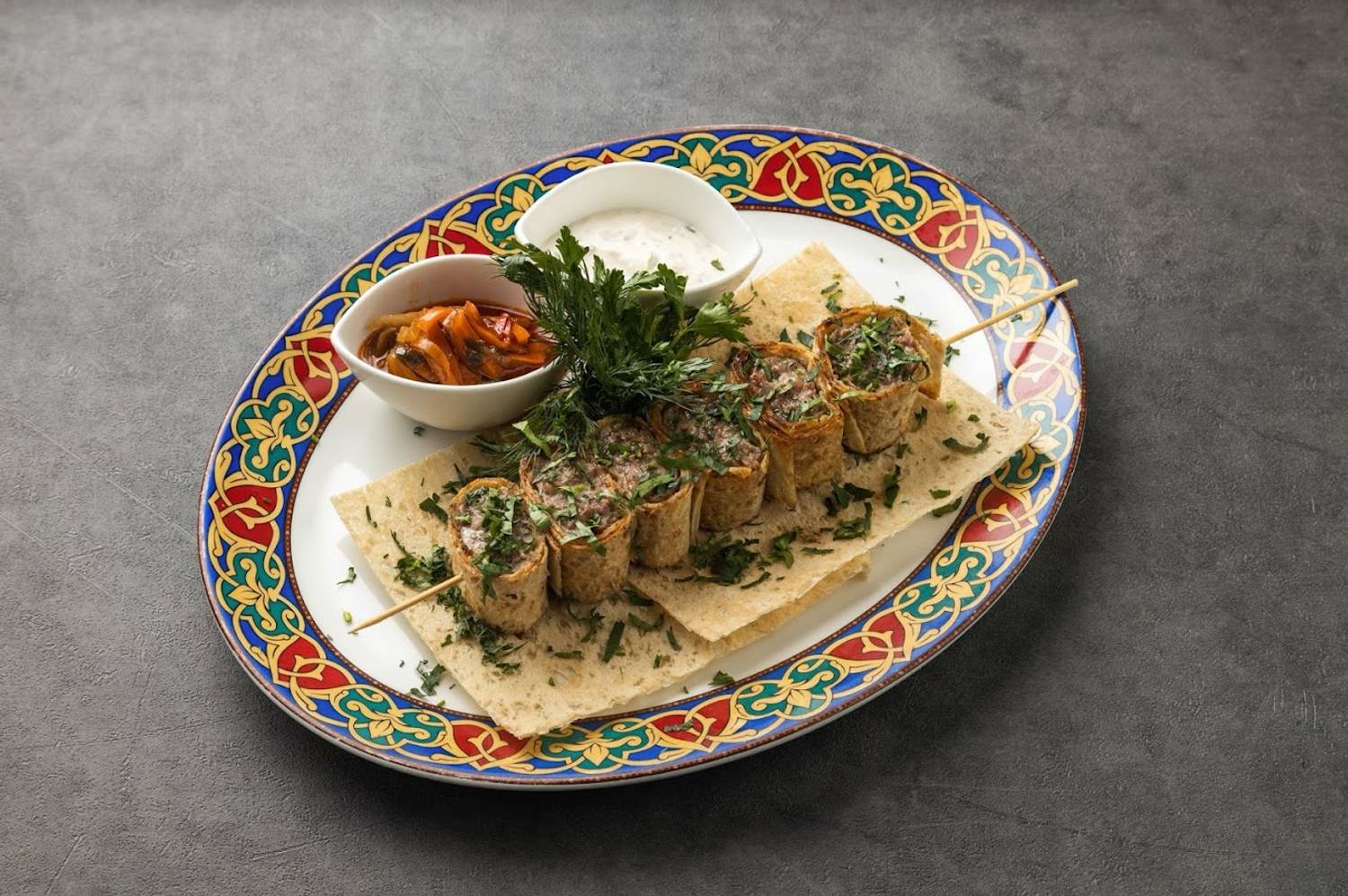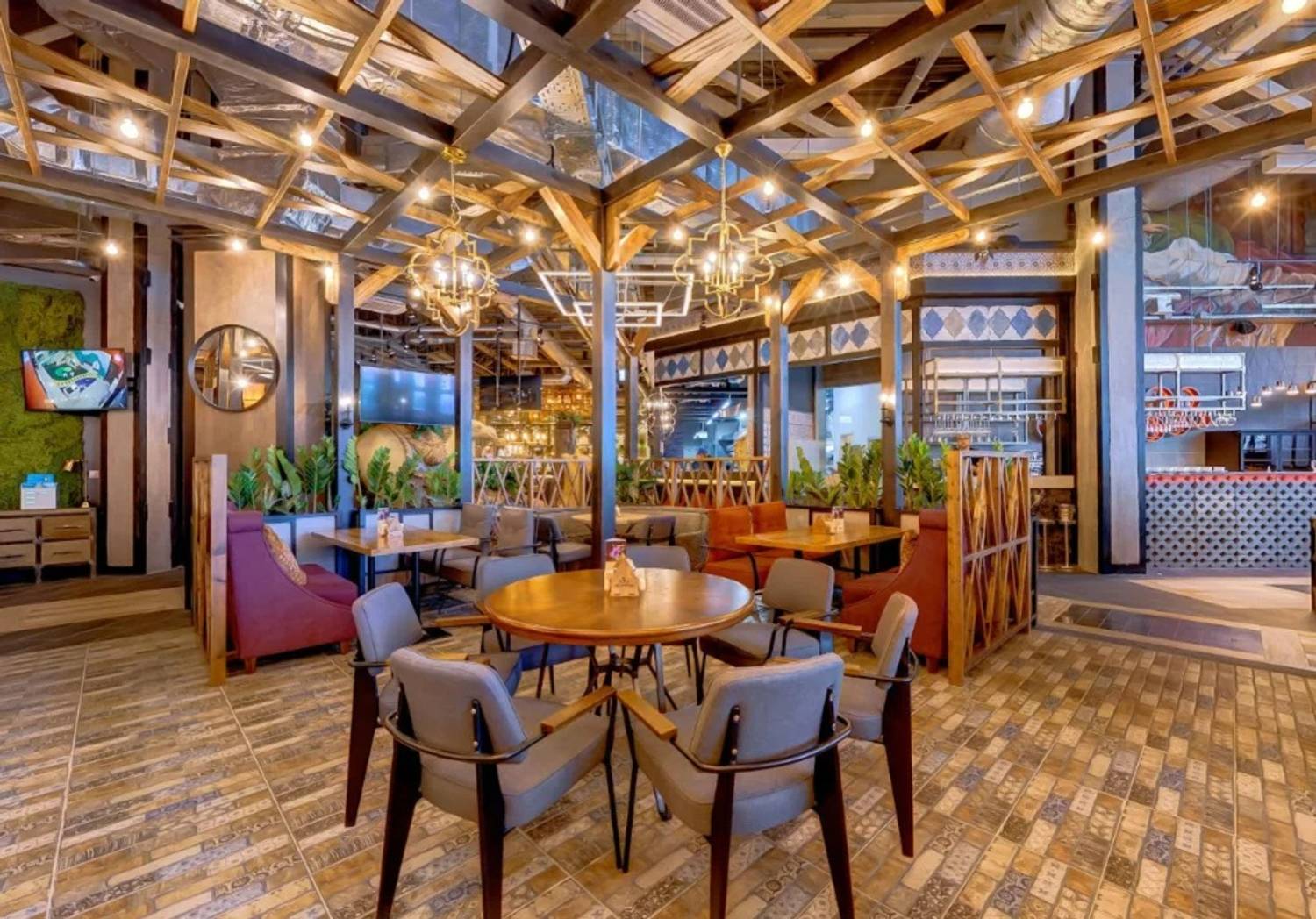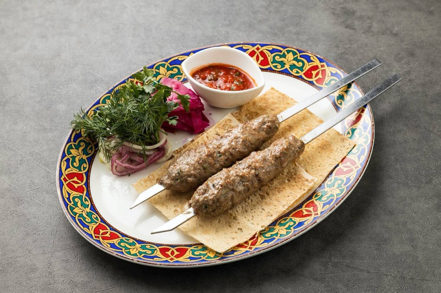 Еда и напитки. В меню — пицца с куриным шашлыком, хачапури чахракина, хычин с картофелем, сыром и луком, жареная чучвара, жареные митболы с сыром, баклажан по-сербски, кайнатма шурпа. Из десертов есть торт-рулет из шоколадного бисквита и крем-чиза с шоколадом и творожная гибаница.