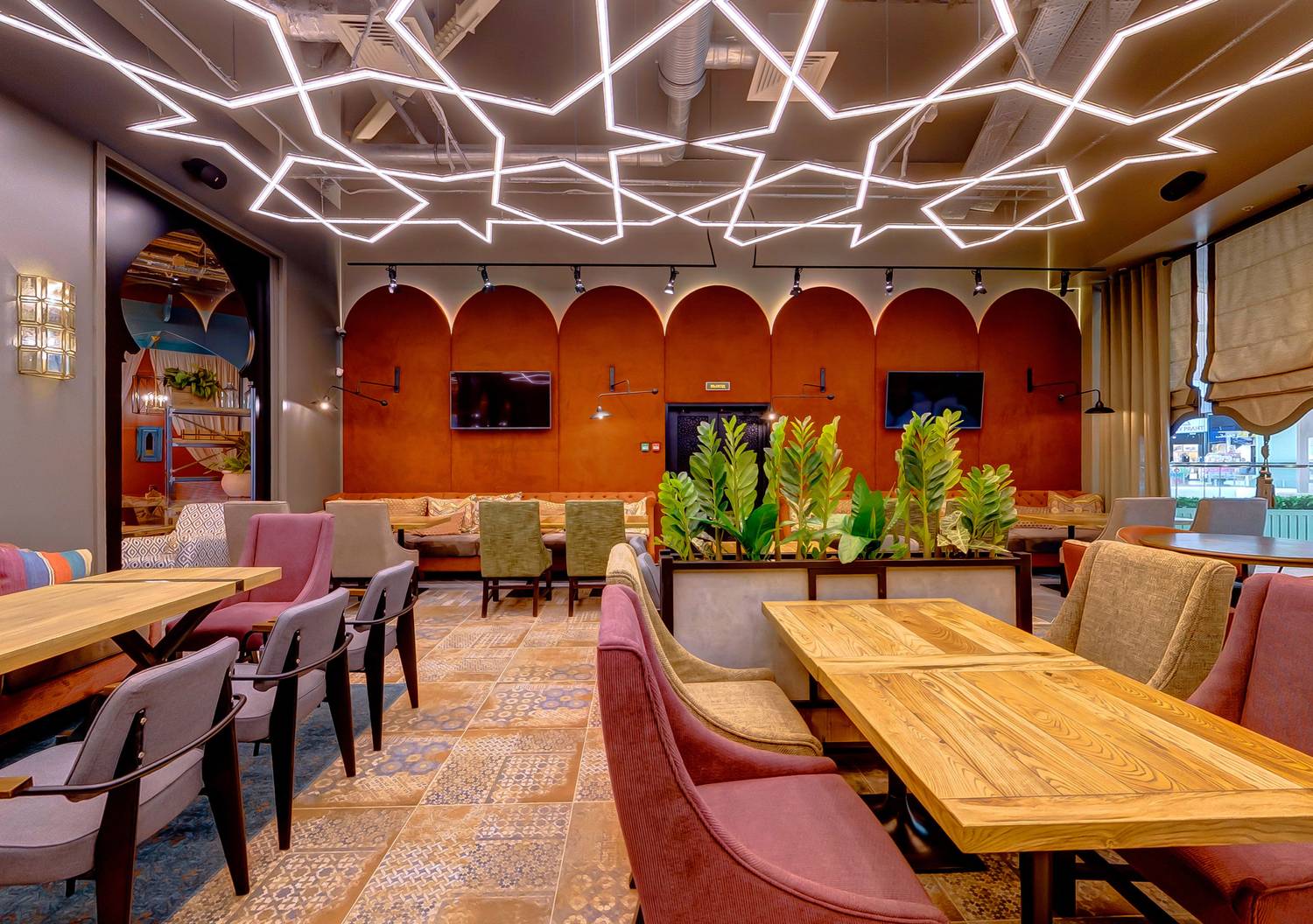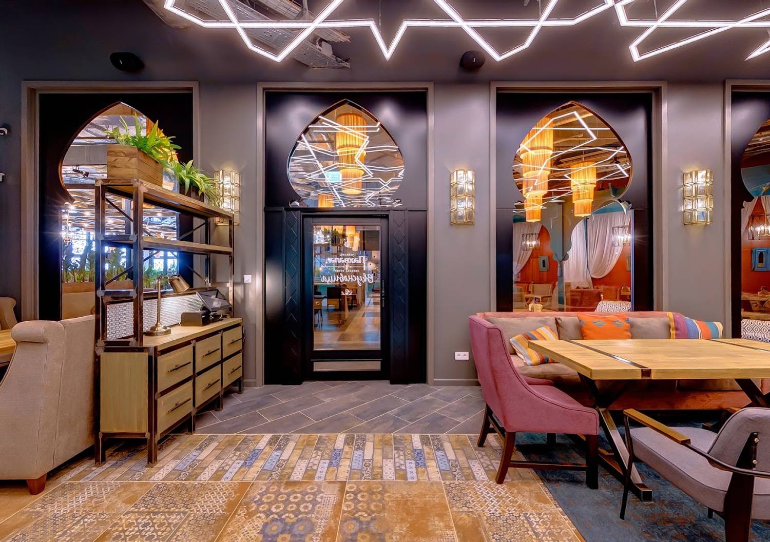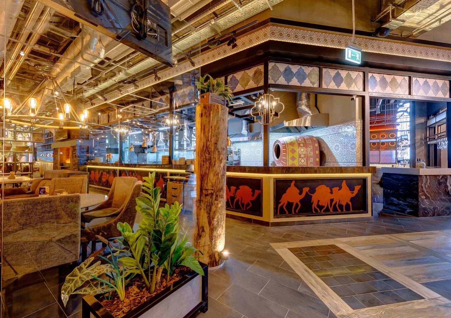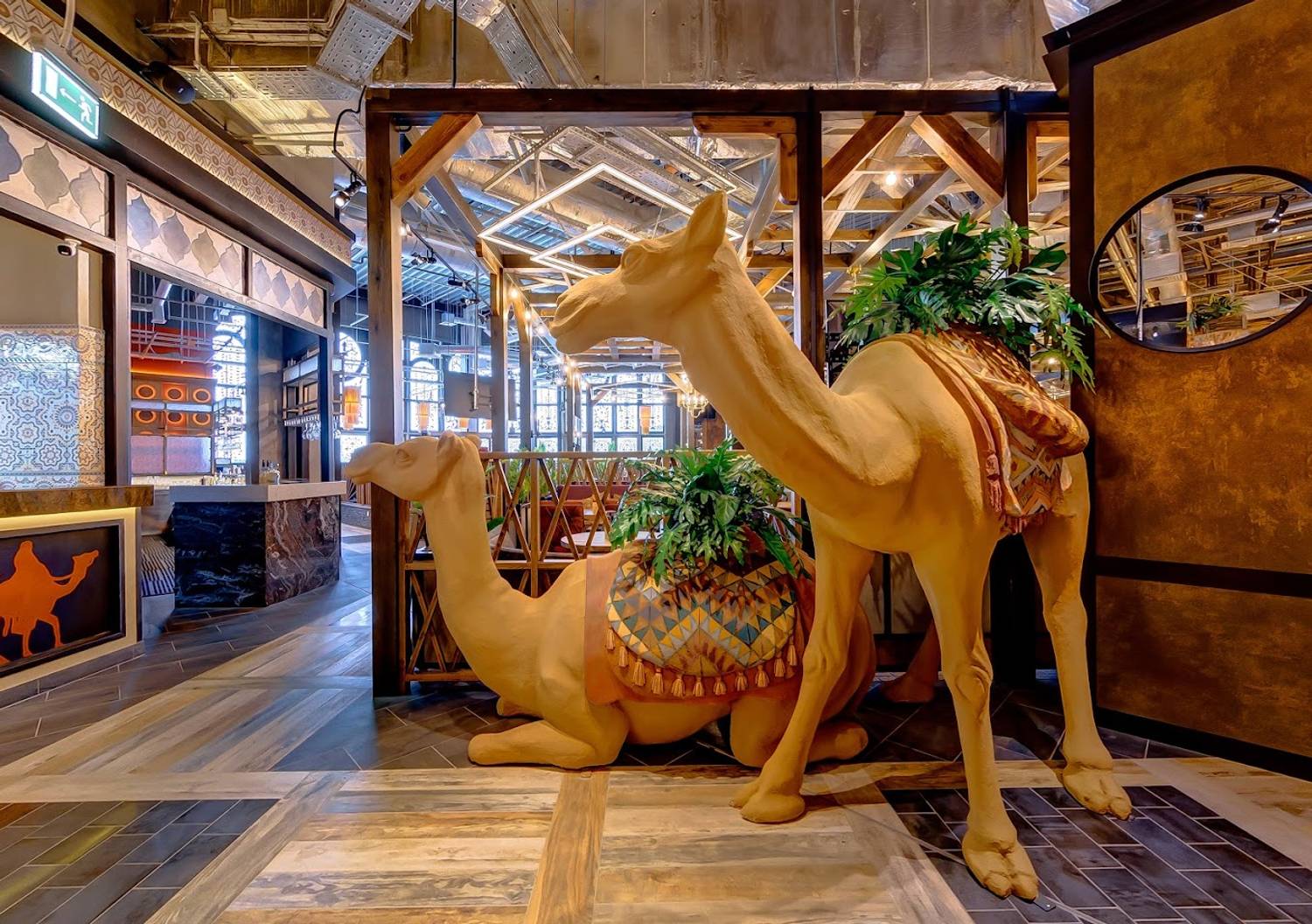 Атмосфера. Здесь несколько зон, включая банкетный зал, просторный танцпол и светлую современную детскую комнату. Интерьер гармонично сочетается с восточной и сербской сдержанностью: глиняные кувшины на полках, диваны с цветочными украшениями и фигурами верблюдов. Для торжественных мероприятий есть профессиональное звуковое и световое оборудование, сцена и танцпол.
