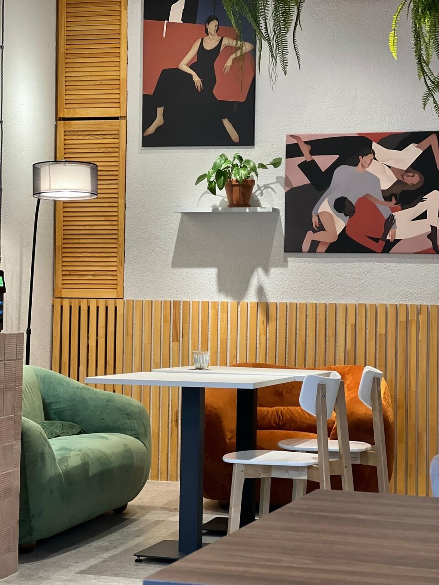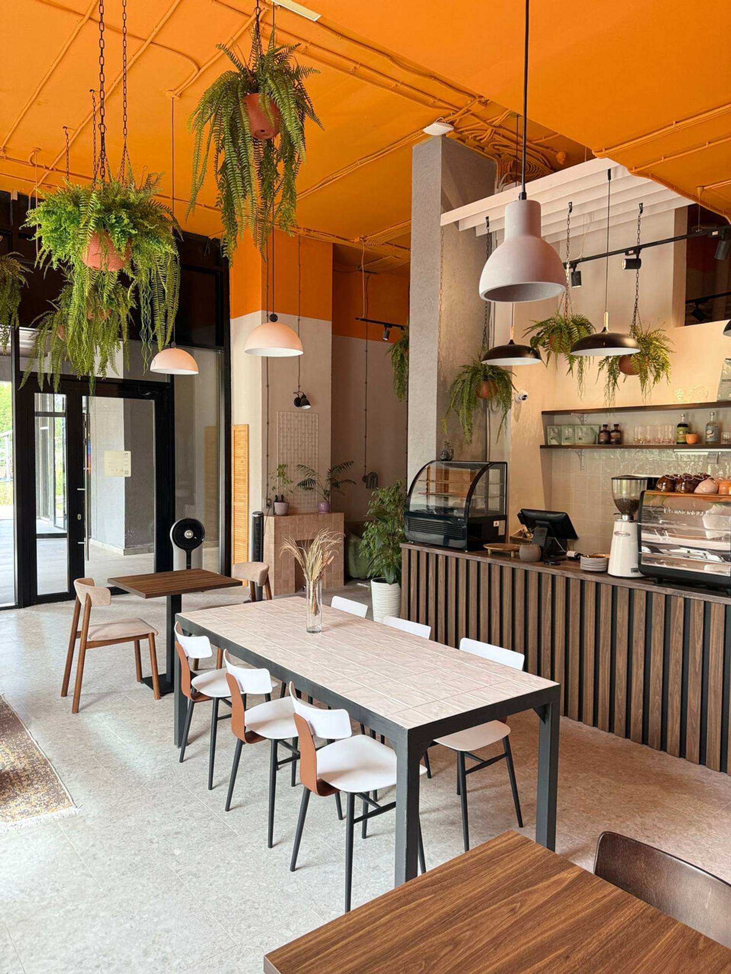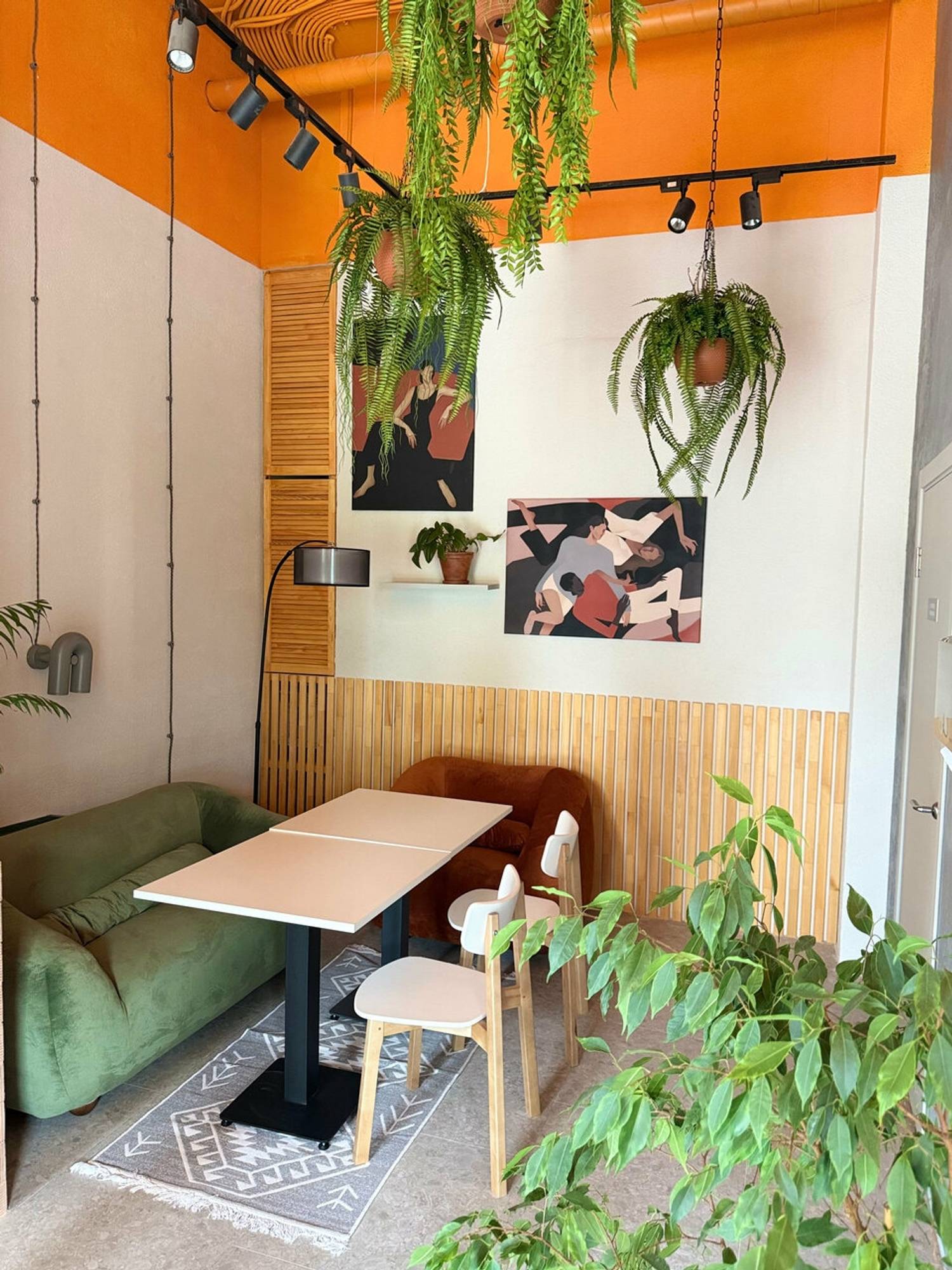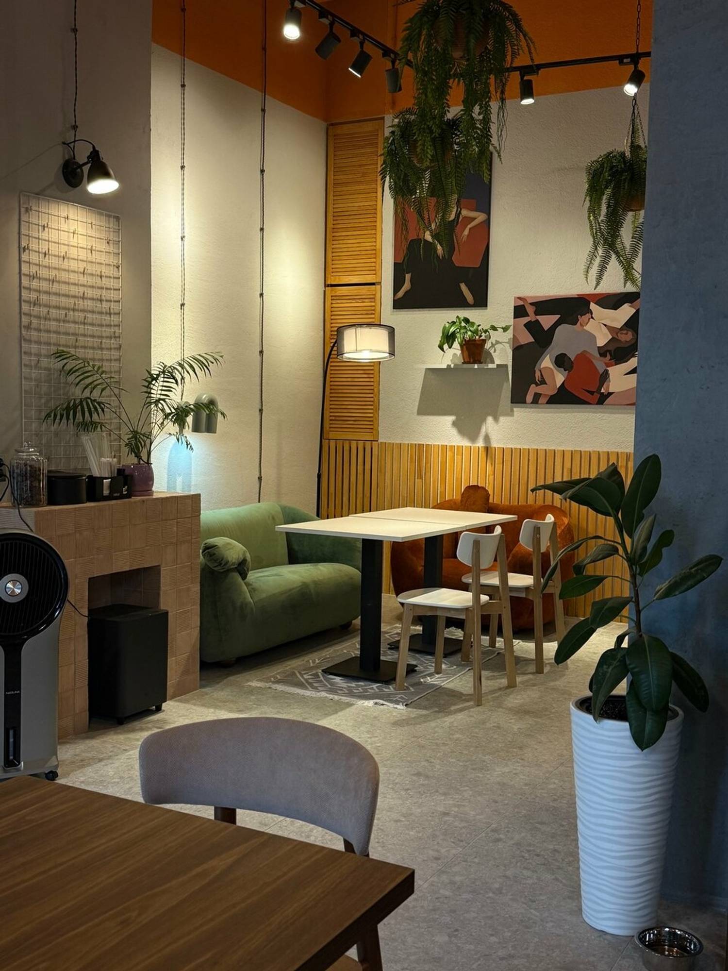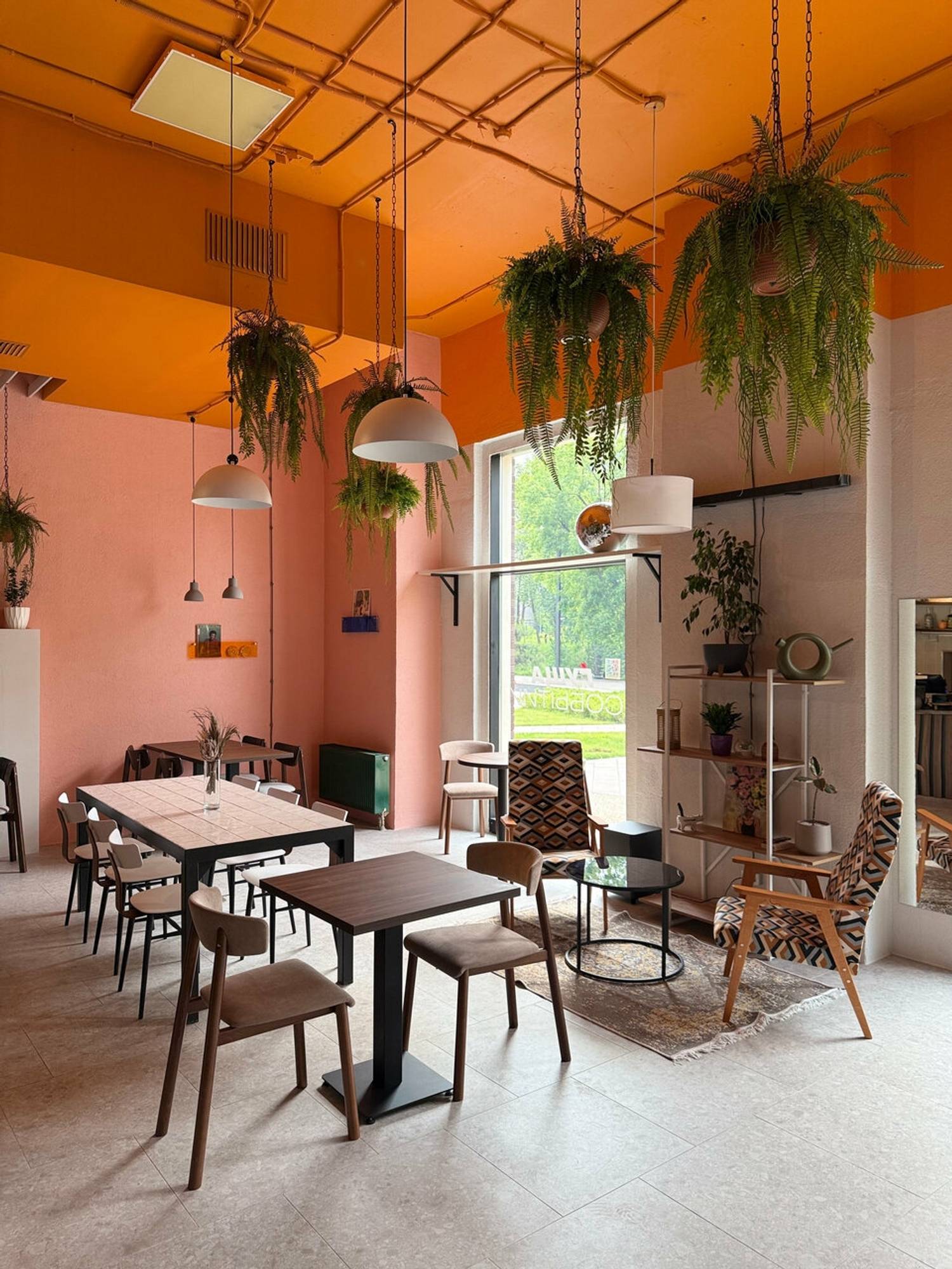 Атмосфера. Пространство напоминает светлую и жизнерадостную гостиную. Интерьер с панорамными окнами, ярким оранжевым потолком, розовыми стенами и зеленой мебелью в окружении растений создает теплую и творческую атмосферу. Винтажные кресла, мягкие диваны и дизайнерские детали располагают к долгим посиделкам. По выходным здесь проходят тематические мероприятия: например, музыкальные вечера и игры.