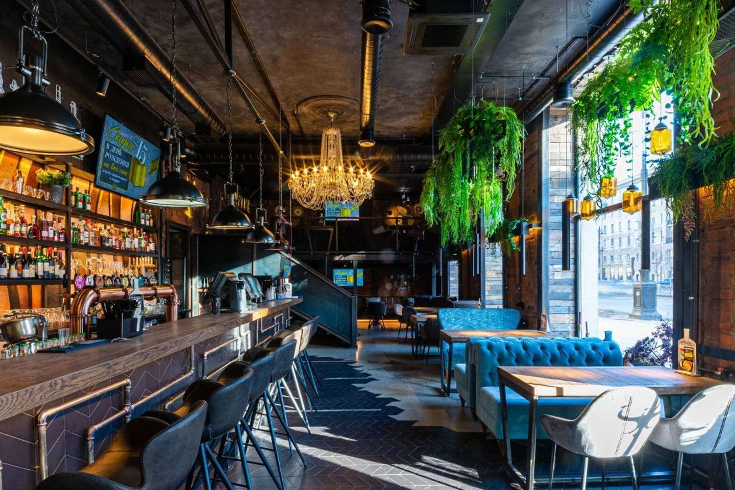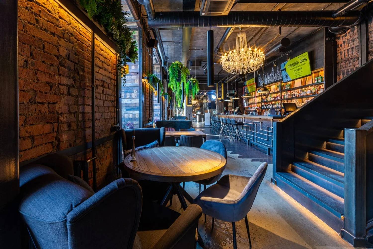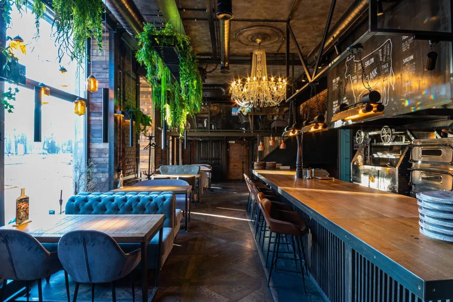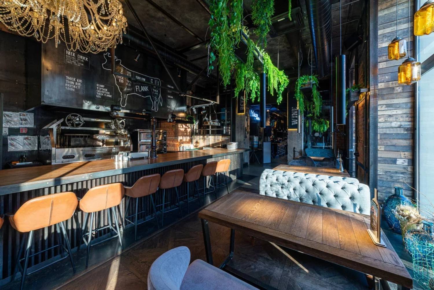 Атмосфера. Пространство ресторана, оформленное в стиле двухуровневого лофта, создает одновременно брутальную и уютную среду. Натуральное дерево, бетон, металл и панорамные окна с видом на проспект сочетаются с мягкой мебелью, массивными люстрами и живыми растениями. Центральным элементом зала является открытый гриль, где готовят мясо и рыбу. Ресторан адаптирован для разных сценариев: здесь есть детская комната с няней по расписанию, плазменные панели для спортивных трансляций, а по выходным играет живая музыка. Летом работает терраса.