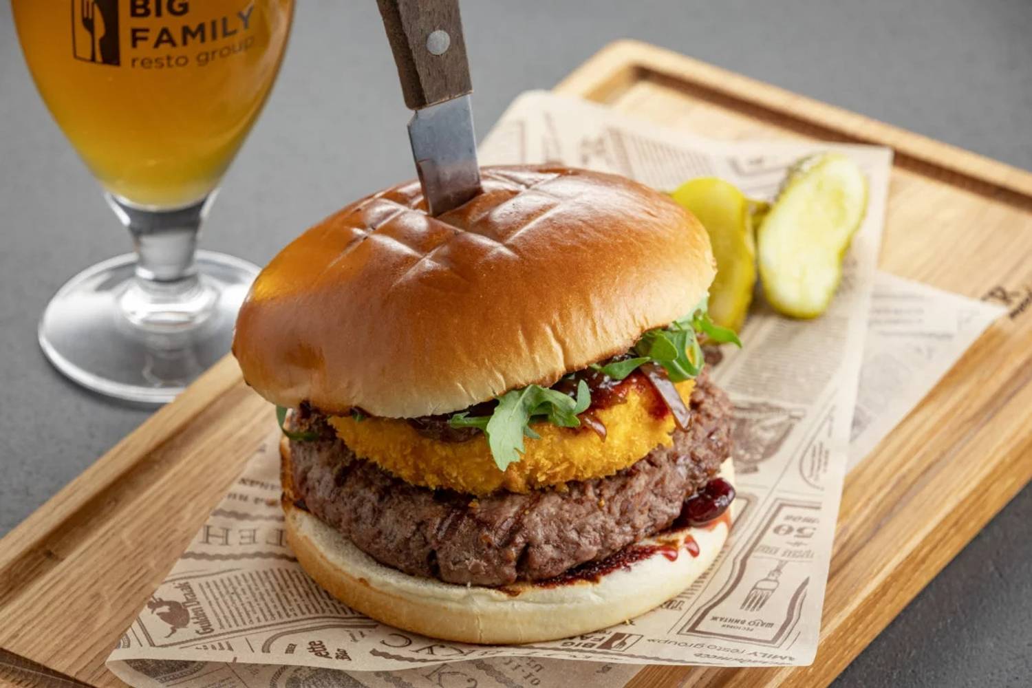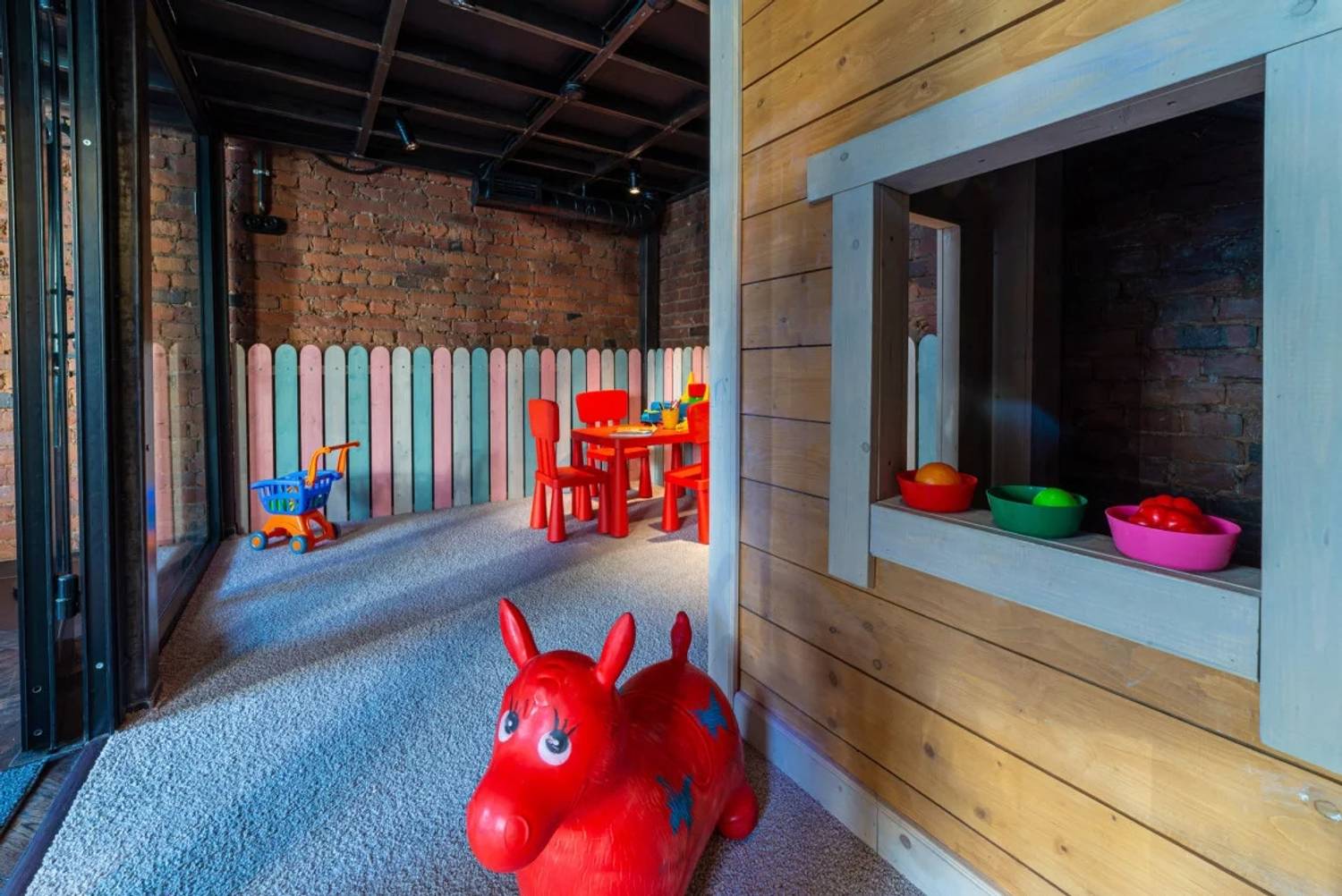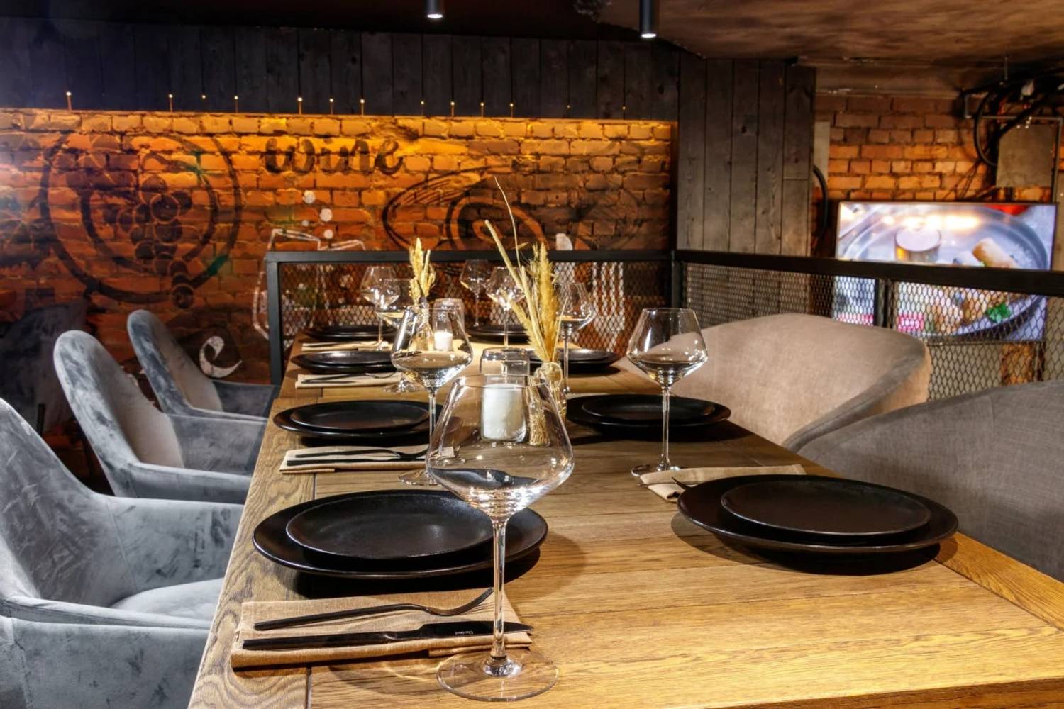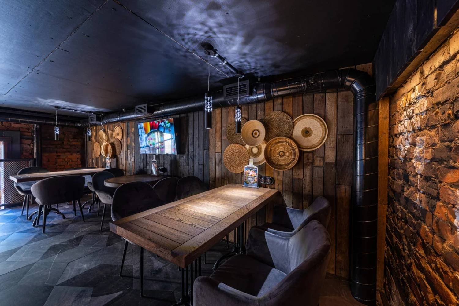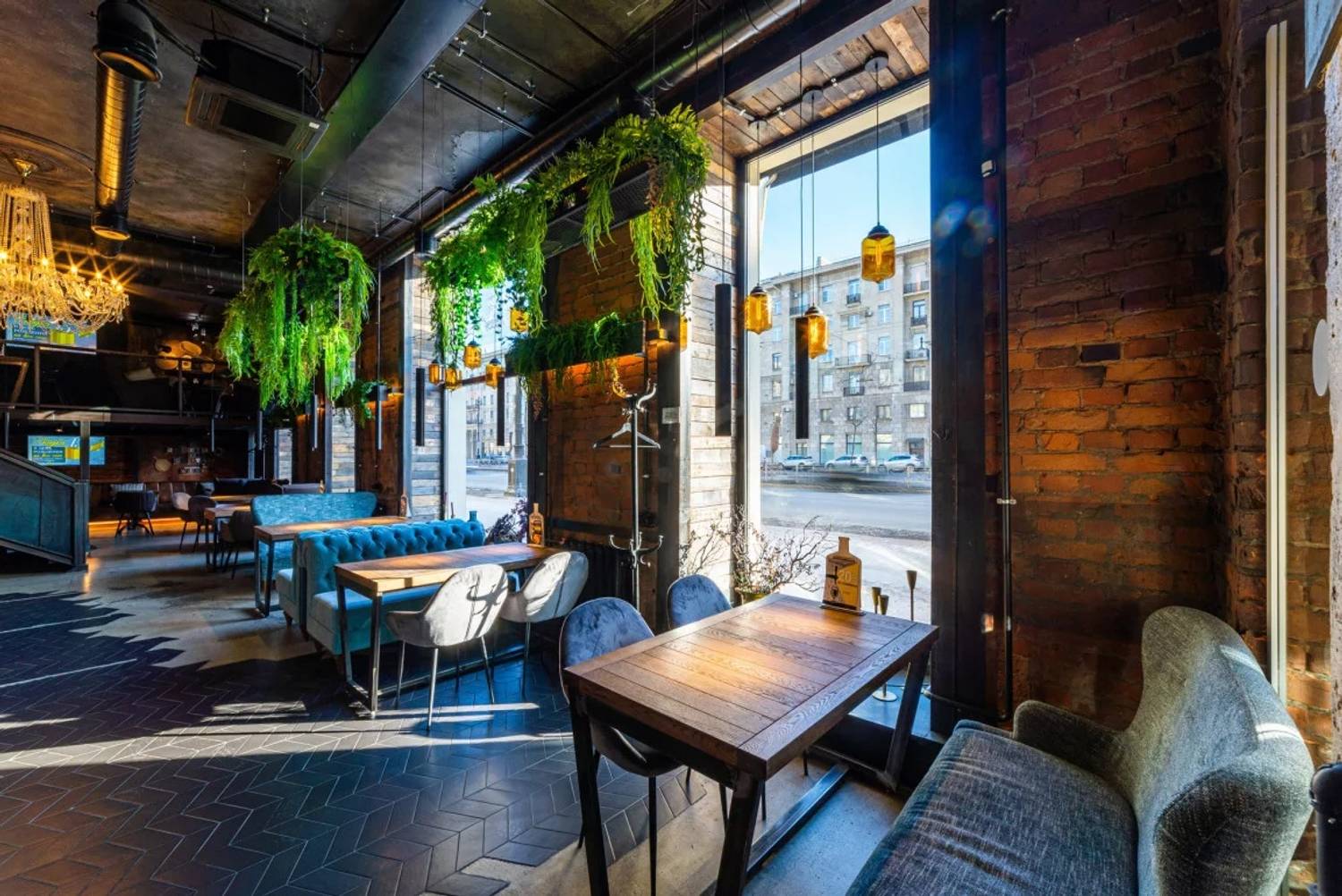 Атмосфера. Пространство ресторана, оформленное в стиле двухуровневого лофта, создает одновременно брутальную и уютную среду. Натуральное дерево, бетон, металл и панорамные окна с видом на проспект сочетаются с мягкой мебелью, массивными люстрами и живыми растениями. Центральным элементом зала является открытый гриль, где готовят мясо и рыбу. Ресторан адаптирован для разных сценариев: здесь есть детская комната с няней по расписанию, плазменные панели для спортивных трансляций, а по выходным играет живая музыка. Летом работает терраса.