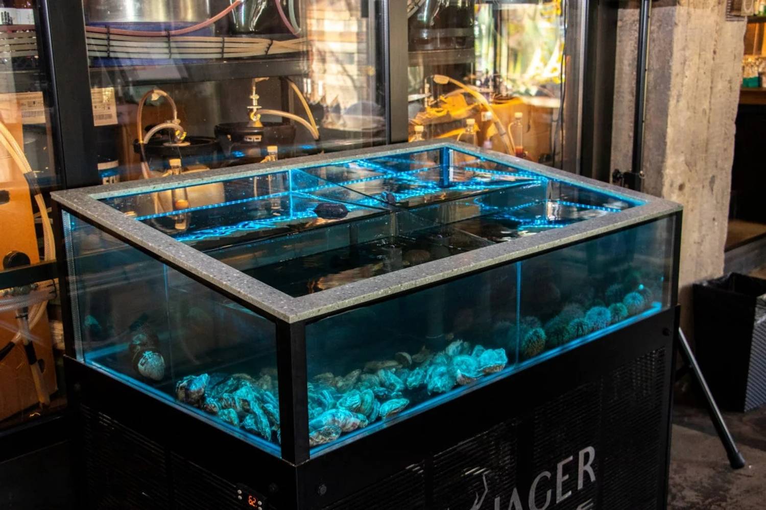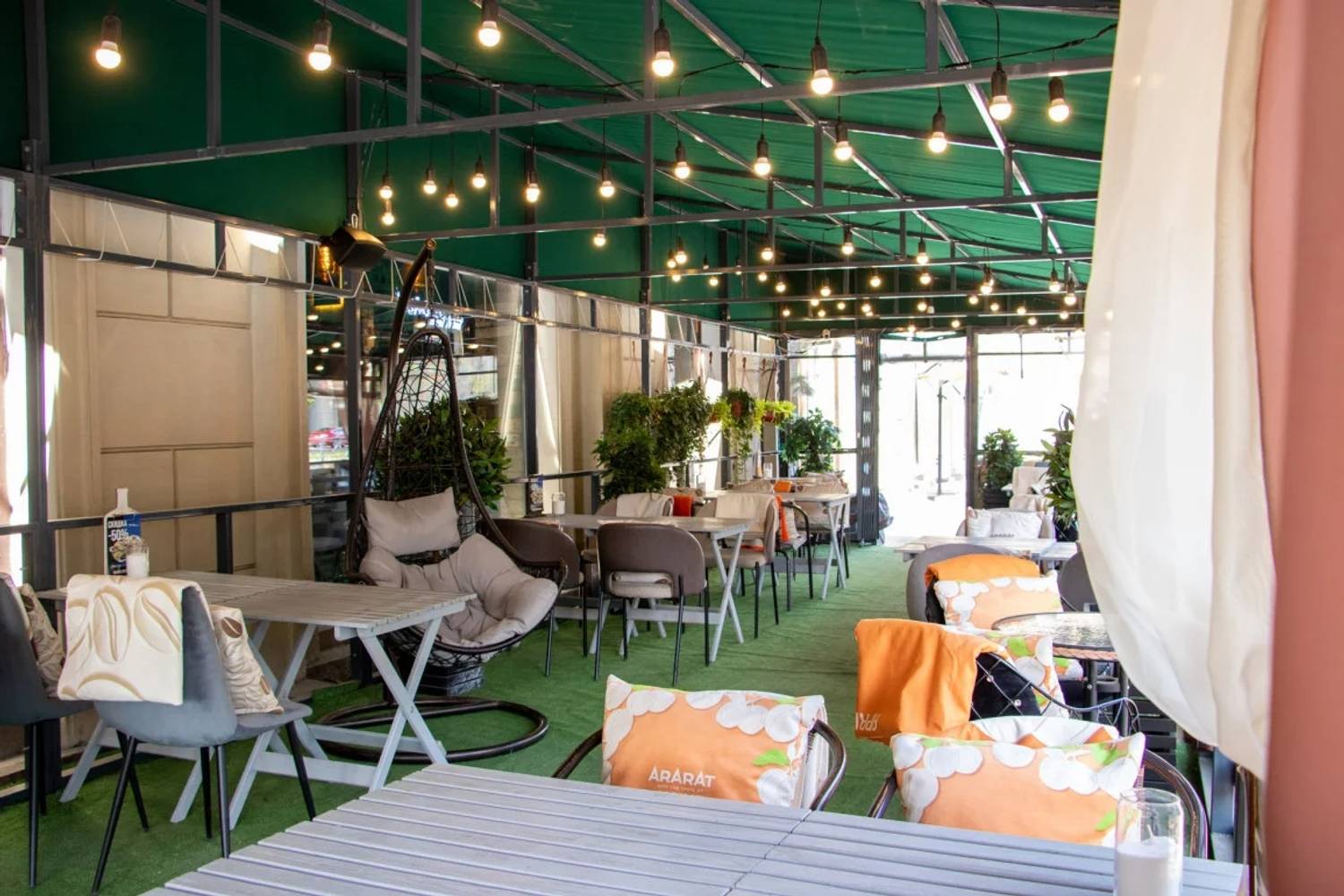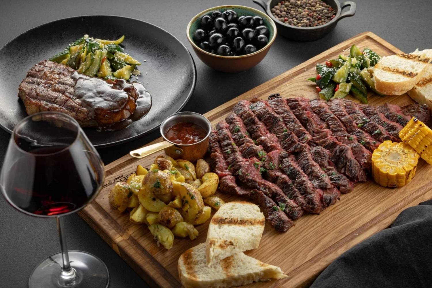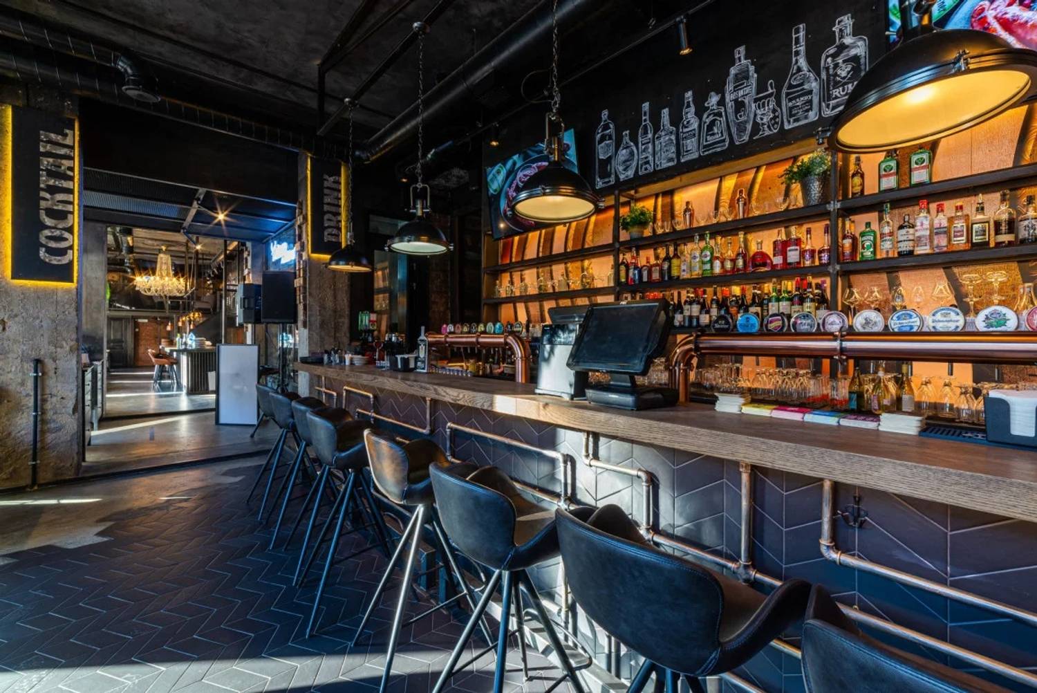 Атмосфера. Пространство ресторана, оформленное в стиле двухуровневого лофта, создает одновременно брутальную и уютную среду. Натуральное дерево, бетон, металл и панорамные окна с видом на проспект сочетаются с мягкой мебелью, массивными люстрами и живыми растениями. Центральным элементом зала является открытый гриль, где готовят мясо и рыбу. Ресторан адаптирован для разных сценариев: здесь есть детская комната с няней по расписанию, плазменные панели для спортивных трансляций, а по выходным играет живая музыка. Летом работает терраса.