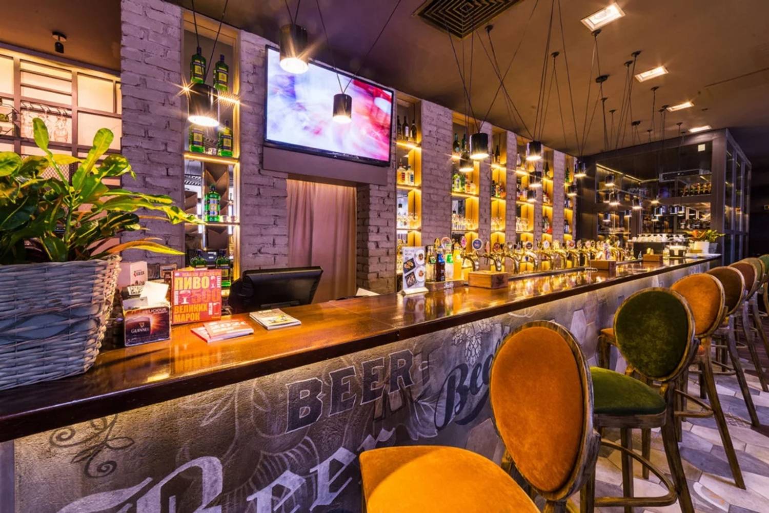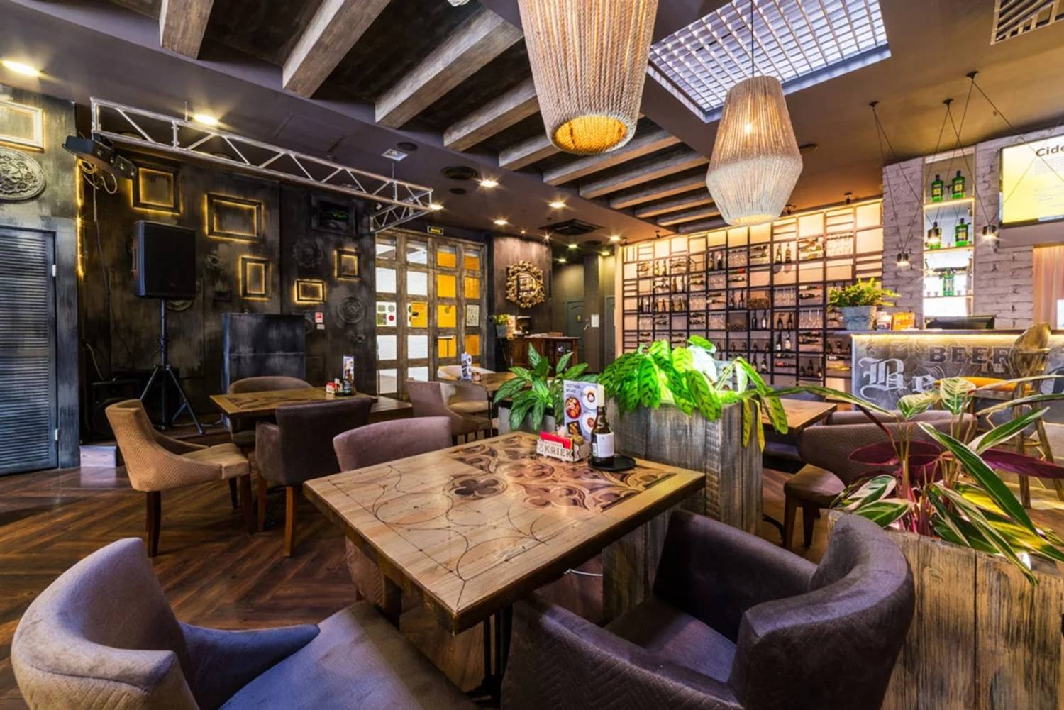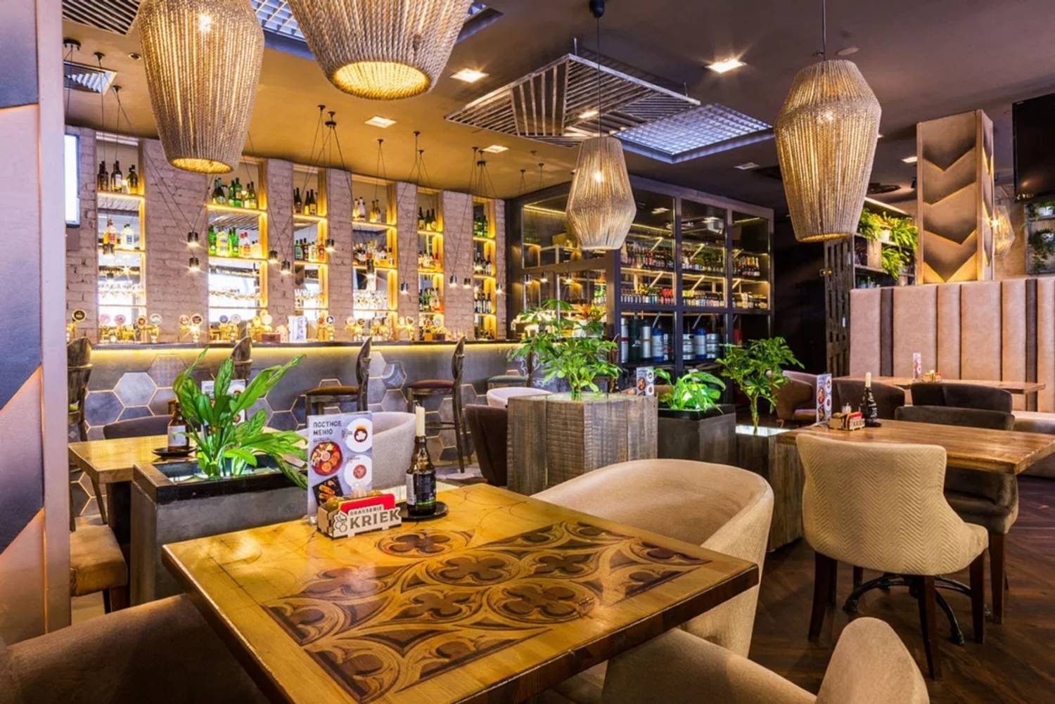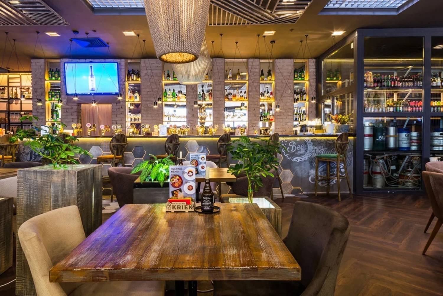 Атмосфера. Пространство создает ощущение современности и уюта. Интерьер в стиле лофт со светло-серой и бежевой палитрой, деревянными столами, мягкими диванами, живыми растениями и декоративными элементами в духе художника Брейгеля настраивает на спокойный лад. Двухуровневый зал с контактной барной стойкой, плазменными панелями для трансляций и летней террасой подходит для разных сценариев: от семейного обеда в детской комнате с няней до банкетов или встречи друзей за бокалом крафтового пива.