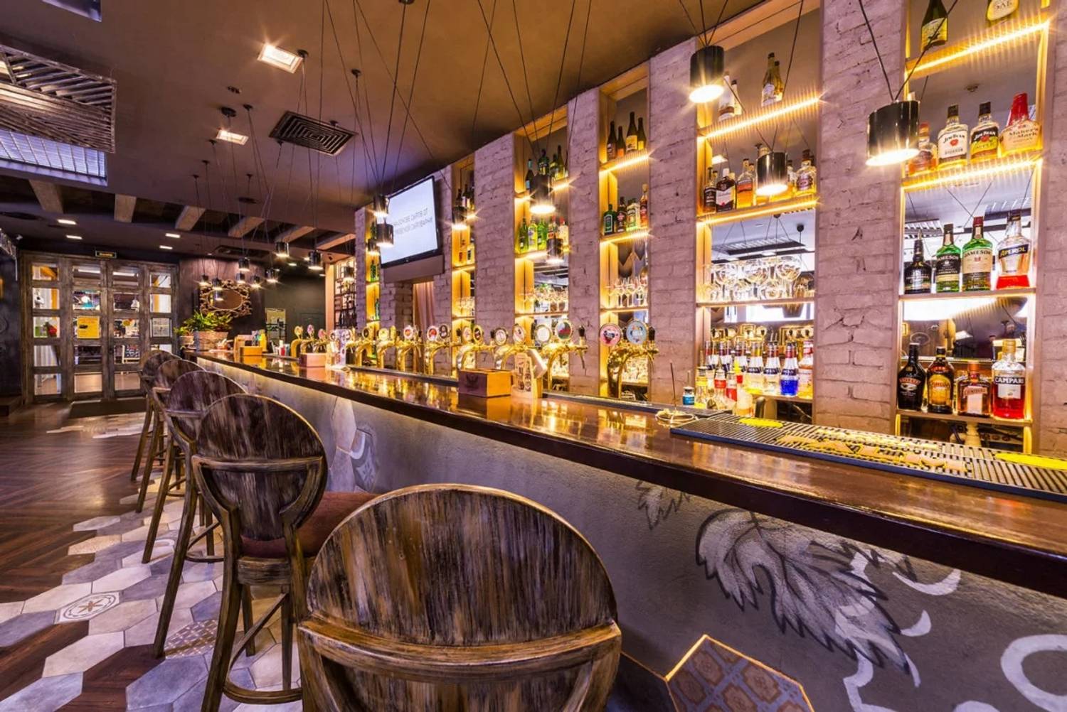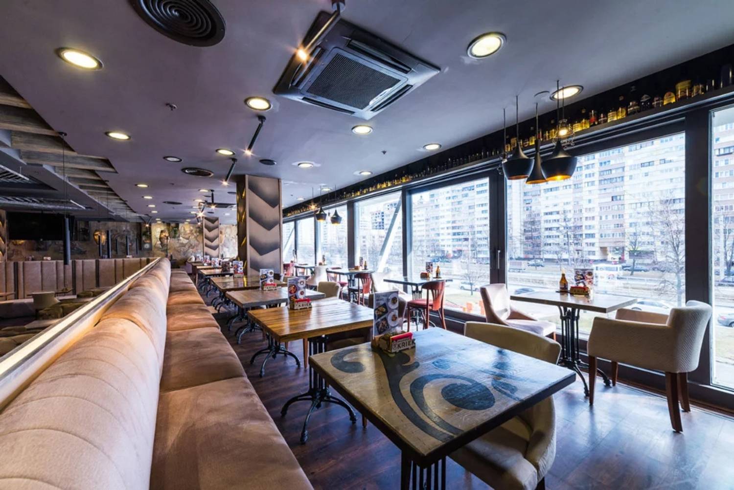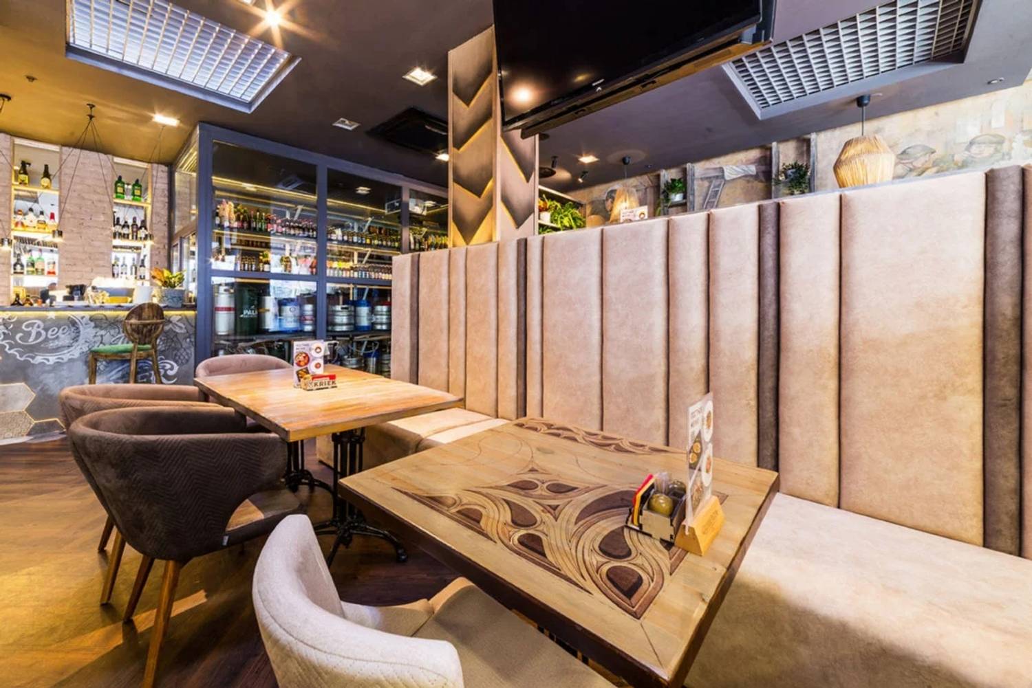 Атмосфера. Пространство создает ощущение современности и уюта. Интерьер в стиле лофт со светло-серой и бежевой палитрой, деревянными столами, мягкими диванами, живыми растениями и декоративными элементами в духе художника Брейгеля настраивает на спокойный лад. Двухуровневый зал с контактной барной стойкой, плазменными панелями для трансляций и летней террасой подходит для разных сценариев: от семейного обеда в детской комнате с няней до банкетов или встречи друзей за бокалом крафтового пива.