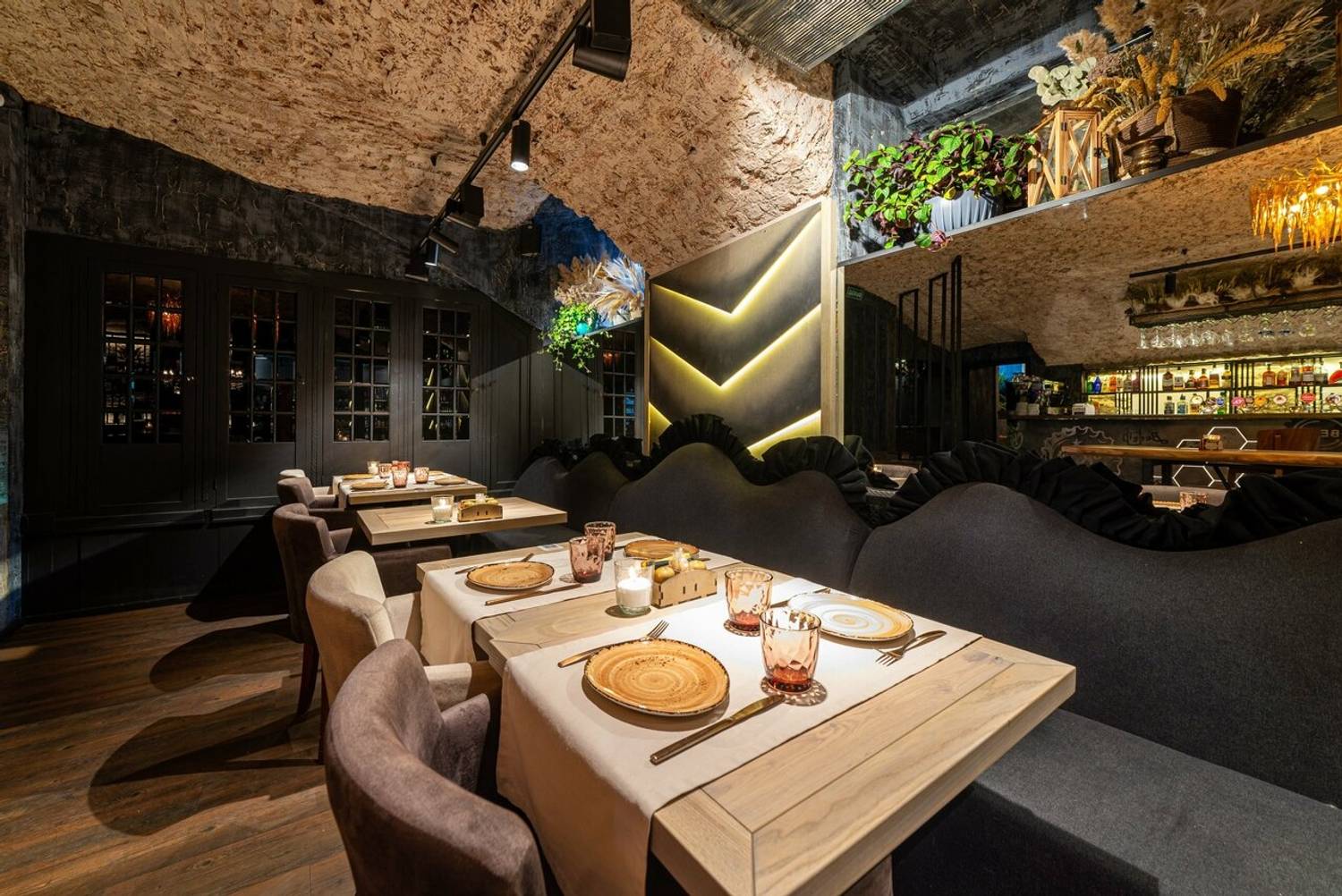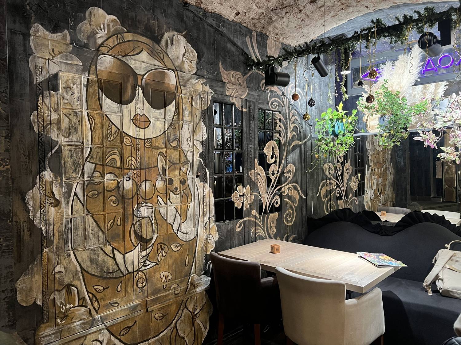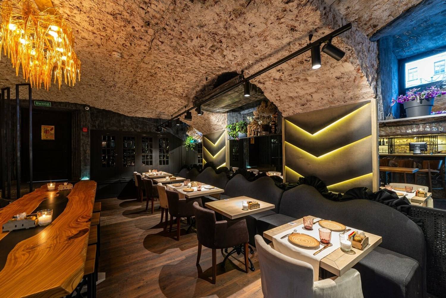 Атмосфера. Интерьер выполнен в стиле эклектики с элементами русского фольклора, создавая современную и в то же время уютную обстановку. Пространство гармонично сочетает новые тенденции с национальными мотивами, а главным украшением зала становится красивый стол из слэба и изображение матрешки на стене. Эта обстановка настраивает как на неспешную дегустацию, так и на дружеские встречи в самом сердце Петербурга.