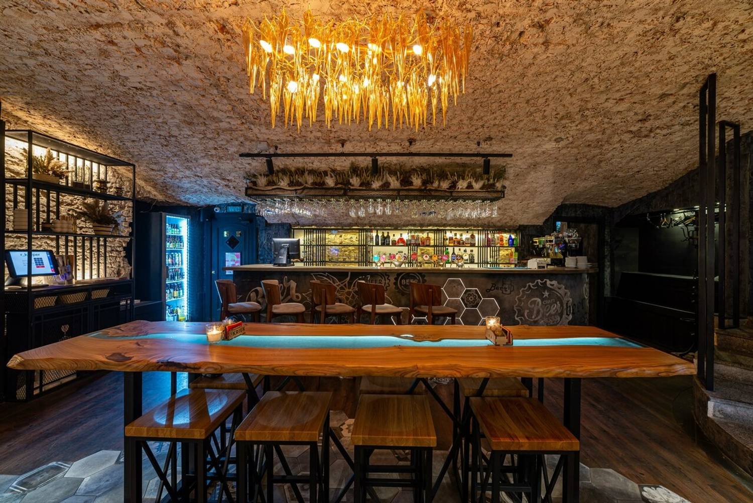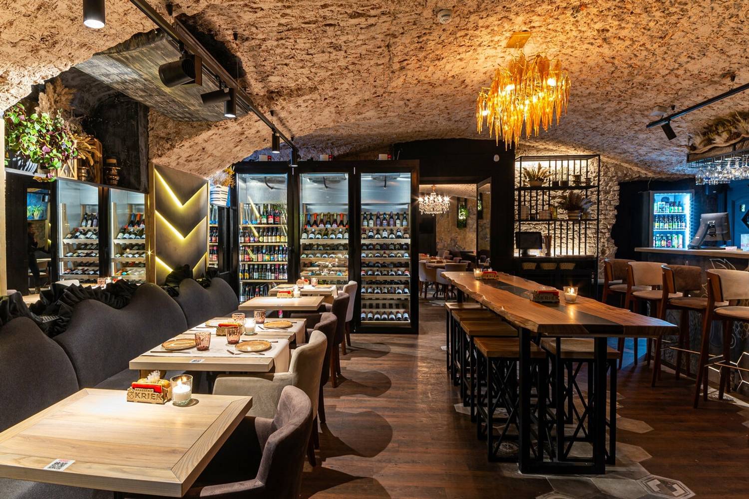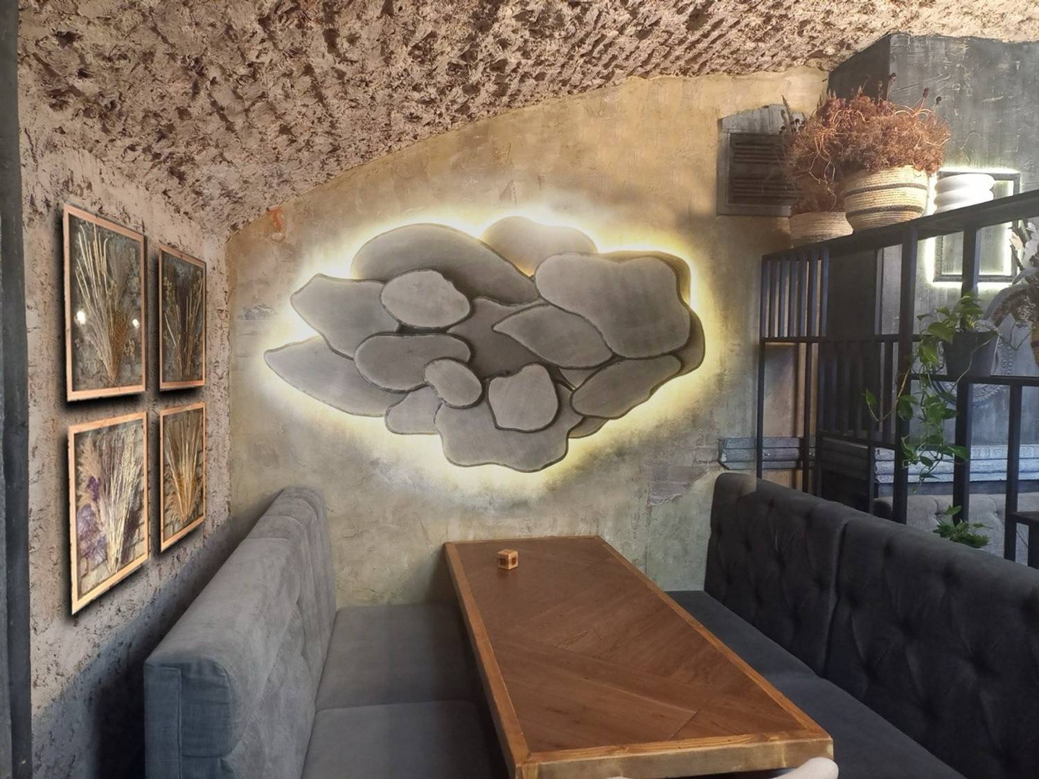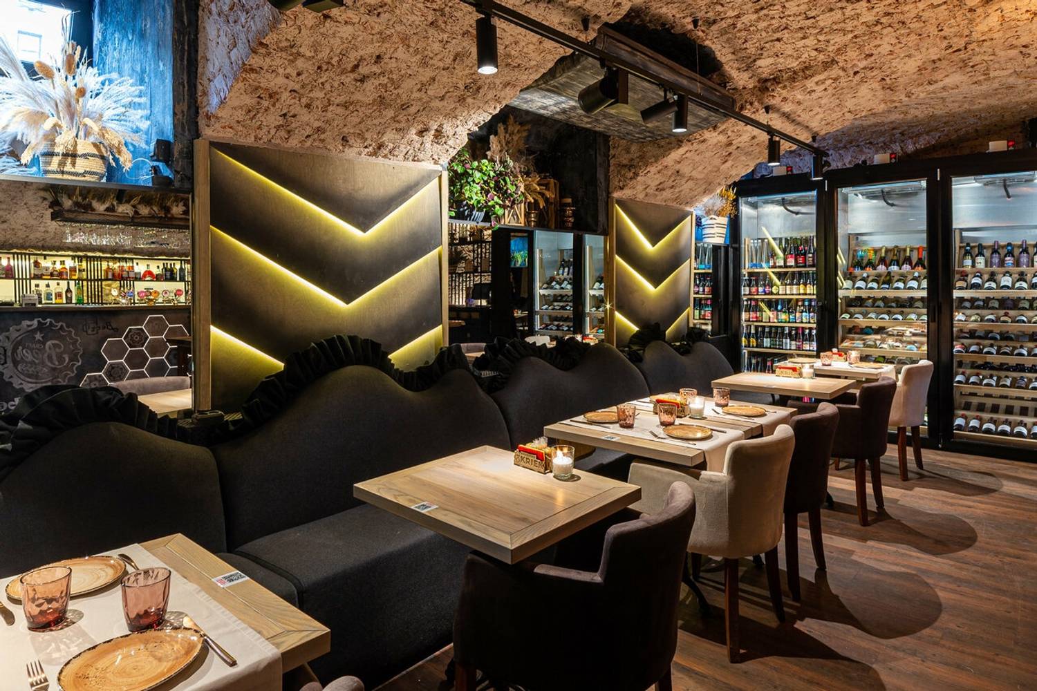 Атмосфера. Интерьер выполнен в стиле эклектики с элементами русского фольклора, создавая современную и в то же время уютную обстановку. Пространство гармонично сочетает новые тенденции с национальными мотивами, а главным украшением зала становится красивый стол из слэба и изображение матрешки на стене. Эта обстановка настраивает как на неспешную дегустацию, так и на дружеские встречи в самом сердце Петербурга.