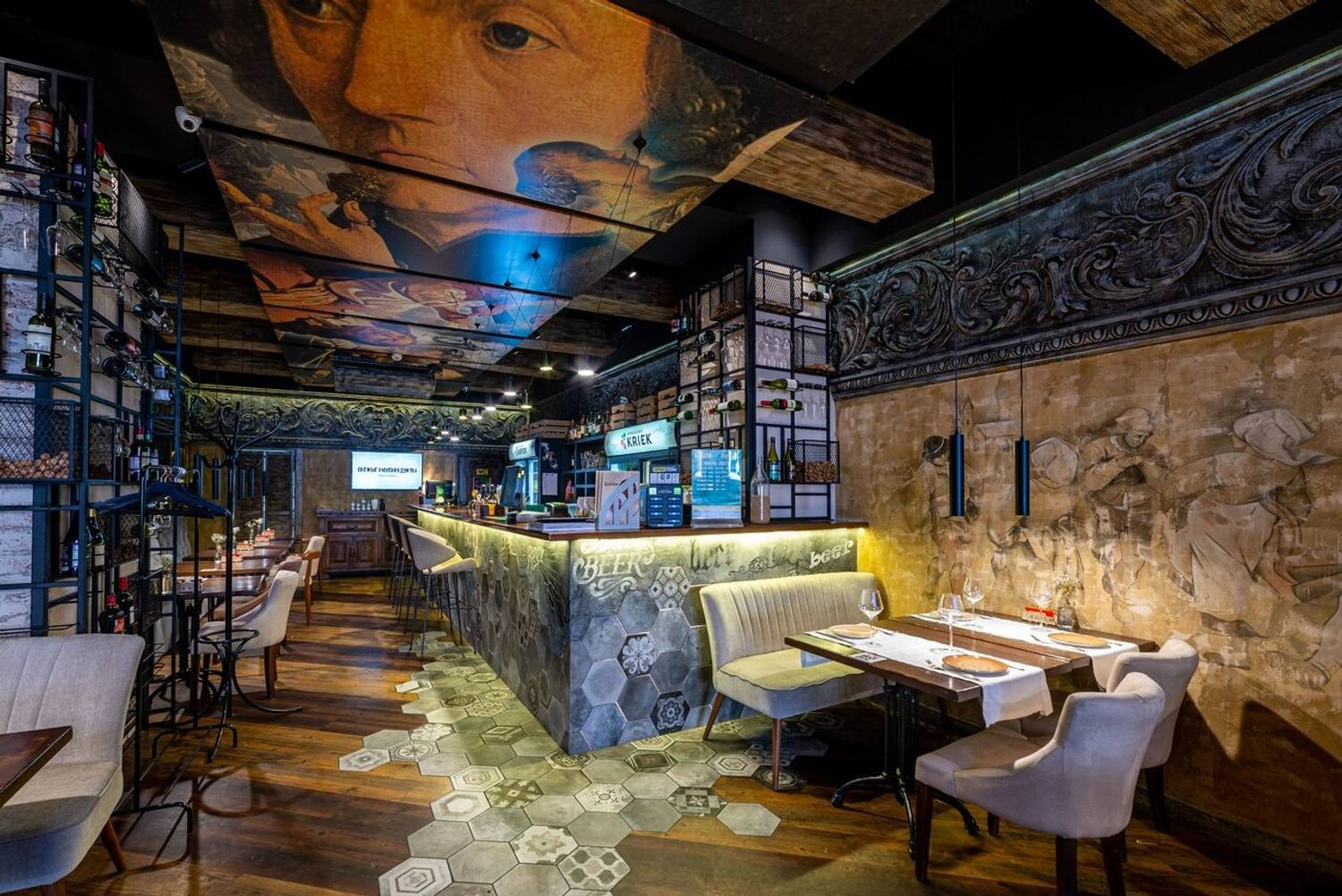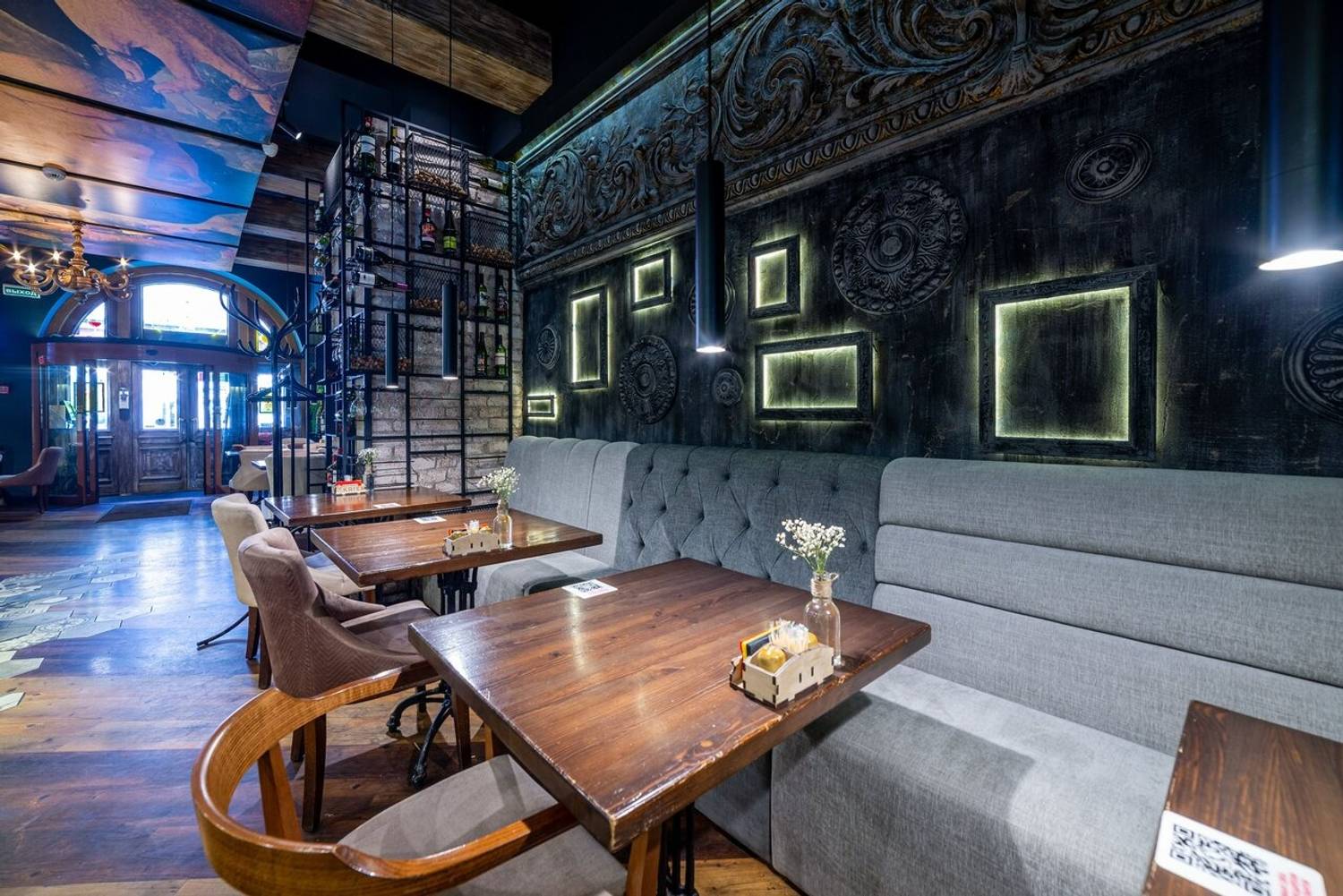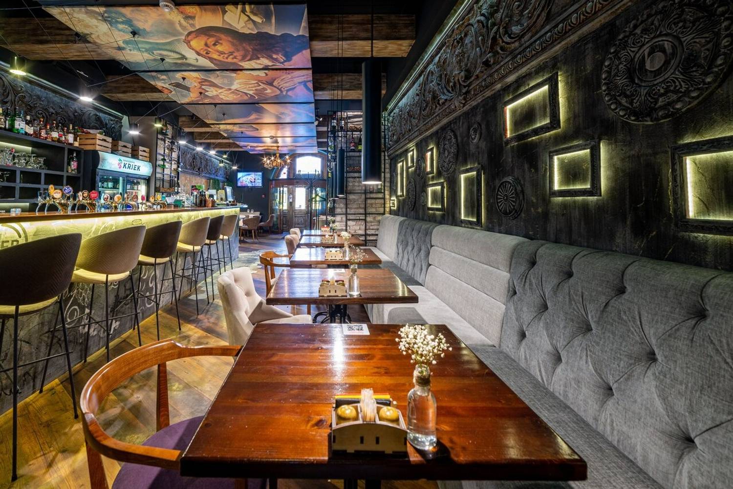 Атмосфера. Интерьер воссоздает антураж настоящей европейской брассерии с винтажными люстрами, лепными вставками, античными портретами на потолках и контрастным освещением, которое подсвечивает рамы на серых стенах. Пространство рассчитано на большое число гостей, включая контактные барные стойки, и создает эффект солидного, шумного и гостеприимного заведения. Летом атмосферу дополняет открытая терраса с видом на оживленные проспекты.