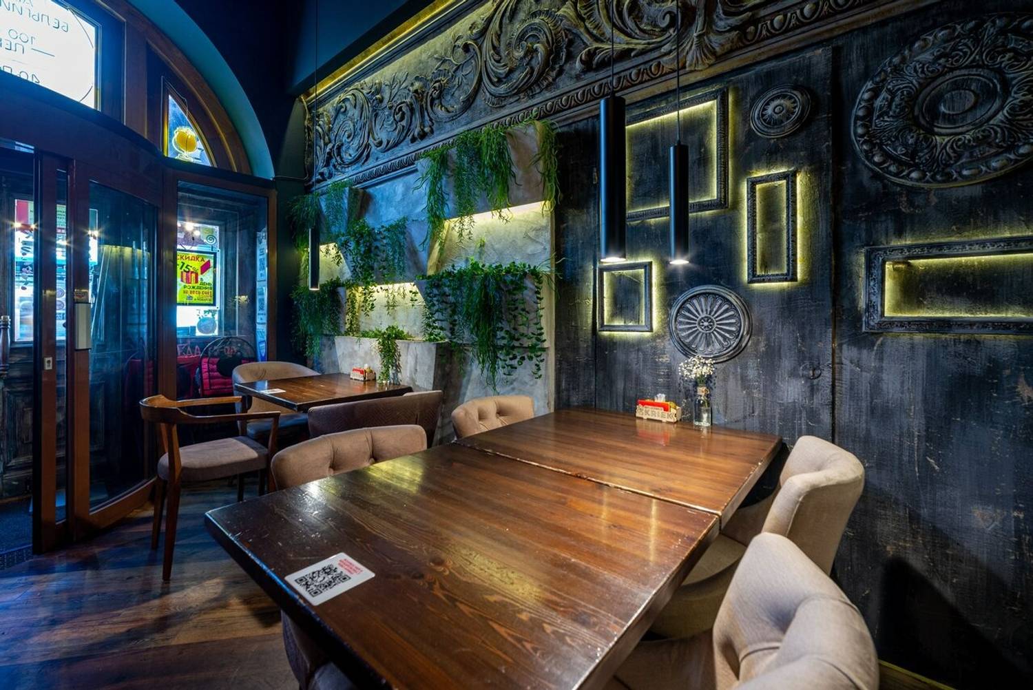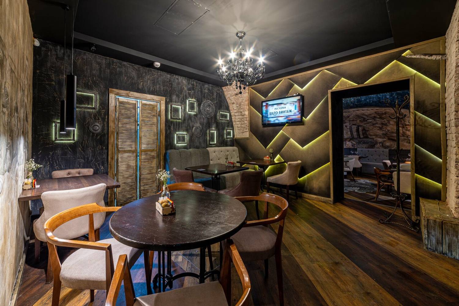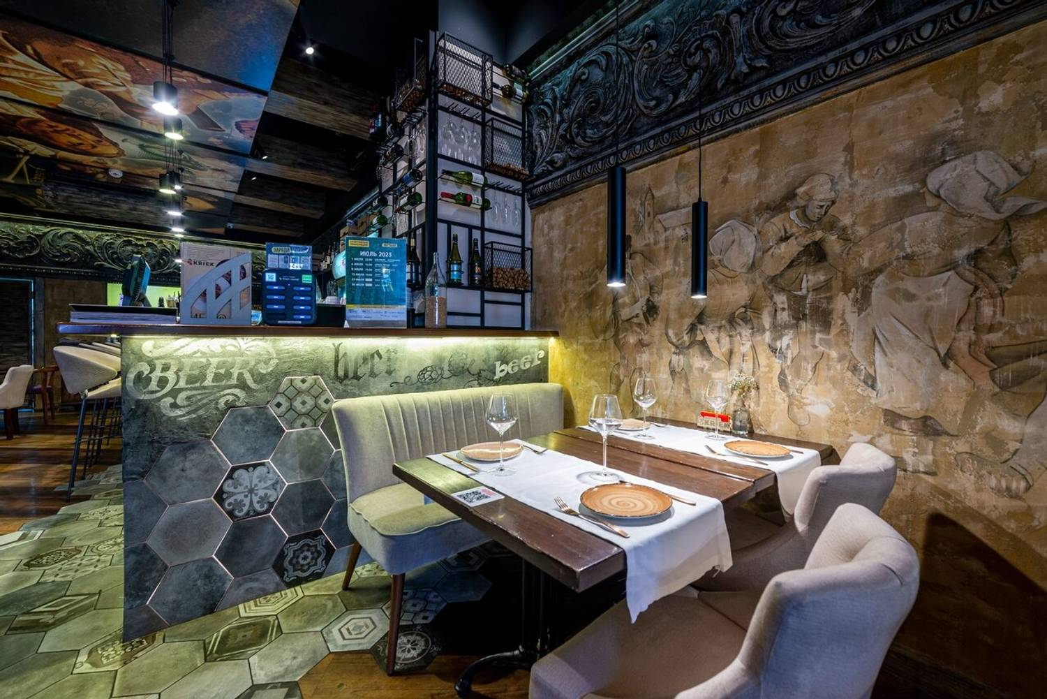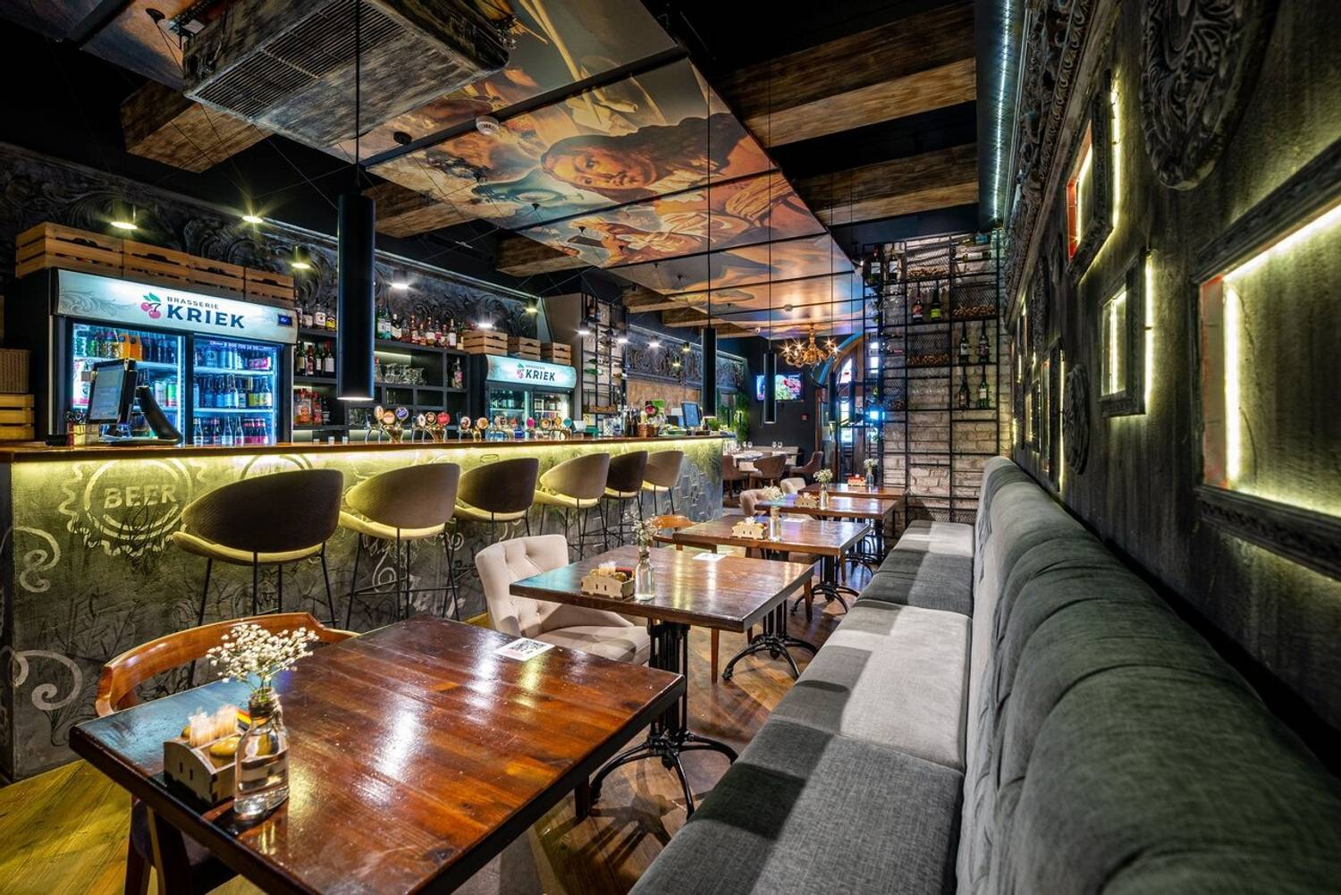 Атмосфера. Интерьер воссоздает антураж настоящей европейской брассерии с винтажными люстрами, лепными вставками, античными портретами на потолках и контрастным освещением, которое подсвечивает рамы на серых стенах. Пространство рассчитано на большое число гостей, включая контактные барные стойки, и создает эффект солидного, шумного и гостеприимного заведения. Летом атмосферу дополняет открытая терраса с видом на оживленные проспекты.